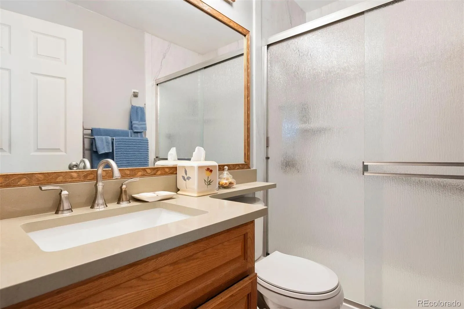 Upstairs, you’ll find a spacious primary bedroom complete with a walk-in closet. The second bedroom sits just adjacent, and both share a recently updated full bath showcasing faux-marble walls and elegant quartz countertops.