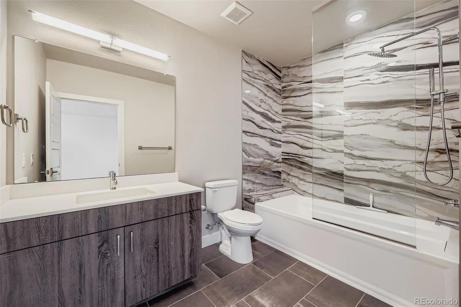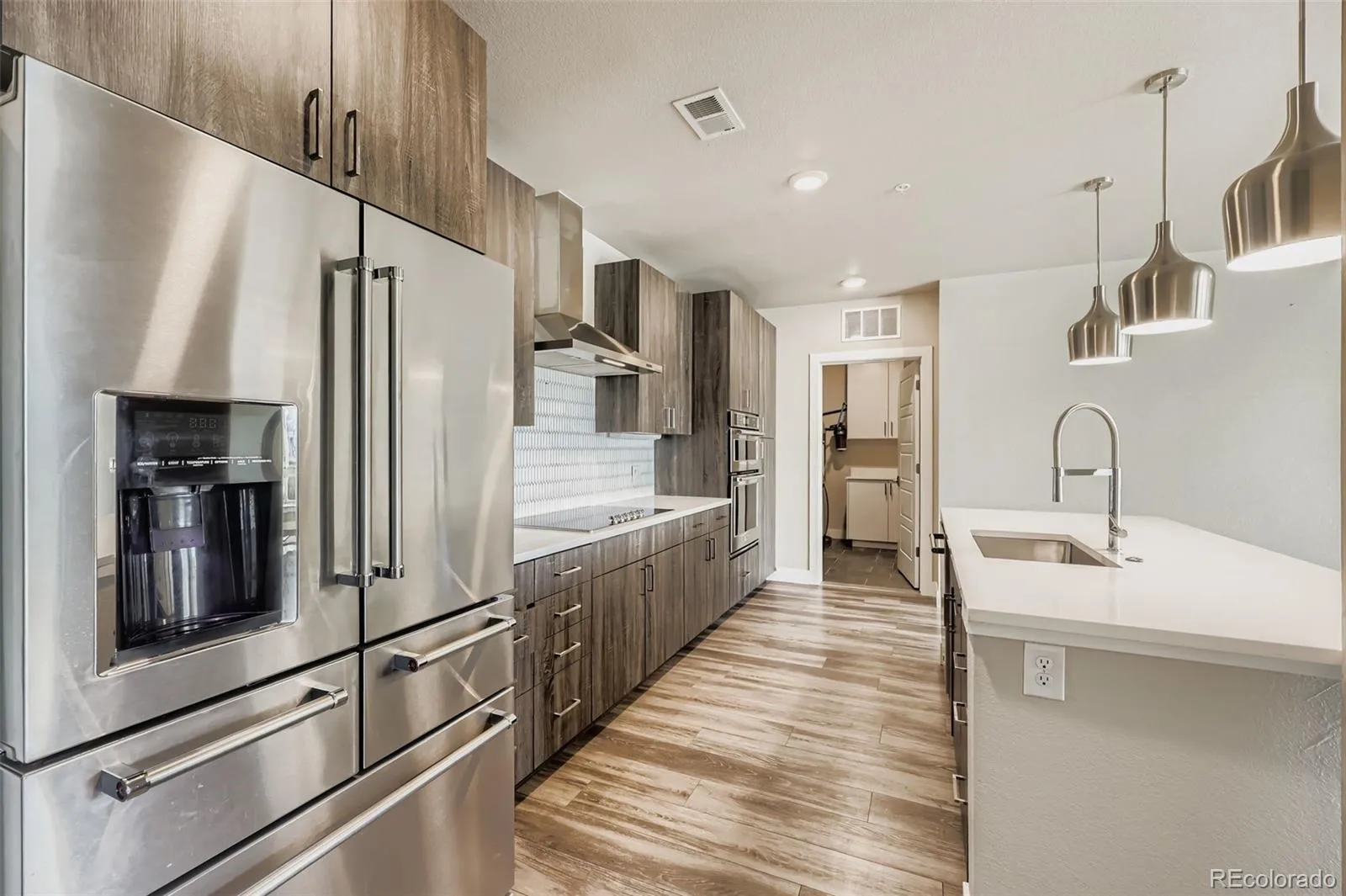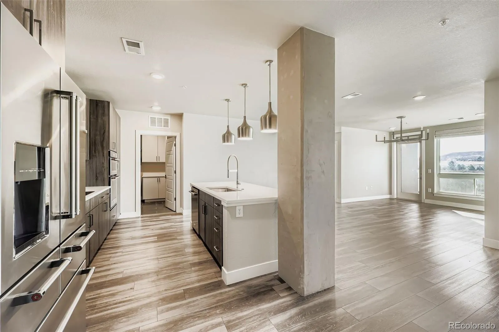 Quick Possession and Easy To Show! Gorgeous end unit with only one neighbor features a living room, kitchen, dining, 2 bedrooms, 2 baths, laundry and private covered balcony with spectacular views. Meticulously maintained – pride of ownership shines throughout. $25,000 in upgrades and improvements including a renovated second bathroom with extra large soaker tub, new tile surround, Euro glass, new fixtures, new lighting; additional lighting in unit including RH chandelier in living room, overhead lighting in both bedrooms; custom closets throughout; extra cabinets/shelving in laundry room; $4,000 KitchenAid refrigerator; Culligan water system; new bedroom carpeting; custom automated window coverings and more. Relax on the extra large covered, very private patio that showcases gorgeous mountain views. The storage unit (S-303) and two garage spaces (R-57 and R-58) are mere steps away from the unit. This is a highly sought-after unit in the very quiet, highly desirable Encore building. Located in the heart of downtown Castle Rock where restaurants, shopping and salons are right at your fingertips. In addition, there are countless outdoor activities such as hiking and biking but also beautiful concert venues and the Castle rock incline just to name a few. Building amenities include a state-of-the art fitness center, dog wash, dog park and golf/soccer simulator room. What more could you ask for? Other for sale units here are interior facing with no view and smaller balconies with no privacy. Don’t miss your opportunity. Welcome home!!!! This home also available for rent / lease @$3300/mo.