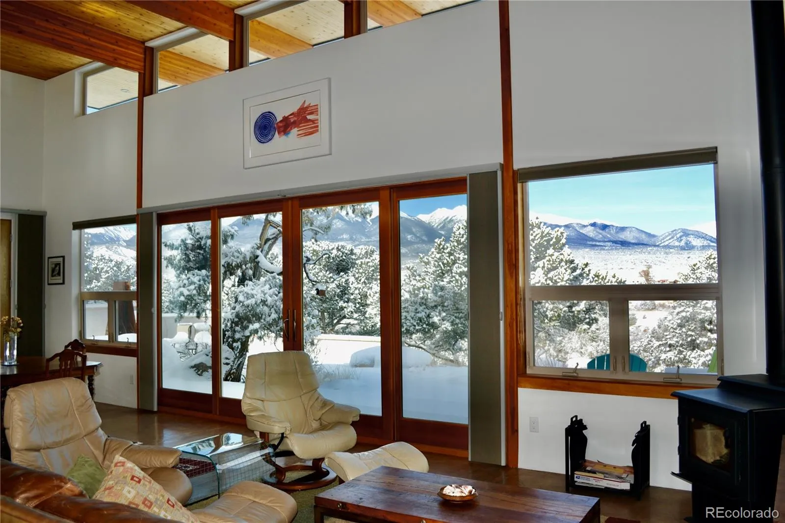 Arkansas River Frontage! Two hundred and seventy feet of it, with a beach, and a contemporary and meticulously maintained home. This highly energy efficient home leaves a small footprint with 1650 sf containing a main suite, 1 and 3/4 baths, as well as two additional bedrooms, one of which is currently used as an office. The living layout is open concept, with a large granite garnet encrusted island, well appointed kitchen, living room with sliding doors opening to the outdoor patio which features a gas fireplace and looks over the river and at the mountains. The home is heated with an in floor radiant system, and a supplemental solar system for heat and hot water . The detached 3 car garage and shop features 12′ doors, has an EV charging station, a bathroom, passive solar heat ,as well as a backup power supply . Did we mention mountain views all around?