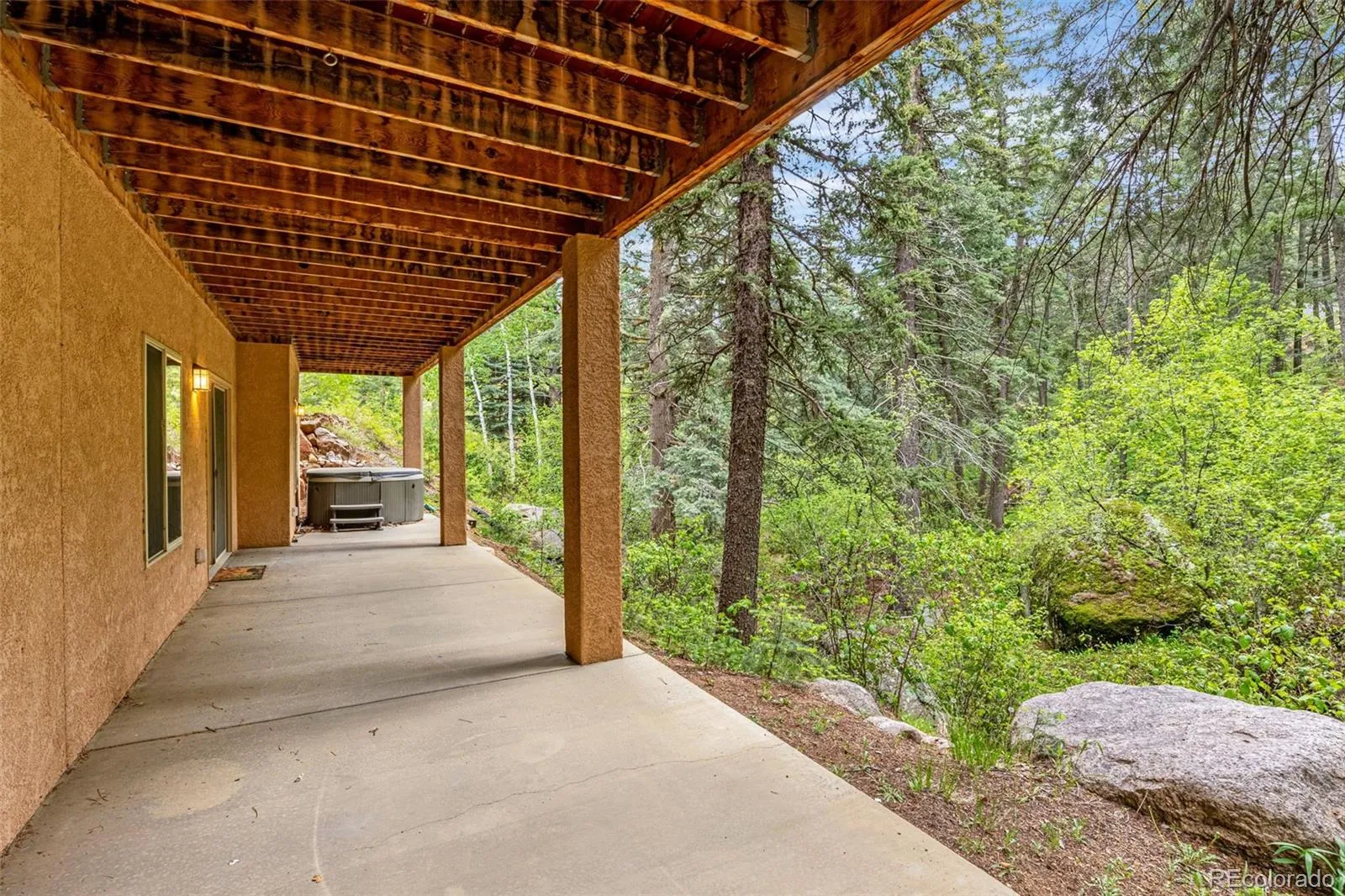 The living room has a striking stone fireplace and an entire wall of glass offering views of your own private mountain oasis. The master retreat comes complete with five-piece bath— jetted tub, dual walk-in closets, and private access to the full-length covered deck overlooking the forested landscape. Also on the main level: a second bedroom ideal for a guest room or home office, a full bath, and a well-appointed laundry room—making main-level living effortless.