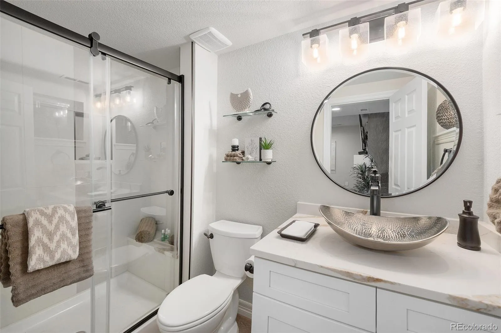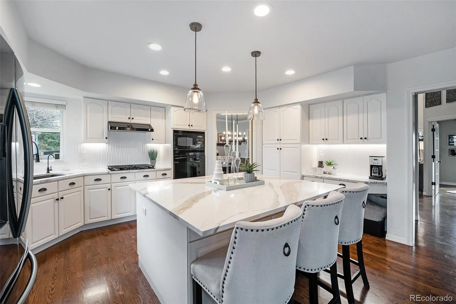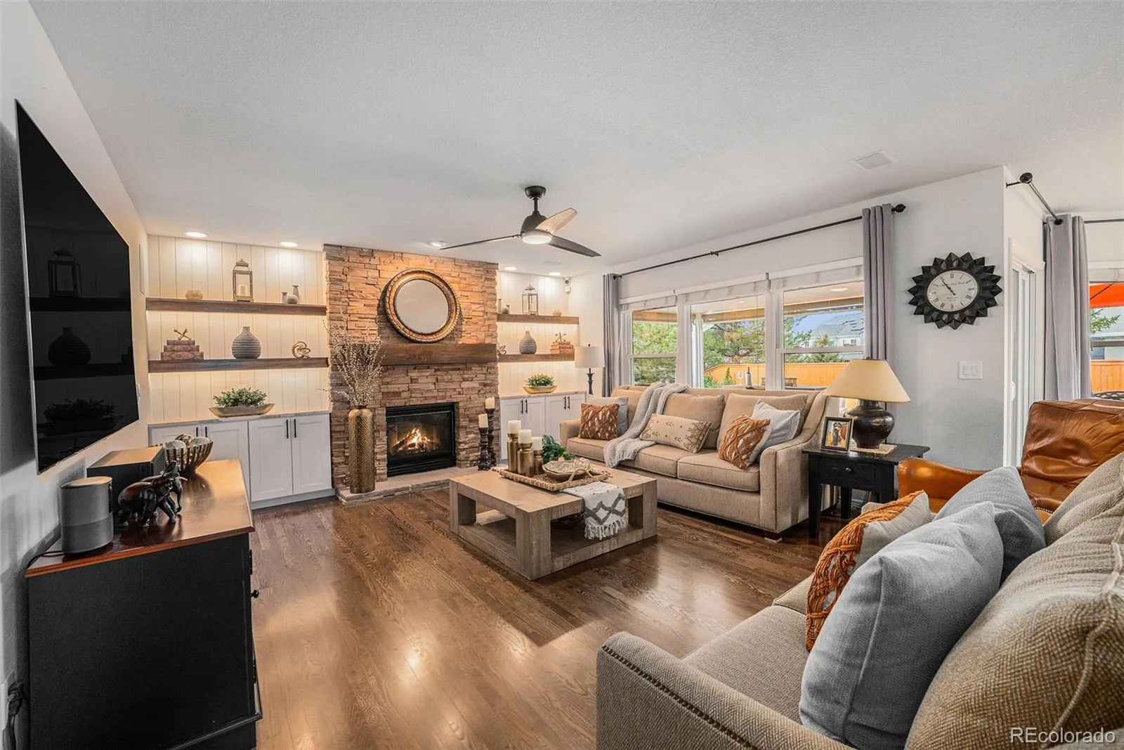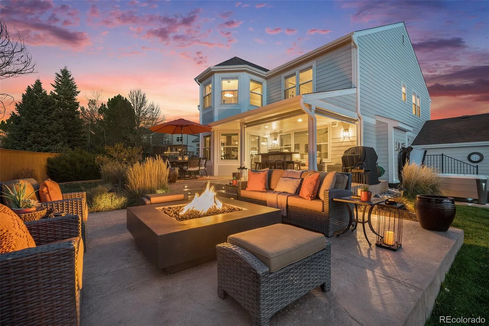 Incredible home on a premium Weatherstone cul-de-sac lot, perfectly positioned on a corner backing to open space with stunning southwest mountain views. Finished basement with all of the amenities. Oversized finished 3-car garage with EV charging. Multiple outdoor living areas with park like back yard. This meticulously maintained property shows like a model, offering 5 bedrooms, 5 bathrooms, and a main-floor study. The grand entry features soaring ceilings and a staircase with wrought-iron railings leading into a light, bright, and open floorplan with extensive hardwood flooring, designer carpet, and updated paint. The gourmet kitchen boasts white cabinets, quartz countertops, stainless steel appliances, a gas cooktop with hood, a huge island with breakfast bar, cozy nook, and walk-in pantry. The great room includes a stone fireplace, built-ins, and accent lighting, complemented by formal living and dining rooms. The spacious primary suite offers a sitting room, spa-like bath with heated floors, oval tub, custom shower, and walk-in closet. Three additional large bedrooms upstairs with one including an ensuite bath. The finished lower level features a media/family room with linear fireplace, custom wet bar, gym, workshop, bedroom, and a 3/4 bath. Outdoor living shines with a covered front porch, covered back patio with dining area and sunshade, stamped concrete patio, fire pit, and a $20k Hot Springs 7-person saltwater spa with audio. Additional highlights include brand-new interior and exterior paint, new high-efficiency HVAC system, water softener, reverse-osmosis filtration, air cleaner, newer low-E windows, whole-house fan, and upgraded attic insulation. Weatherstone residents enjoy access to exceptional neighborhood amenities including private pool, clubhouse, park, dedicated party/BBQ space, scenic trails, community events, as well as access to Highlands Ranch Rec Centers. Don’t miss this rare and exceptional home offering in the heart of Highlands Ranch.