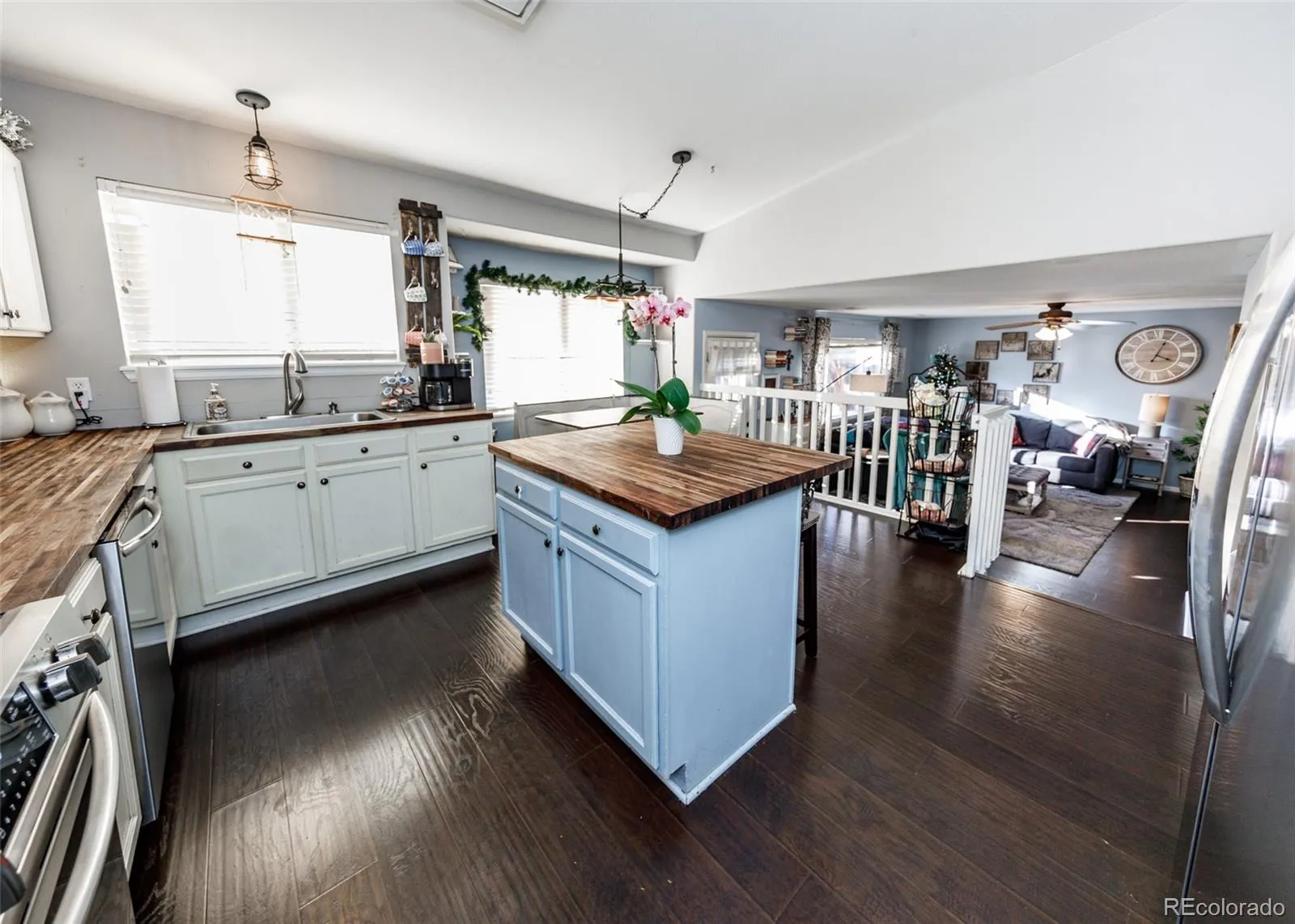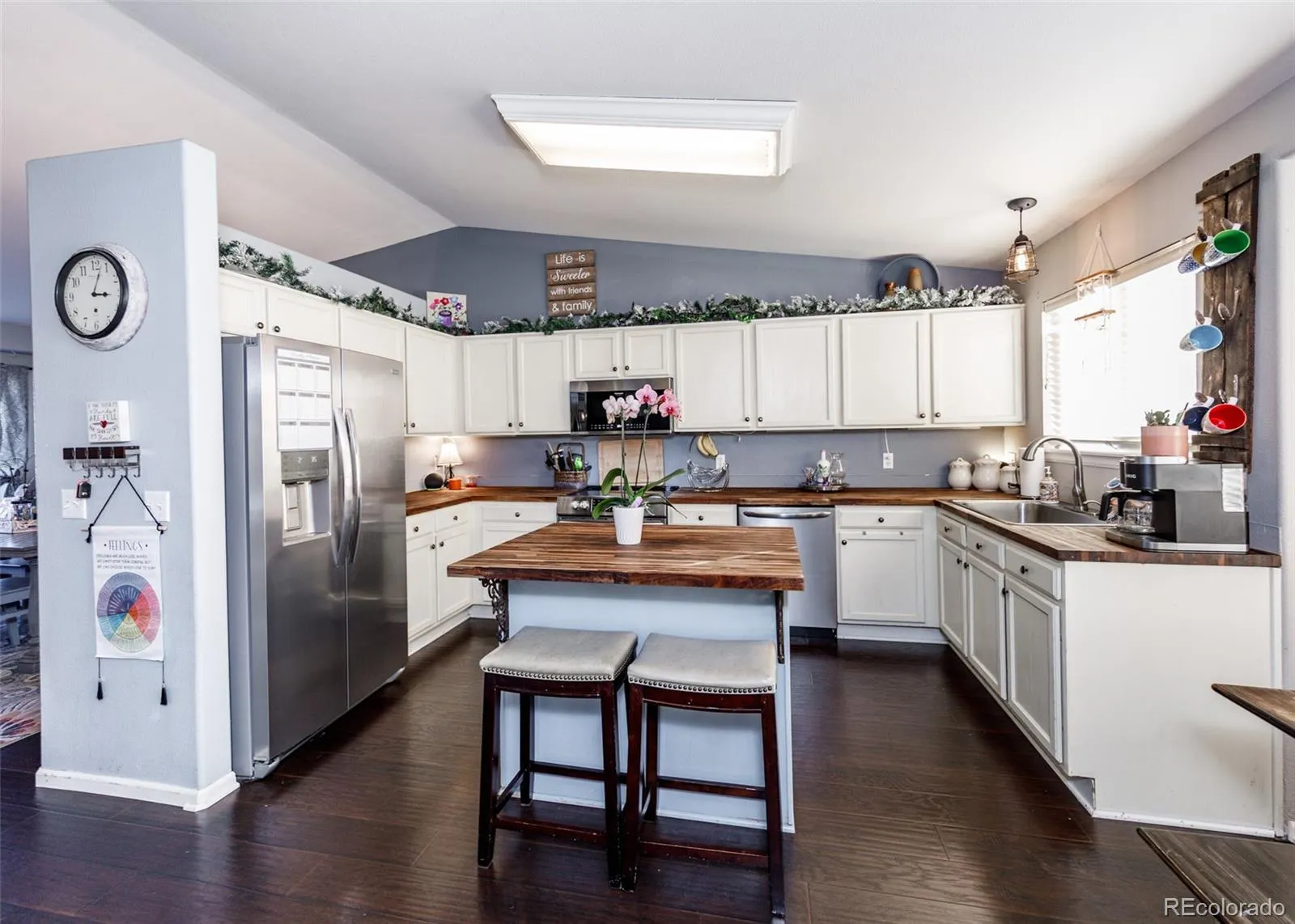 Step inside and be greeted by soaring vaulted ceilings and a formal dining room, providing plenty of room to spread out when hosting friends and family. The kitchen is a true focal point, showcasing custom butcher block countertops and a large built-in island, perfect for the home chef.