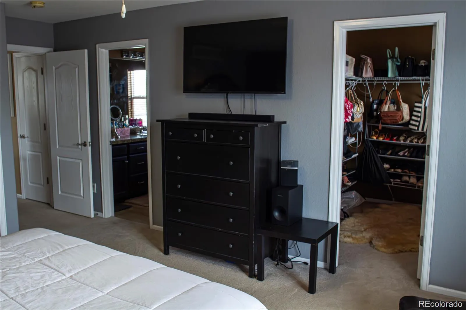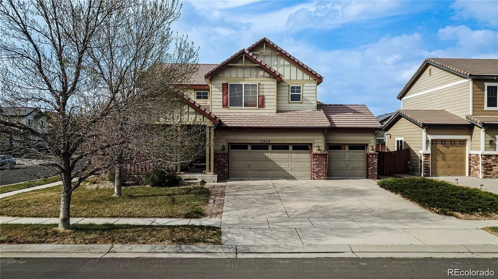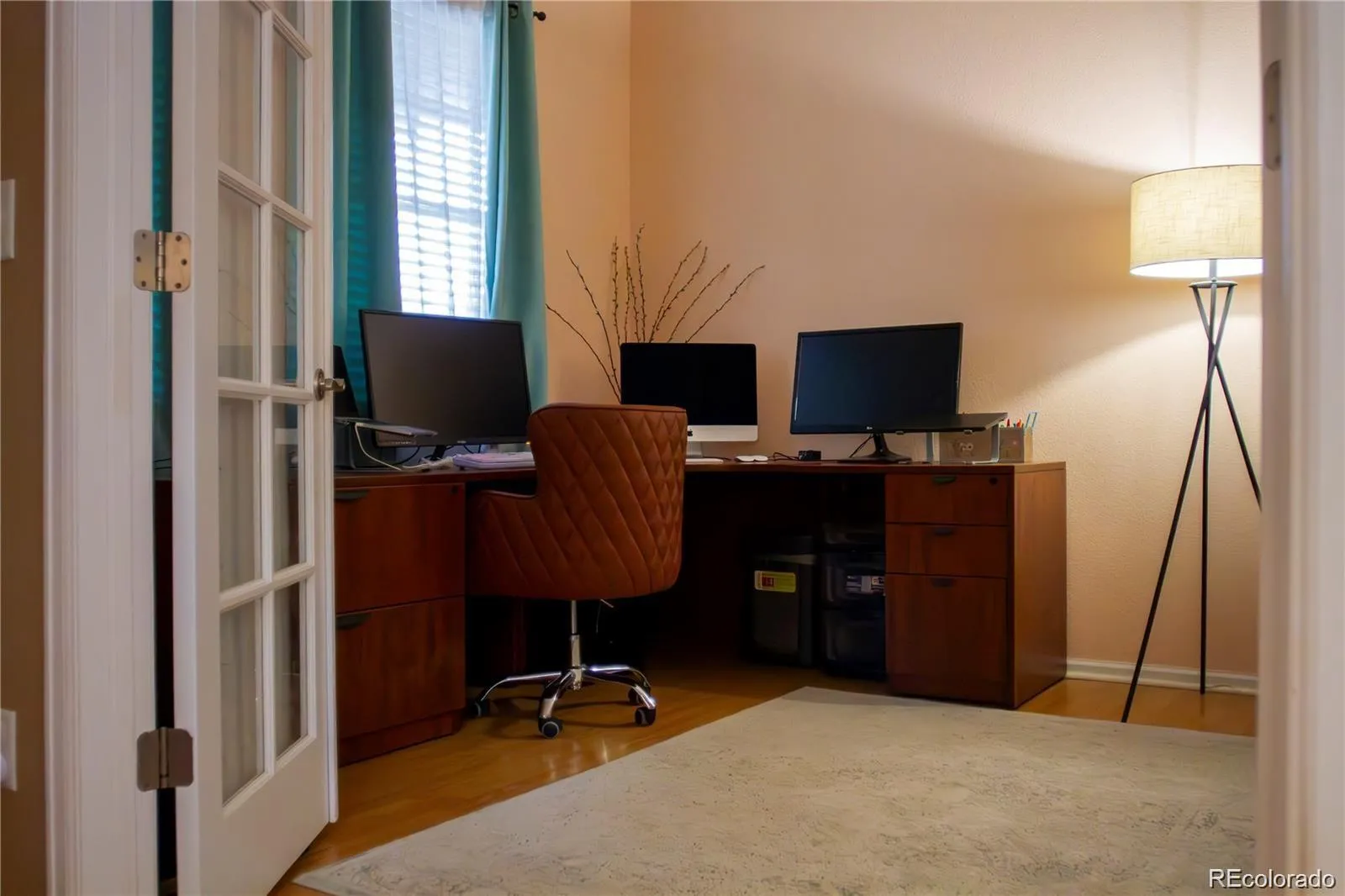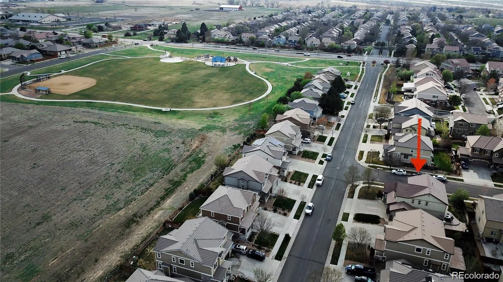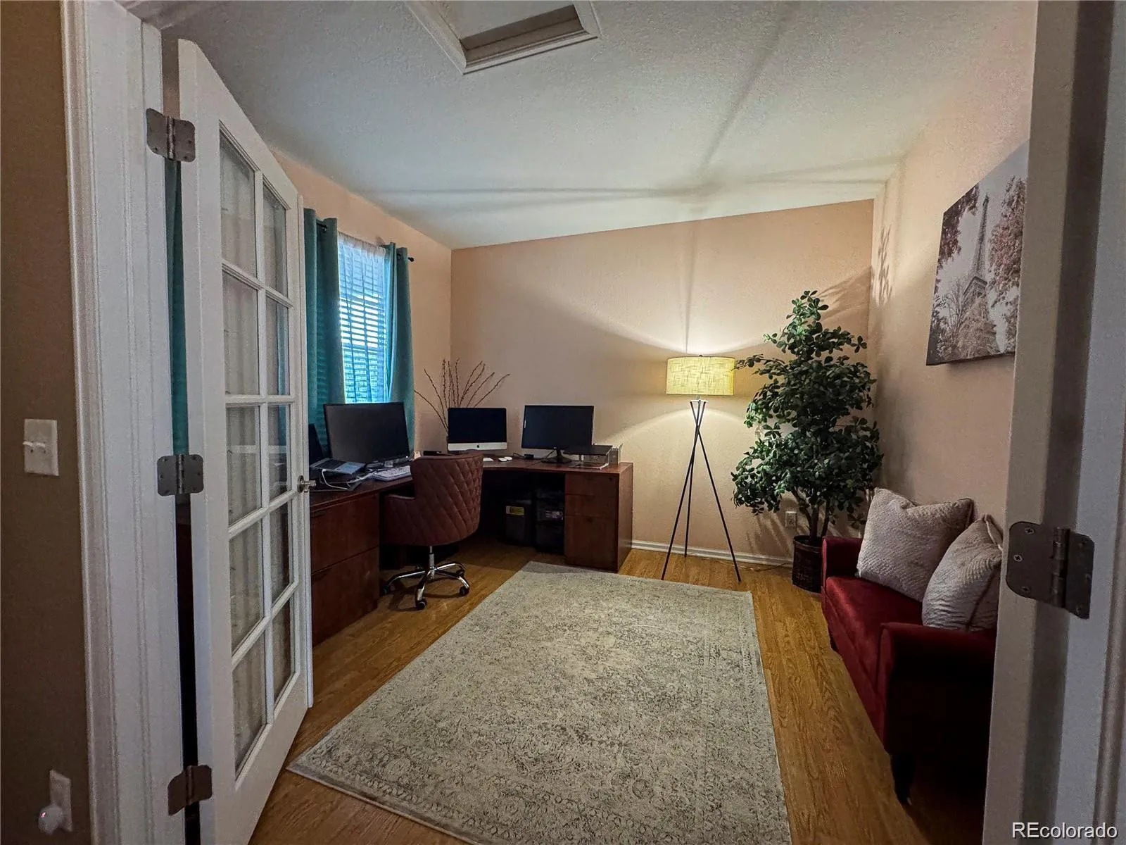 Set on a spacious corner lot in Commerce City, this stunning home offers soaring ceilings, smart design, and exceptional storage. As you enter, elegant French doors lead to a private office—perfect for remote work or quiet time. The main living area boasts 18-foot ceilings, filling the space with natural light, while a cozy gas fireplace adds warmth.