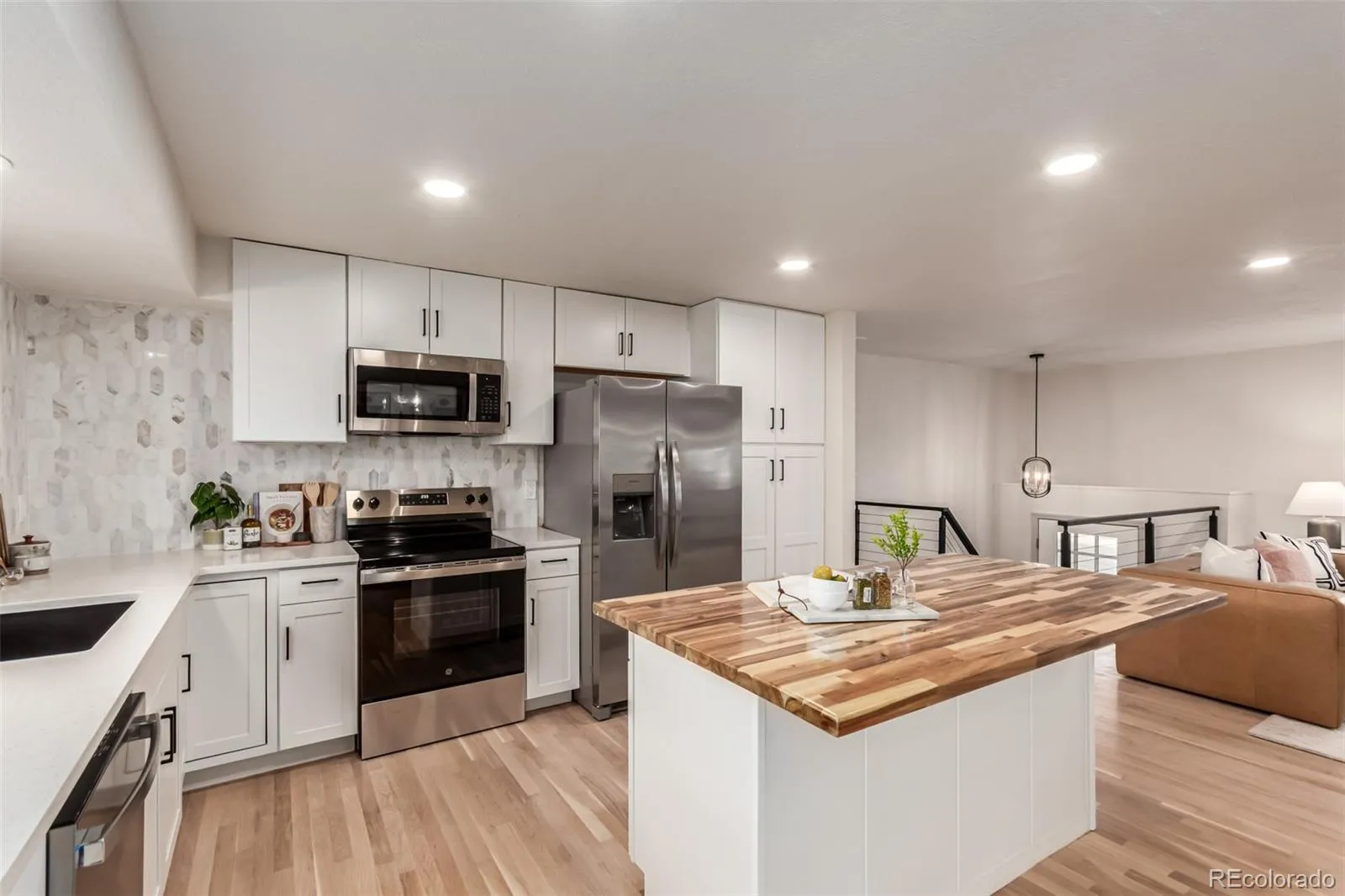 The open concept upper level features a fully remodeled kitchen designed to be the heart of the home. It showcases brand new appliances, a stunning backsplash, quartz countertops, a central butcher block island, and ample cabinets and pantry space. Adjacent to the kitchen is a dining area and a living area which includes a statement wall for the TV. There’s plenty of space for cooking, gathering, and entertaining. Down the hall, you’ll find two bedrooms and a full bath that doubles as an en suite to the primary bedroom. Large windows fill this home, making it light and bright while the newly refinished hardwood floors create a warm and inviting feel throughout the upper level.