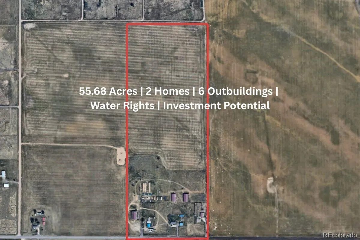The current offering now includes BOTH residences and ALL outbuildings, complete with ground water rights, creating a more complete and versatile property package. Rare opportunity to acquire 55.68 acres in the rapidly expanding northeast Denver metro corridor. Situated directly in the path of growth, this property offers long-term development upside, land banking potential, and immediate utility from existing improvements. The property includes two residences, providing flexibility for rental income, multigenerational living, or on-site management, along with six outbuildings suitable for storage, agricultural use, or potential lease income. With significant acreage, ground water rights, and convenient access to major roads, this parcel represents a strategic acquisition for developers, investors, or buyers looking to secure a large land position in a high-demand growth area. Large, contiguous parcels of this scale within close proximity to the Denver metro area are increasingly limited, making this a compelling opportunity for long-term investment and growth.