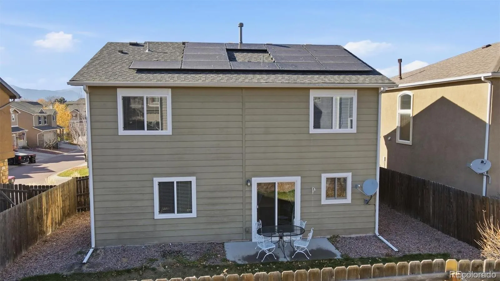 Beautifully updated 3BR, 2.5BA, 2-story home perfectly situated on a quiet cul-de-sac in the desirable Mule Deer Crossing neighborhood of Cimarron Hills. Thoughtfully maintained & upgraded, this home features a newer A/C coil & condenser, HVAC system with air filtration & insulated vent system, & a newer water heater. Energy-conscious buyers will appreciate the 2021 solar panel installation, offering both efficiency & cost savings. Light, bright, & inviting, the home greets you with a vaulted entry & newer vinyl plank flooring throughout the main level. The spacious Living Room provides the perfect gathering space for family & friends & seamlessly flows through attractive French doors into the walk-out Dining Area & Kitchen. The Kitchen offers abundant wood cabinetry, generous counter space, a pantry, & a suite of newer appliances, incl a gas range oven, built-in microwave, dishwasher, & French-door refrigerator. A newly installed sliding glass door opens to a large fenced backyard with auto sprinklers, a concrete patio, ideal for outdoor dining, relaxation, & play. A convenient main-level Powder Bath adds to the home’s functionality. Upstairs, you’ll find three spacious BRs & two Full BAs. The Primary Bedroom serves as a private retreat with a versatile sitting area or office nook, an adjoining bathroom, & a walk-in closet. The Primary Bathroom features a soaking tub, tiled shower, vanity, & large mirror. Two additional BRs share a well-appointed Full Bathroom. The Laundry Room has a window & incl the washer/dryer. Parking is no problem with a 2-car attached garage with door opener & an expanded driveway. Fantastic location near schools, parks, hospital, fire station, shopping & dining along the Powers Corridor, & it’s just 6 miles to Peterson Space Force Base for military personnel. This well-maintained home offers comfort, convenience, & modern updates. Its ready for you to move in & make it your own. Come preview this beautiful home today!