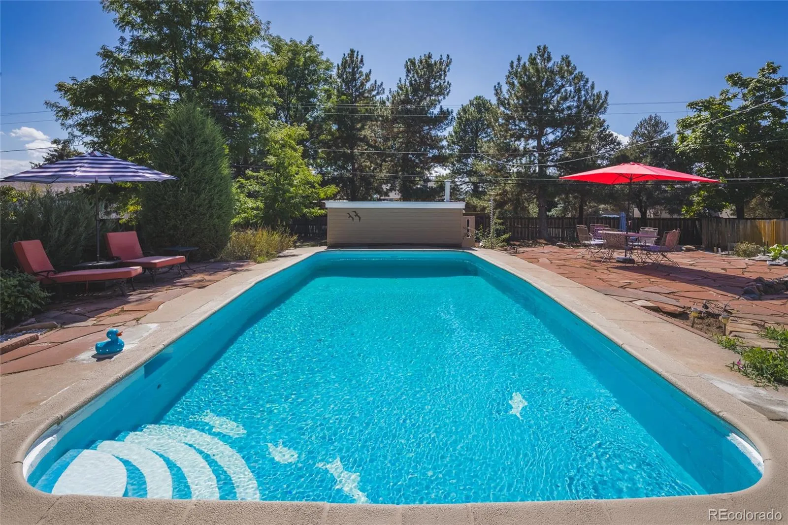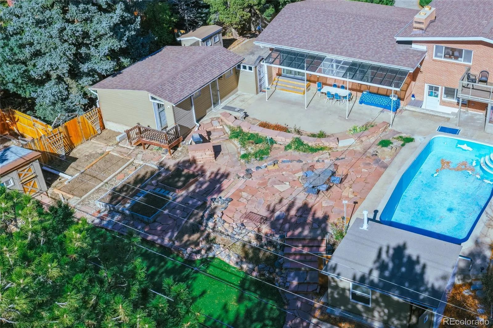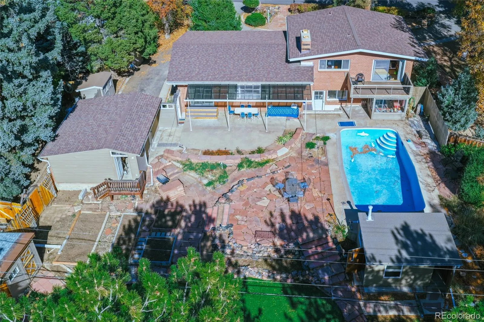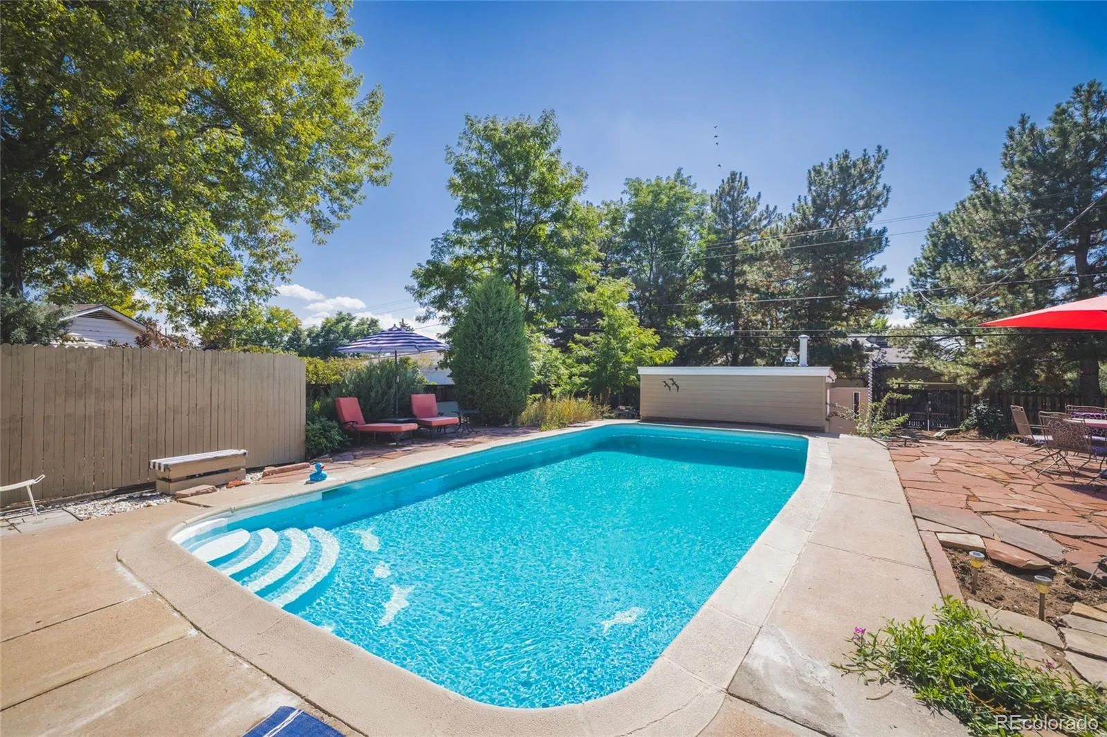 Nestled within one of Littleton’s most distinguished neighborhoods, 7332 West Stanford Avenue sits on an expansive 0.54-acre lot (23,914 square feet) in the quiet, tree-lined enclave of Lochmoor. Step inside to discover abundant natural light, vaulted ceilings with exposed beams, and the framework for your personal touches. The mid-century tri-level design and basement gives separation of space across more than 3,400 square feet. With five bedrooms and two baths, this classic 1957 mid-century brick home offers the perfect blend of vintage character and potential. On over a half-acre lot, this property delivers outdoor freedom within city limits — a beautifully landscaped backyard sanctuary featuring mature trees, a private pool, garden, golf putting green, spacious chicken coop, astroturf lawn, and an expansive flagstone patio for relaxing or entertaining, equipped with an exterior gas line for your grill or future expansion. The oversized garage and sheds offer ample storage. This home gives you access to the best of Littleton — located near highly rated schools, close to shopping, dining, and services, within an established and coveted community.