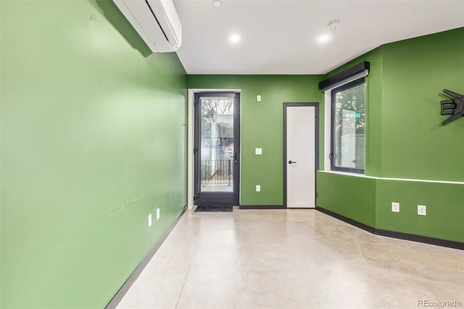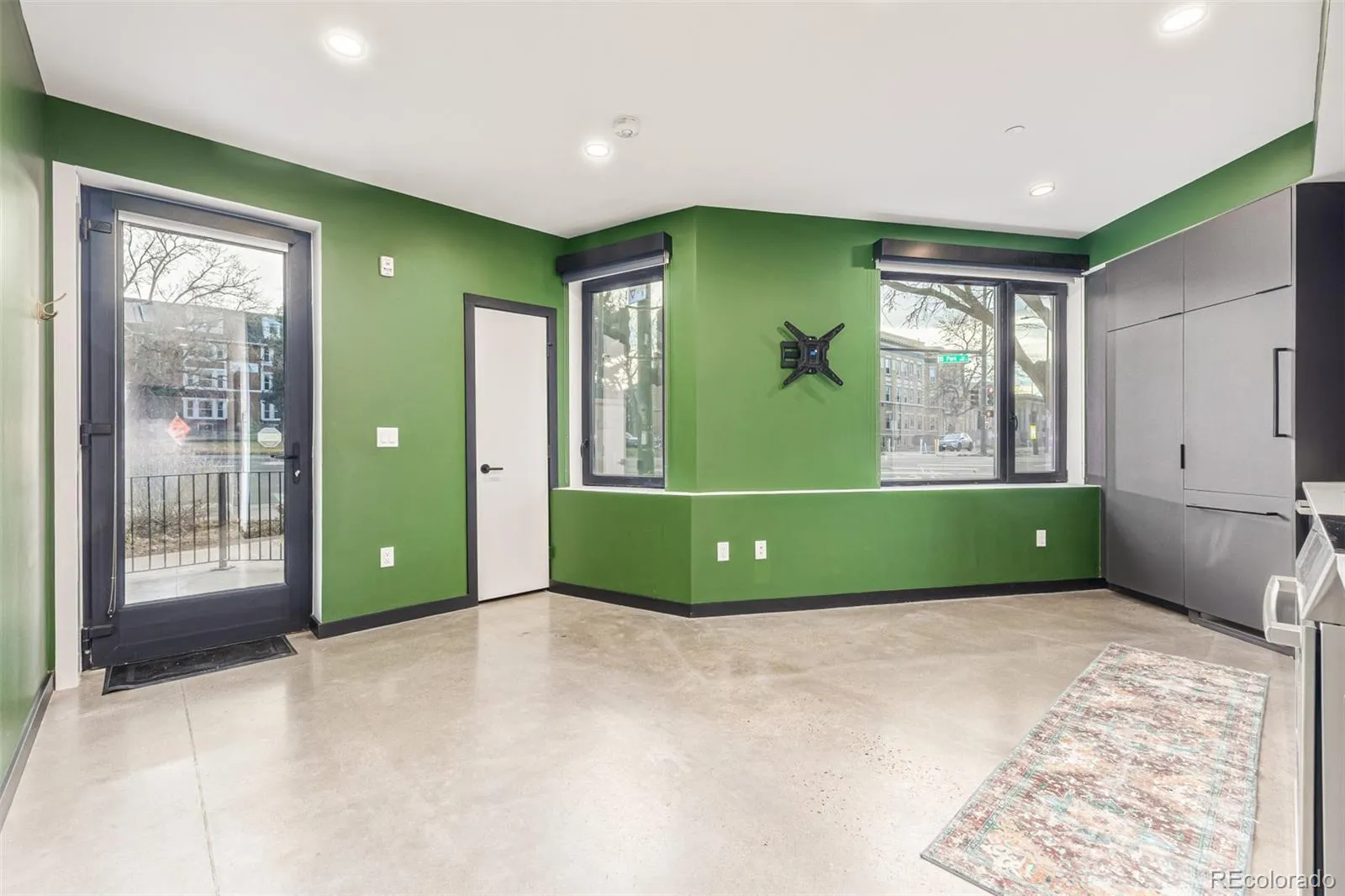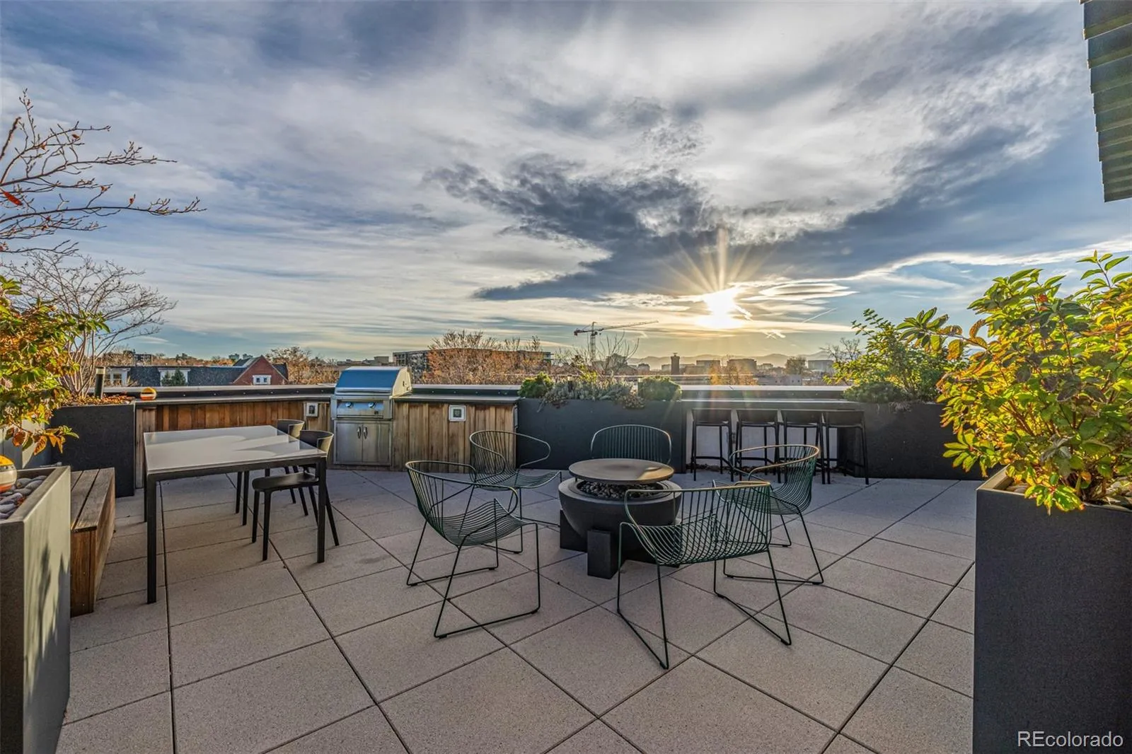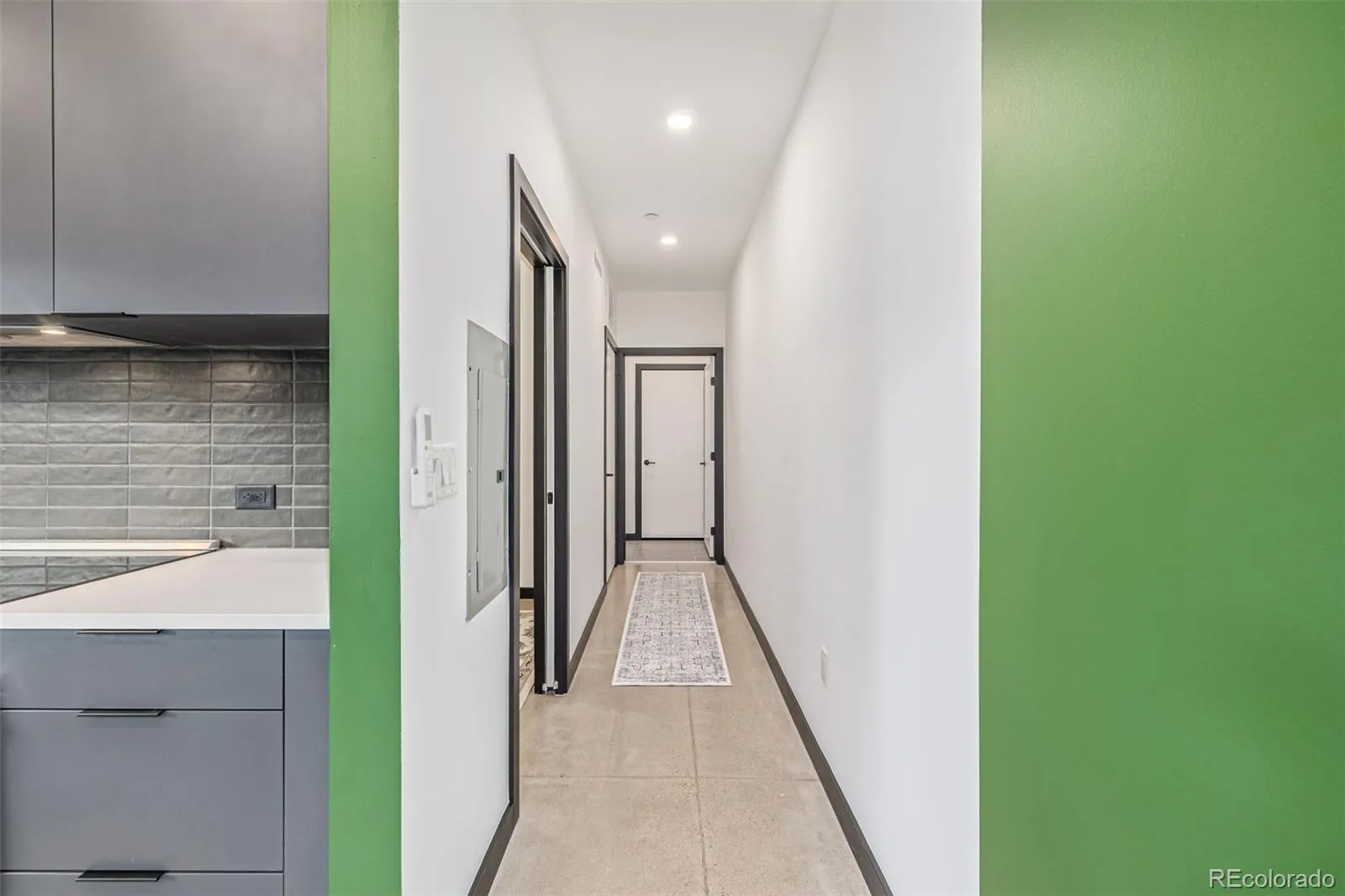 Discover refined urban living in this impeccably designed ground-level residence, where contemporary style meets unmatched city convenience. Nestled in the heart of Denver with an exceptional walk score, this modern retreat offers an open, airy layout enhanced by soaring ceilings, polished concrete floors, and a sophisticated, minimalist aesthetic. The kitchen is a true focal point—crafted with quartz countertops, flat-panel cabinetry, recessed lighting, and integrated stainless steel appliances, including a Bosch range and concealed refrigerator. A striking black tile backsplash adds depth and contrast while maintaining a sleek architectural feel. Expansive windows illuminate the home with natural light, complemented by custom dual-roller shades that let you tailor brightness and privacy to your liking. The bedroom provides a peaceful sanctuary, completed with a walk-in closet. The full bathroom continues the modern theme, featuring a floating vanity, glass-enclosed tub/shower, and ample room for daily comfort. Additional conveniences include in-unit laundry, a sizable linen/storage closet, and a well-designed entry nook ideal for coats, shoes, and everyday essentials. Two mini-split systems offer year-round climate control, ensuring comfort in every season. Beyond the unit, The Arbory delivers elevated amenities such as secure package delivery, a fully automated parking system with your own deeded space (#34), and a stunning rooftop lounge—perfect for gatherings set against breathtaking skyline views. All of this places you minutes from Downtown, City and Cheesman Parks, RiNo, Coors Field, plus countless restaurants, cafés, and shops along 17th Avenue. Don’t miss this opportunity to claim a polished, modern haven in one of Denver’s most vibrant urban settings.