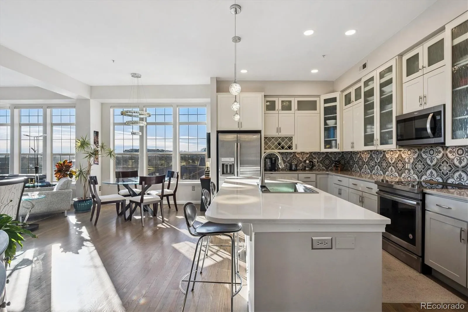 This is the one you have been waiting for at Vallagio! Top floor, southeast corner with amazing panoramic views, great morning sun and cool evenings on the balcony. No expense has been spared in updating this home from top to bottom, every room has been tastefully curated with beautiful finishes including wood floors, updated cabinetry, quartz counters and designer selected tile and lighting. The open great room is spacious and includes corner windows to capture the views as well as a gas fireplace with split stone facade to take the chill off of cool winter evenings. The adjacent dining area opens to the kitchen with center island and is truly a chef’s dream with stainless appliances, quartz counters with a detailed tile back splash make the kitchen a show place. A study with French doors is ideal for the work at home professional. The primary suite is tucked privately away and includes a spacious bedroom plus en-suite bath with oversized shower and dual vanity plus a generous walk-in closet. A spacious secondary bedroom and bath are located away from the primary for added privacy. In residence laundry and direct elevator access to your two indoor parking spaces are an added convenience. Walk to numerous restaurants and retail shops in the Vallagio town center and your minutes away from the Dry Creek light rail station taking your all over metro Denver. Separate Membership in the Inverness Golf Club allows access to the golf club plus the many amenities of the Inverness Hotel. Convenience and minimum maintenance are part of the Vallagio lifestyle. Life the life you love!