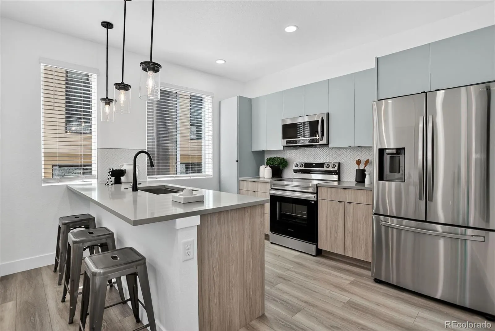 Welcome to this brand-new luxury townhome offering the best of Denver living with stunning views of Sloan’s Lake, the Rocky Mountains, and the vibrant downtown skyline. Thoughtfully designed across three levels with an expansive fourth-floor rooftop deck, this home combines sleek finishes with functional spaces ideal for both entertaining and everyday living. The main level features a versatile office perfect for working from home or as a creative flex space, along with a stylish powder bath for convenience. Upstairs, the open-concept living area invites gatherings with a spacious family room with cozy balcony that flows seamlessly into the dining area and kitchen. Enjoy the gourmet kitchen outfitted with quartz countertops, stainless steel Samsung appliances, soft-close cabinetry, and a striking tile backsplash that adds both texture and character. On the upper level, the primary suite provides a private retreat with a generous walk-in closet, dual additional closets, and a spa-inspired bathroom showcasing quartz countertops, dual sinks, sleek tile finishes, and a beautifully tiled walk-in shower. A second bedroom also features its own en suite bathroom with a tub and tile surround, creating the perfect guest suite or secondary living space. Conveniently located nearby is the laundry area, designed for function without sacrificing style. Topping off this remarkable home is the expansive rooftop deck, where panoramic views stretch from Sloan’s Lake to the Rocky Mountain Front Range and over the glittering lights of downtown Denver. Whether hosting rooftop gatherings, enjoying morning coffee with a sunrise, or watching the sun set behind the mountains, this deck defines Denver living at its finest. Just steps from Sloan’s Lake, trails, and green spaces, and minutes from Denver’s best dining, nightlife, and shopping, this residence blends modern luxury with a lifestyle that is truly unmatched. WELCOME HOME!
