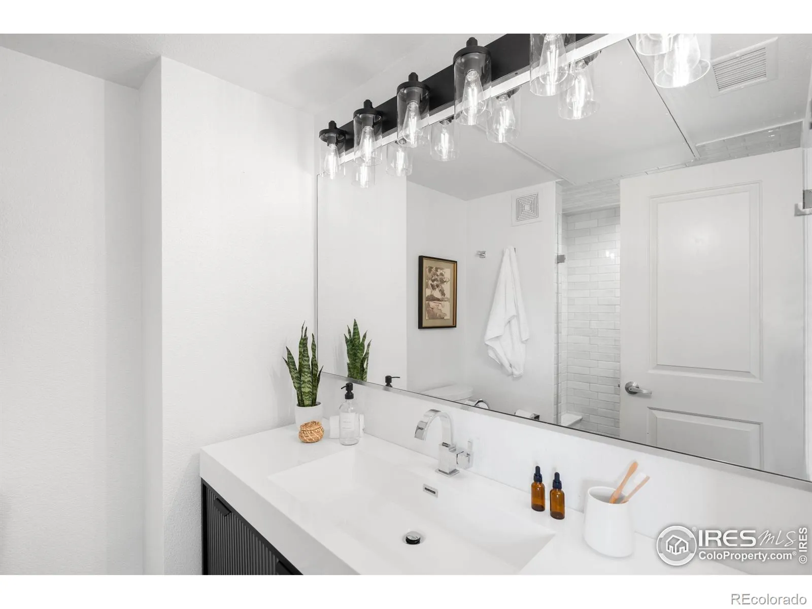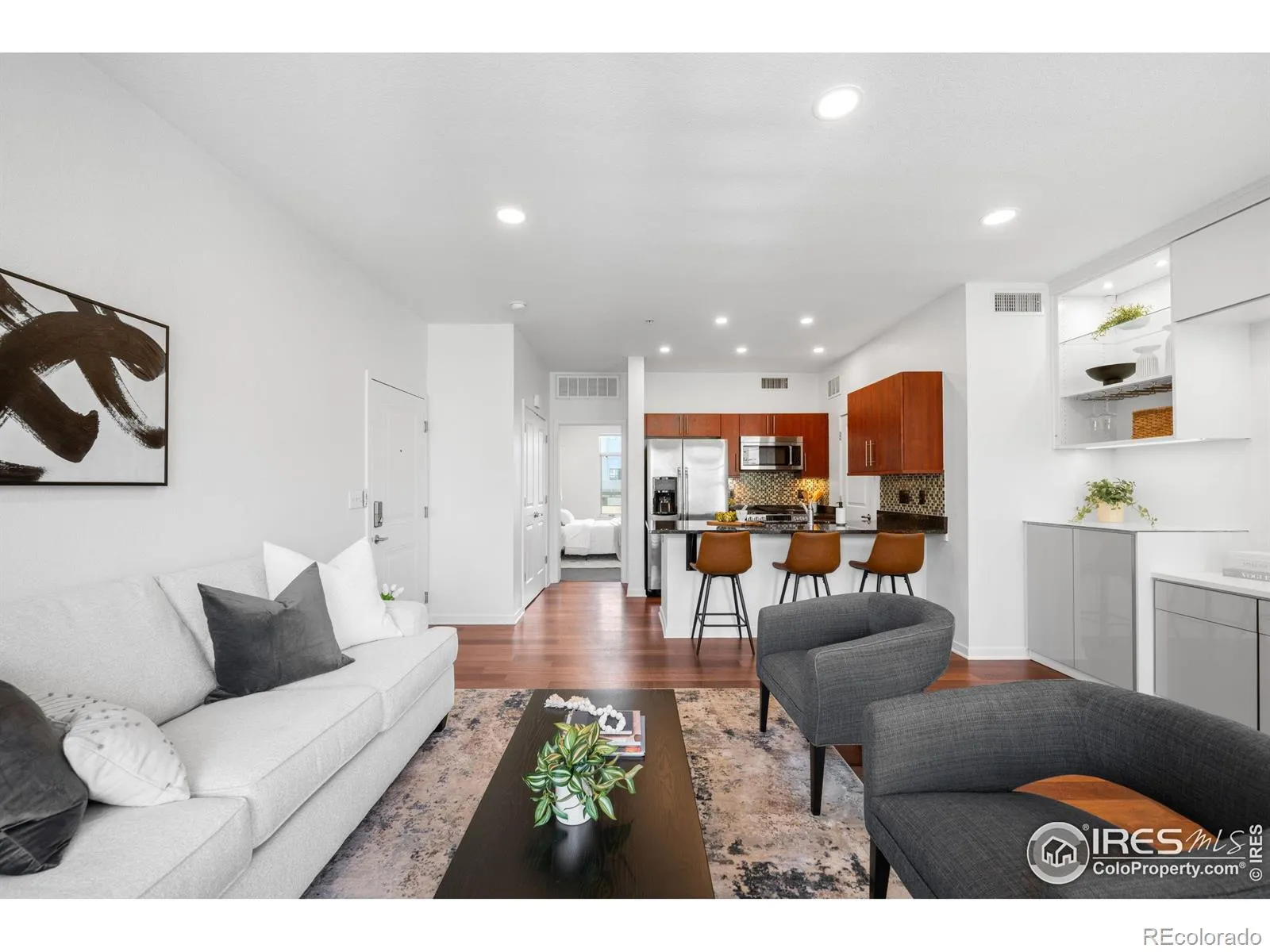 Revel in refined urban living in this mid-floor residence in the coveted Village at Uptown. Featuring Euro-inspired designer finishes, this light-filled residence boasts soaring ceilings, floor-to-ceiling glass and rich wood flooring. A sleek kitchen showcases granite countertops, stainless steel appliances, a tiled backsplash and beautiful wood cabinetry. The spacious one-bedroom layout includes a rare, separate workspace with its own bath – ideal for remote work or creative pursuits. Enjoy morning sunlight and fresh air on the oversized private balcony. The sizable bedroom is complemented by a serene bath with a walk-in shower and modern fixtures. Custom built-in California Closets enhance storage and functionality throughout, including curated closets, a pantry and an entertainment center. A detached garage adds convenience. Residents enjoy a central location with proximity to shopping and eateries in North Boulder, the NoBo Library and nature trails, plus easy access to Downtown Boulder amenities.