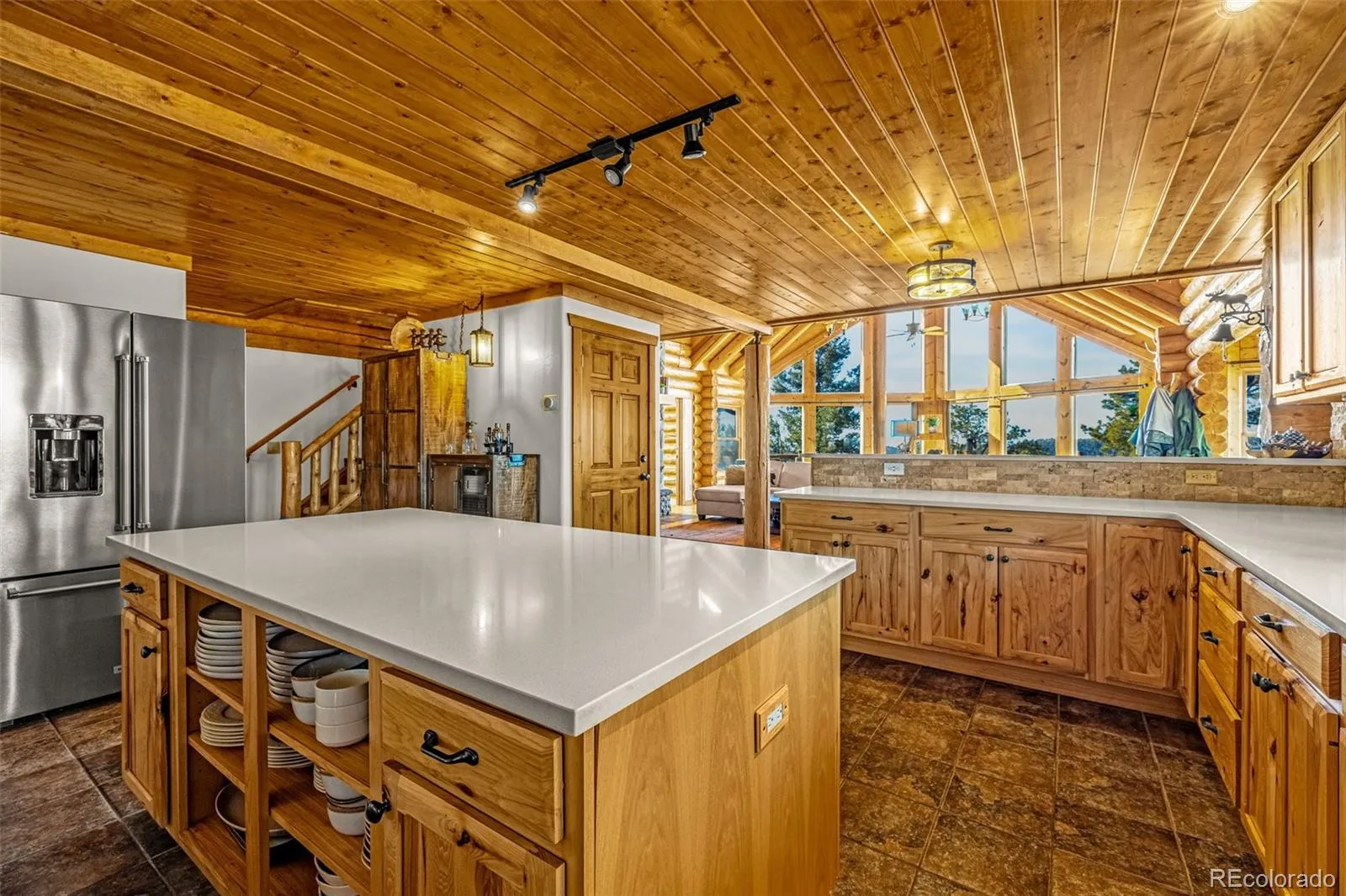 Welcome to this stunning log home on 1.2 acres in Cripple Creek Mountain Estates. Perfectly perched atop dramatic boulders with 360-degree views, this 3-bedroom, 4-bath retreat blends classic Colorado charm with thoughtful upgrades and unbeatable outdoor living. The main level showcases a grand living room with floor-to-ceiling windows, a striking rock fireplace, cozy wood-burning stove, hardwood floors, and walkout access to an expansive wraparound deck with breathtaking mountain views. The updated kitchen features white quartz countertops, new appliances, and a large pantry with plenty of prep and storage space, while the octagon dining room adds rustic elegance. A powder room and private elevator complete the main level. The primary suite offers vaulted ceilings, floor-to-ceiling logs, new carpet (along with the rest of the carpeted areas), deck access with a hot tub, and a luxurious ensuite bathroom with dual quartz vanities, jetted tub, walk-in shower, walk-in closet, and laundry. Upstairs, the loft captures impressive western views, includes a Juliet balcony to the east, and features its own 3/4 bathroom. The lower level provides access to the oversized 2-car garage, two secondary bedrooms, a full bathroom, family room, office nook, and walkout. The exterior has been recently refinished. Additional features include a greenhouse, fenced side yard for pets, and multiple outdoor spaces ideal for entertaining. This is a quintessential Colorado log home offering unmatched serenity, views, and craftsmanship.