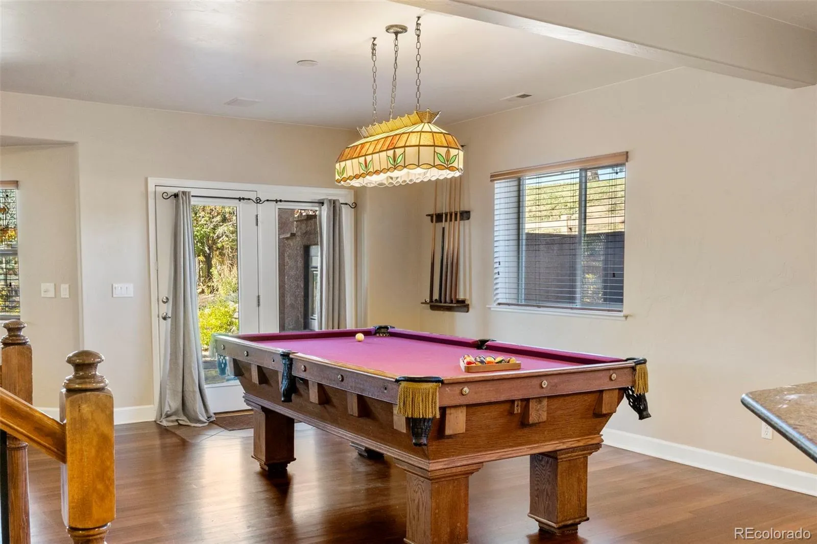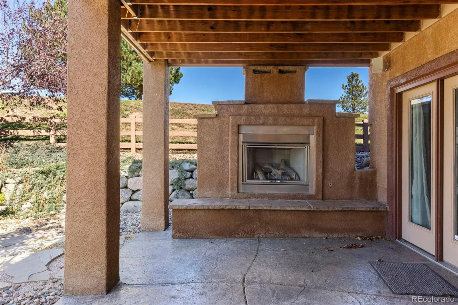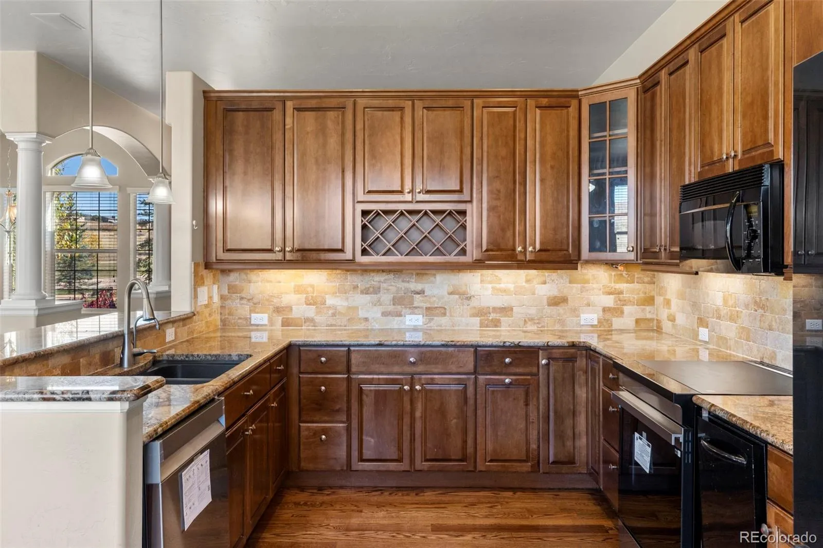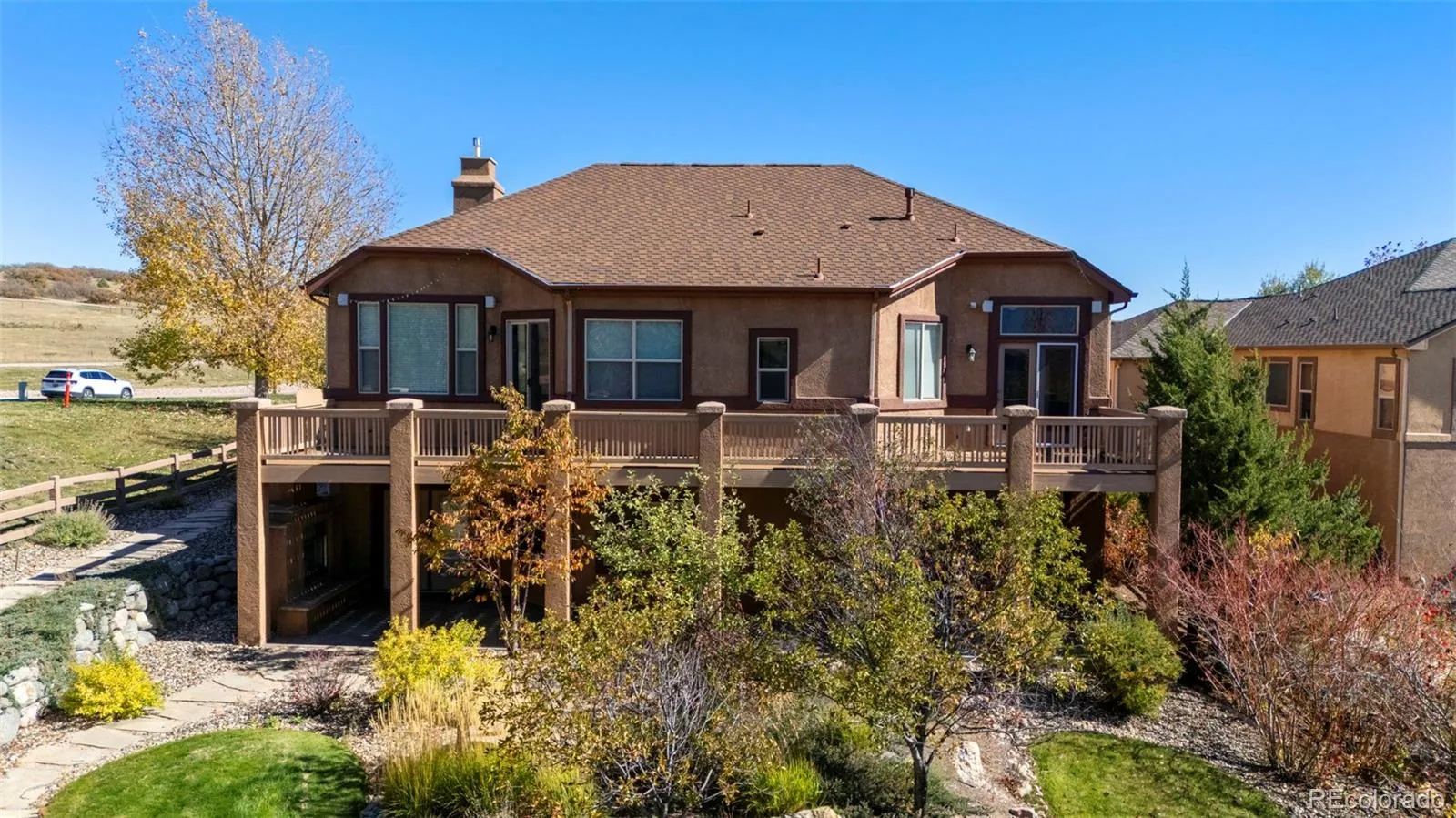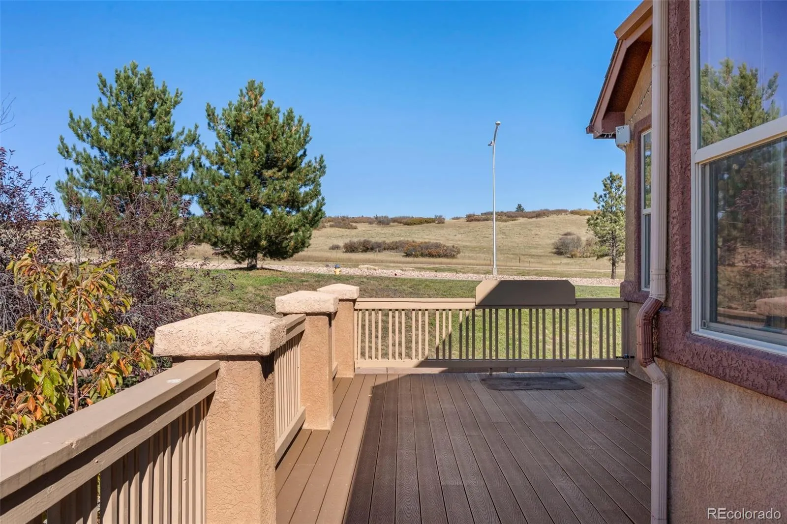 STUNNING FLYING HORSE RANCHER WITH BEAUTIFUL UPDATES AND MOUNTAIN VIEWS!** This Classic Homes “Cuchara” ranch plan offers a warm, inviting feel paired with impressive views of Pikes Peak and the Front Range. The home features newly refinished wood throughout—professionally sanded and stained to showcase a fresh, polished finish that enhances the natural warmth of the interior. The main level welcomes you with extensive hardwood flooring and an open living area centered around a stone-accented gas fireplace. The kitchen offers granite countertops, hickory cabinetry, and a comfortable flow into the dining and living spaces. The primary suite provides a relaxing retreat with a spacious 5-piece bath and generous walk-in closet. An additional main-level office with French doors provides a flexible space for work or quiet study. A separate secondary bedroom completes the main level. The walkout basement expands the living area with impressive ceiling height, Australian “Jarrah” wood floors, and large family and recreation spaces ideal for entertaining. A built-in wet bar enhances the lower-level gathering area, while two spacious bedrooms and two well-appointed tiled baths offer comfort and privacy. Outdoor living shines with a full-length Trex deck and a walkout patio surrounded by thoughtful, designer landscaping. Located in the desirable District 20 area, this home combines craftsmanship, comfort, and an exceptional setting.