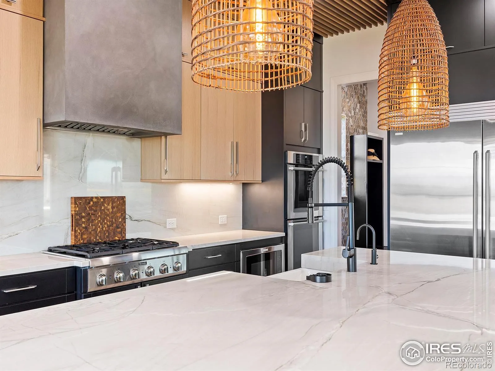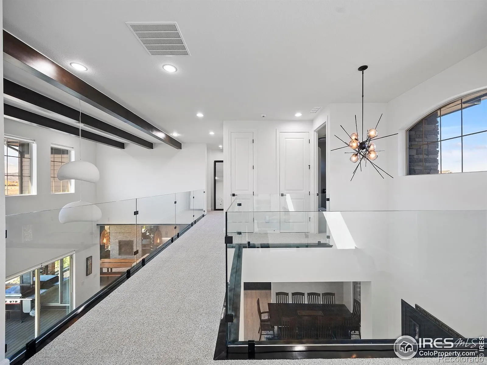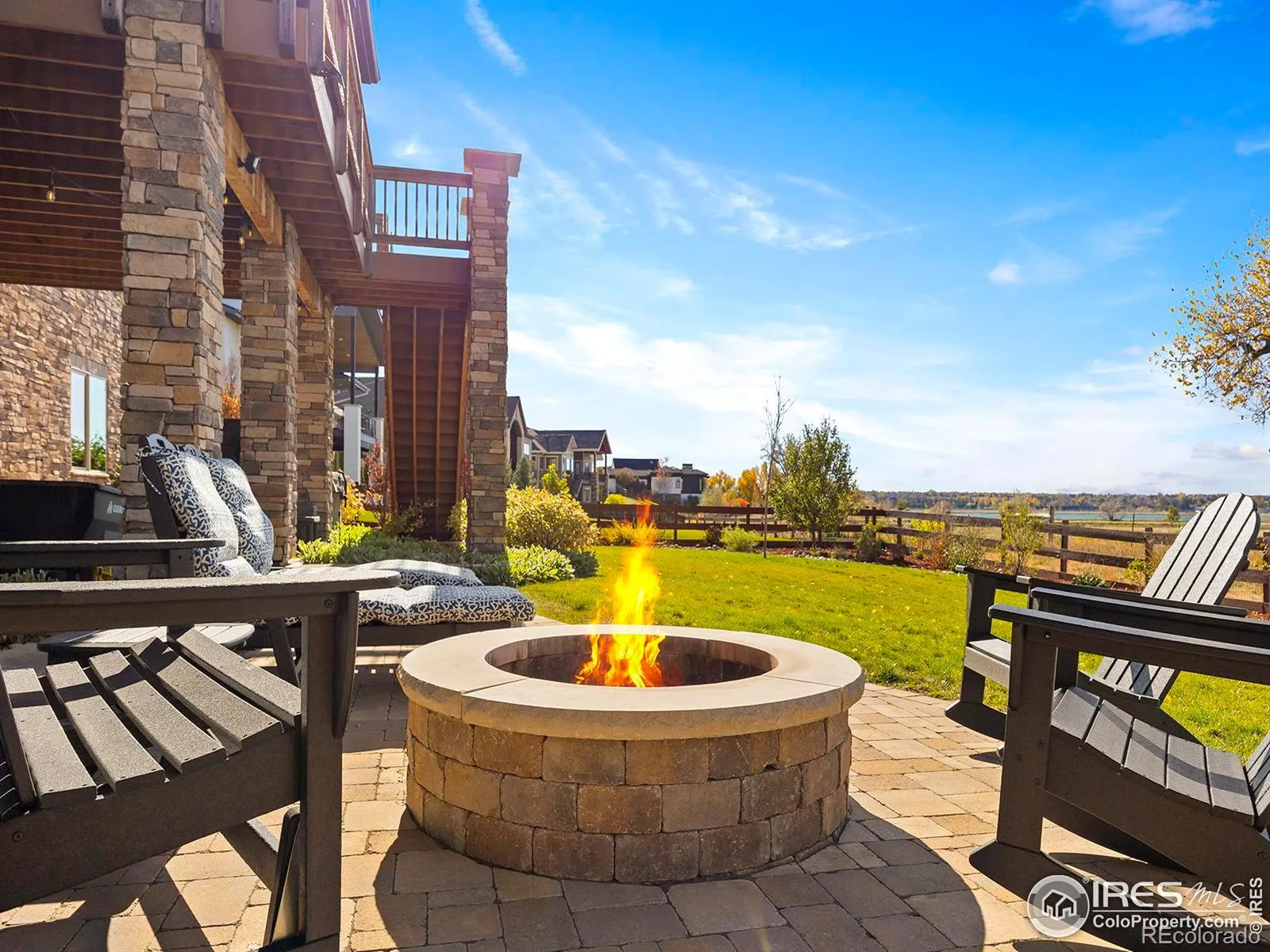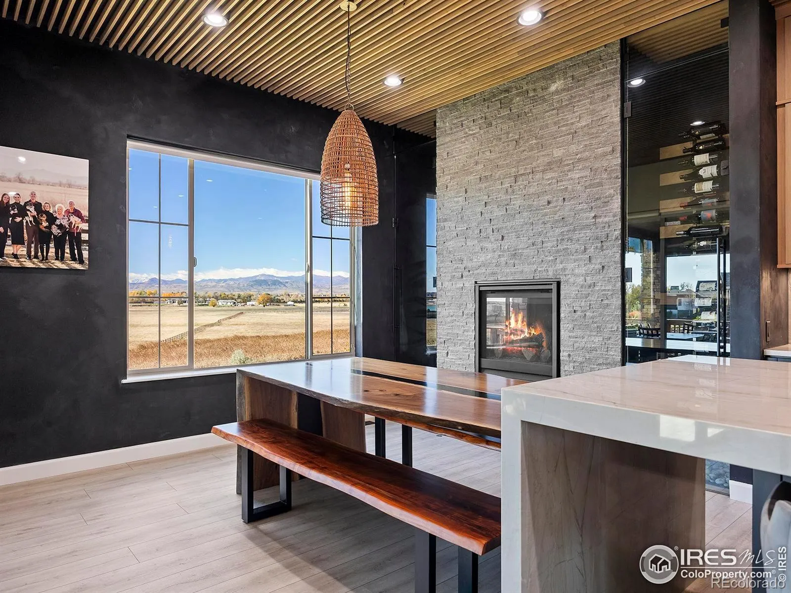 Scandi-Modern design on one of the most coveted vistas in NoCo. Step inside & the panorama unfolds-sweeping views of the Rockies & the Poudre River frame vaulted interiors & artisan finishes. The kitchen is the home’s statement of craft: white-oak slab cabinetry, mitered Bianco Superiori quartzite waterfall counters, & a warm black-walnut eat-in extension that hovers beside a stone fireplace flanked by architectural glass wine displays. Precision fluted wood flows through the kitchen into the oversized wet bar along the dining room. Hand-selected Scandinavian one off lighting illuminate the space with an effortless glow.In the great room, an 18-foot custom Venetian-style fireplace rises like an art installation, drawing the eye toward Cloud pendants above. A 14-ft sliding glass wall opens to a covered terrace where mountain vistas & the quiet presence of cattle grazing along the oxbows of the river create a cinematic backdrop.The main level features a refined guest or in-law suite, exquisite powder room with dimensional tile, a floating vanity, and a petrified-wood sink + a generously proportioned office.Ascend the custom glass staircase & cross the airy catwalk to the dedicated Owner’s Wing-a private retreat where you awake each day greeting the granite peaks. The primary bath has wonderful texture & detail, with handcrafted mirrors, floor-to-ceiling tile + a freestanding soaking tub leading into a 400 sf split dressing suite. Two additional secondary beds-each with its own en-suite bath & walk-in closet complete the upper level.The walk-out lower level offers a full wet bar, a generous rec & media area + a large home gym and direct access to the hot tub. The lower level also has two additional private bedrooms. 4 garage bays for all your toys and the beautifully landscaped lot lets you tend your bounty of organic veggies from raised garden beds as you soak up the Colorado sun. A residence of this caliber with this view is rarely offered.