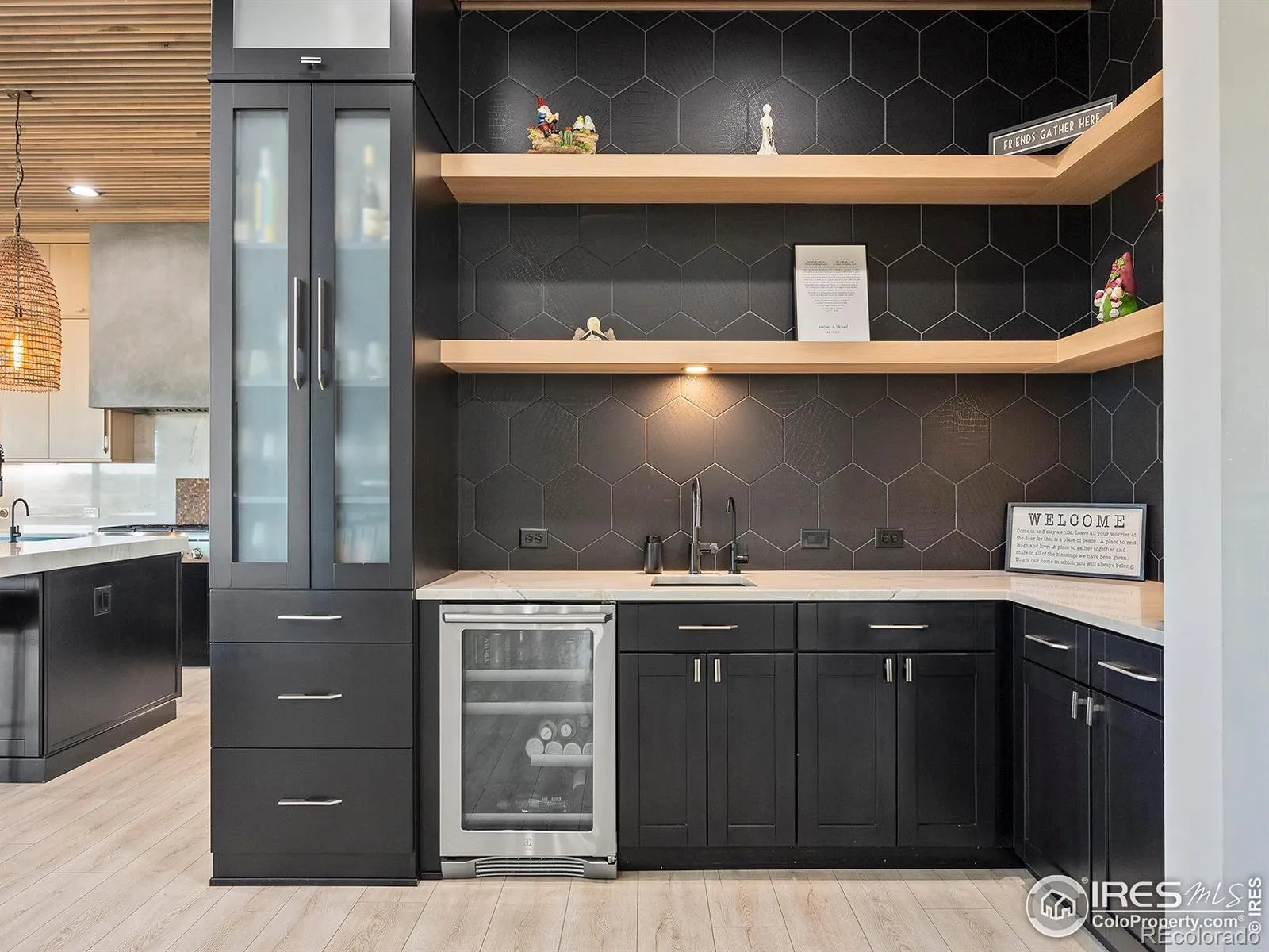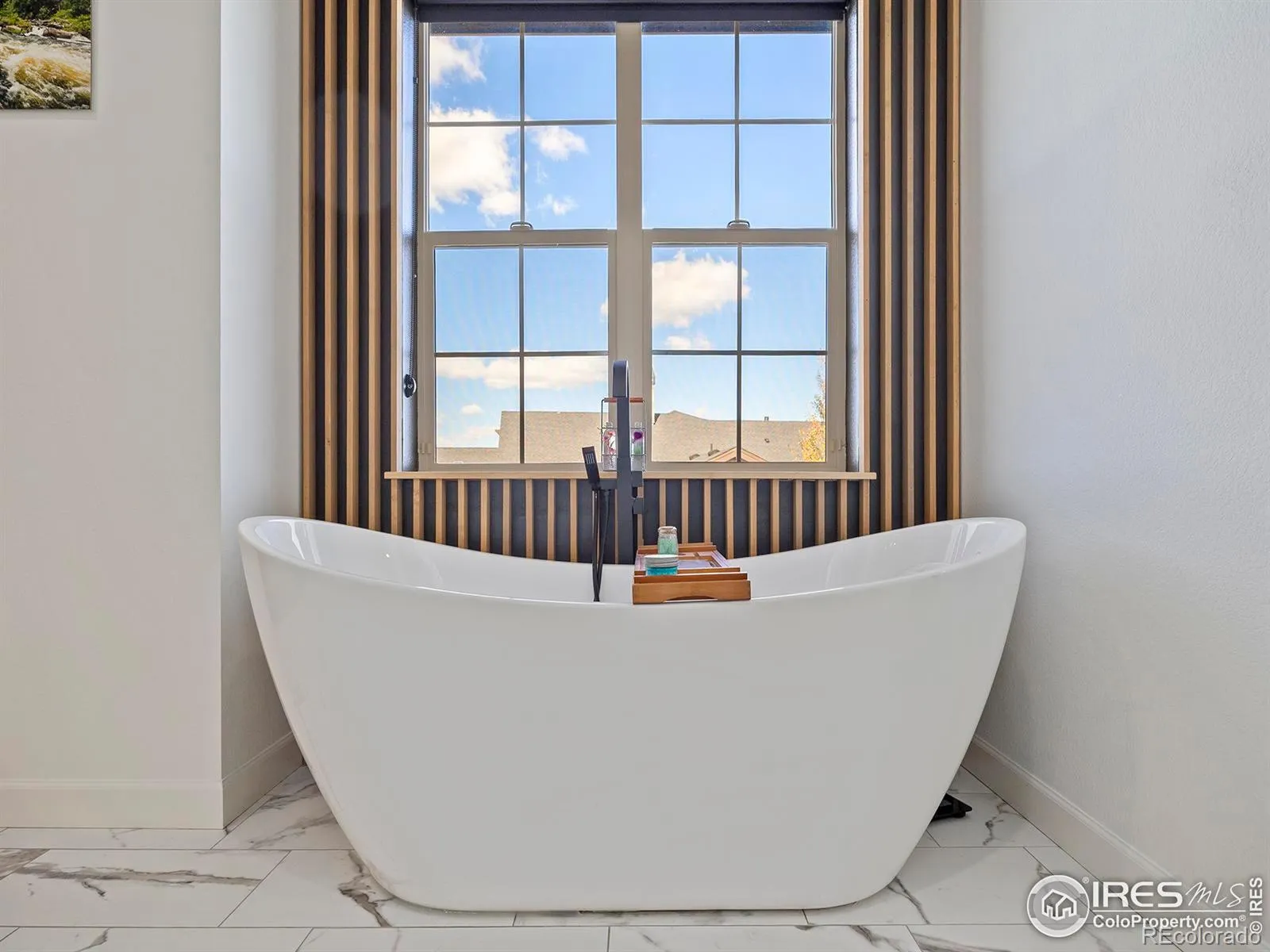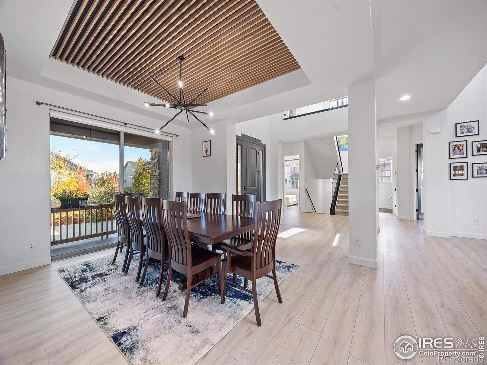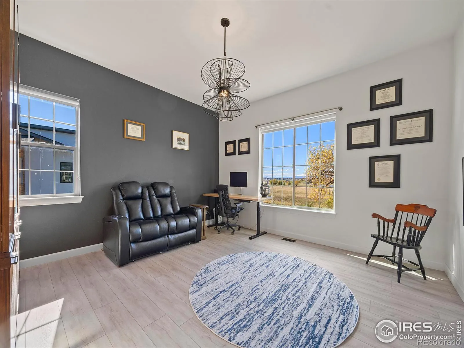 Scandi-Modern design on one of the most coveted vistas in NoCo. Step inside & the panorama unfolds-sweeping views of the Rockies & the Poudre River frame vaulted interiors & artisan finishes. The kitchen is the home’s statement of craft: white-oak slab cabinetry, mitered Bianco Superiori quartzite waterfall counters, & a warm black-walnut eat-in extension that hovers beside a stone fireplace flanked by architectural glass wine displays. Precision fluted wood flows through the kitchen into the oversized wet bar along the dining room. Hand-selected Scandinavian one off lighting illuminate the space with an effortless glow.In the great room, an 18-foot custom Venetian-style fireplace rises like an art installation, drawing the eye toward Cloud pendants above. A 14-ft sliding glass wall opens to a covered terrace where mountain vistas & the quiet presence of cattle grazing along the oxbows of the river create a cinematic backdrop.The main level features a refined guest or in-law suite, exquisite powder room with dimensional tile, a floating vanity, and a petrified-wood sink + a generously proportioned office.Ascend the custom glass staircase & cross the airy catwalk to the dedicated Owner’s Wing-a private retreat where you awake each day greeting the granite peaks. The primary bath has wonderful texture & detail, with handcrafted mirrors, floor-to-ceiling tile + a freestanding soaking tub leading into a 400 sf split dressing suite. Two additional secondary beds-each with its own en-suite bath & walk-in closet complete the upper level.The walk-out lower level offers a full wet bar, a generous rec & media area + a large home gym and direct access to the hot tub. The lower level also has two additional private bedrooms. 4 garage bays for all your toys and the beautifully landscaped lot lets you tend your bounty of organic veggies from raised garden beds as you soak up the Colorado sun. A residence of this caliber with this view is rarely offered.