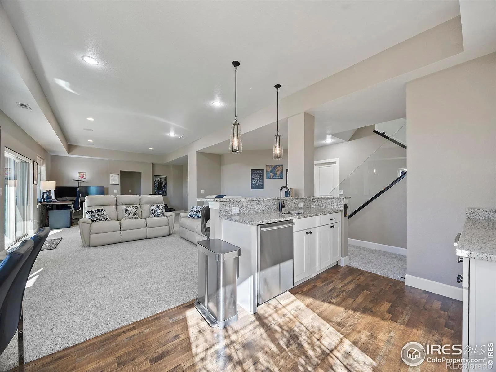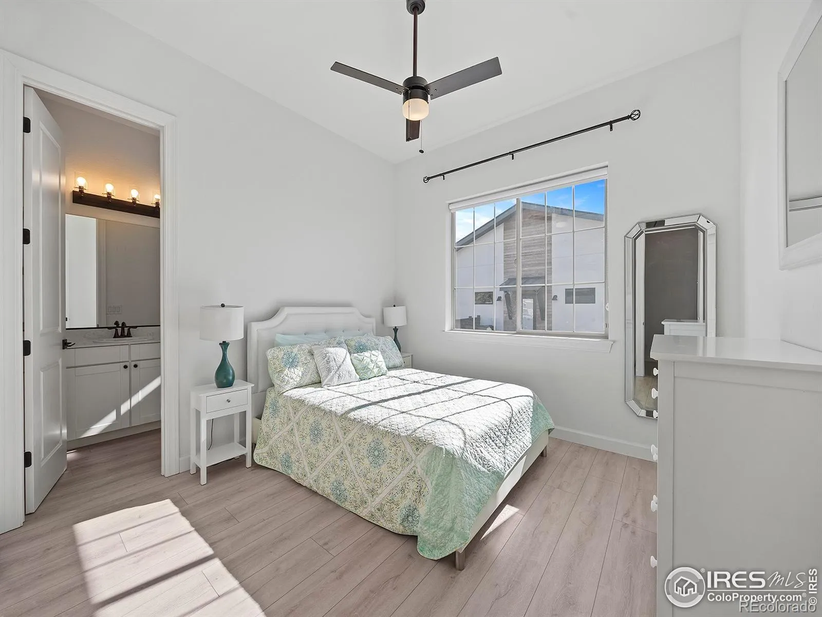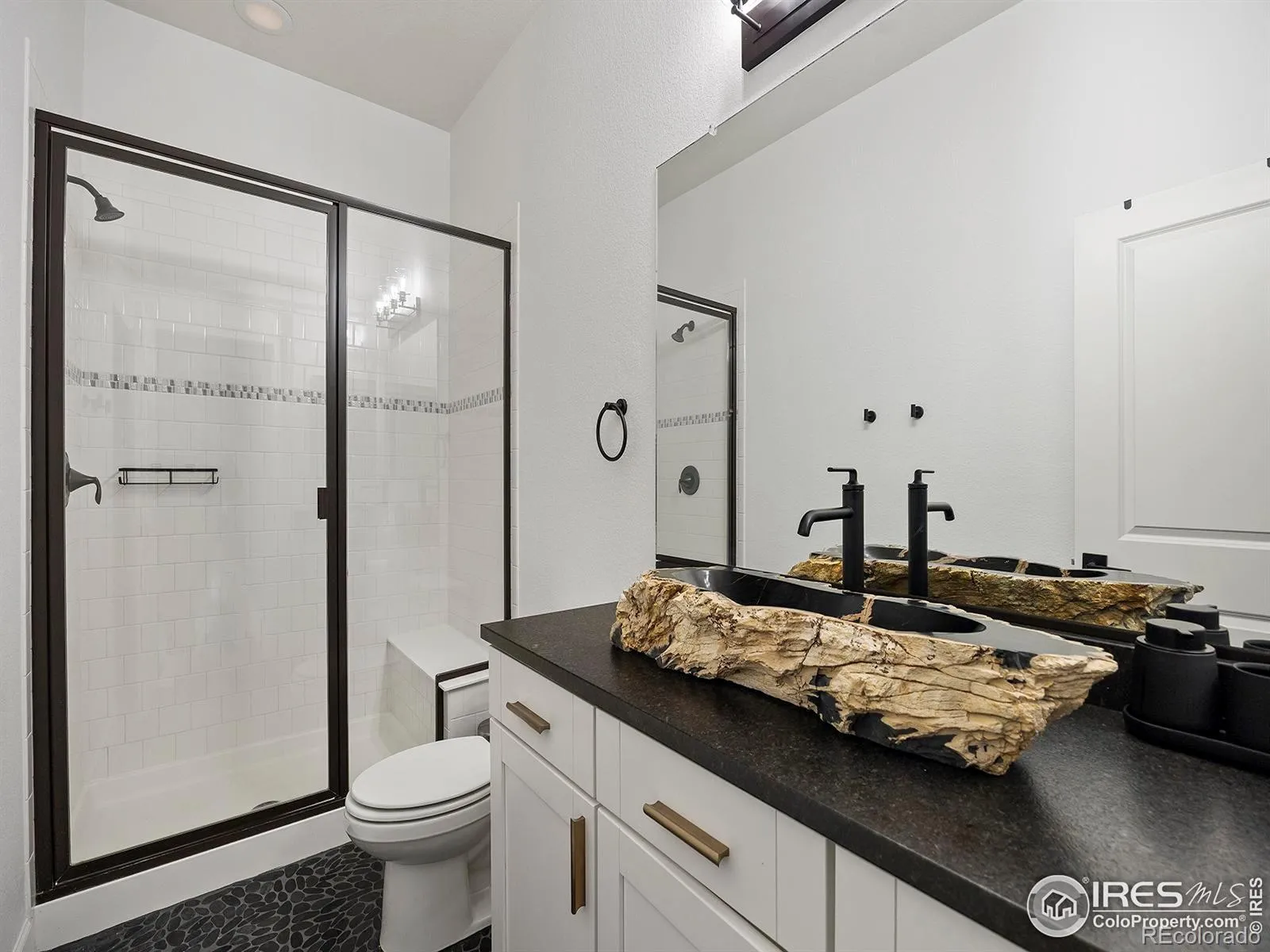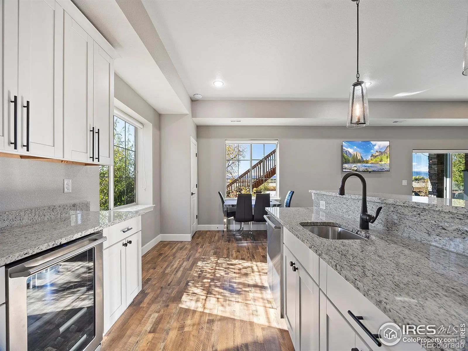 Scandi-Modern design on one of the most coveted vistas in NoCo. Step inside & the panorama unfolds-sweeping views of the Rockies & the Poudre River frame vaulted interiors & artisan finishes. The kitchen is the home’s statement of craft: white-oak slab cabinetry, mitered Bianco Superiori quartzite waterfall counters, & a warm black-walnut eat-in extension that hovers beside a stone fireplace flanked by architectural glass wine displays. Precision fluted wood flows through the kitchen into the oversized wet bar along the dining room. Hand-selected Scandinavian one off lighting illuminate the space with an effortless glow.In the great room, an 18-foot custom Venetian-style fireplace rises like an art installation, drawing the eye toward Cloud pendants above. A 14-ft sliding glass wall opens to a covered terrace where mountain vistas & the quiet presence of cattle grazing along the oxbows of the river create a cinematic backdrop.The main level features a refined guest or in-law suite, exquisite powder room with dimensional tile, a floating vanity, and a petrified-wood sink + a generously proportioned office.Ascend the custom glass staircase & cross the airy catwalk to the dedicated Owner’s Wing-a private retreat where you awake each day greeting the granite peaks. The primary bath has wonderful texture & detail, with handcrafted mirrors, floor-to-ceiling tile + a freestanding soaking tub leading into a 400 sf split dressing suite. Two additional secondary beds-each with its own en-suite bath & walk-in closet complete the upper level.The walk-out lower level offers a full wet bar, a generous rec & media area + a large home gym and direct access to the hot tub. The lower level also has two additional private bedrooms. 4 garage bays for all your toys and the beautifully landscaped lot lets you tend your bounty of organic veggies from raised garden beds as you soak up the Colorado sun. A residence of this caliber with this view is rarely offered.