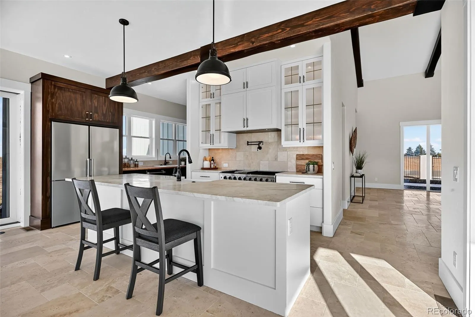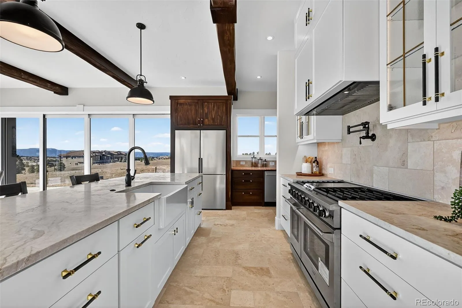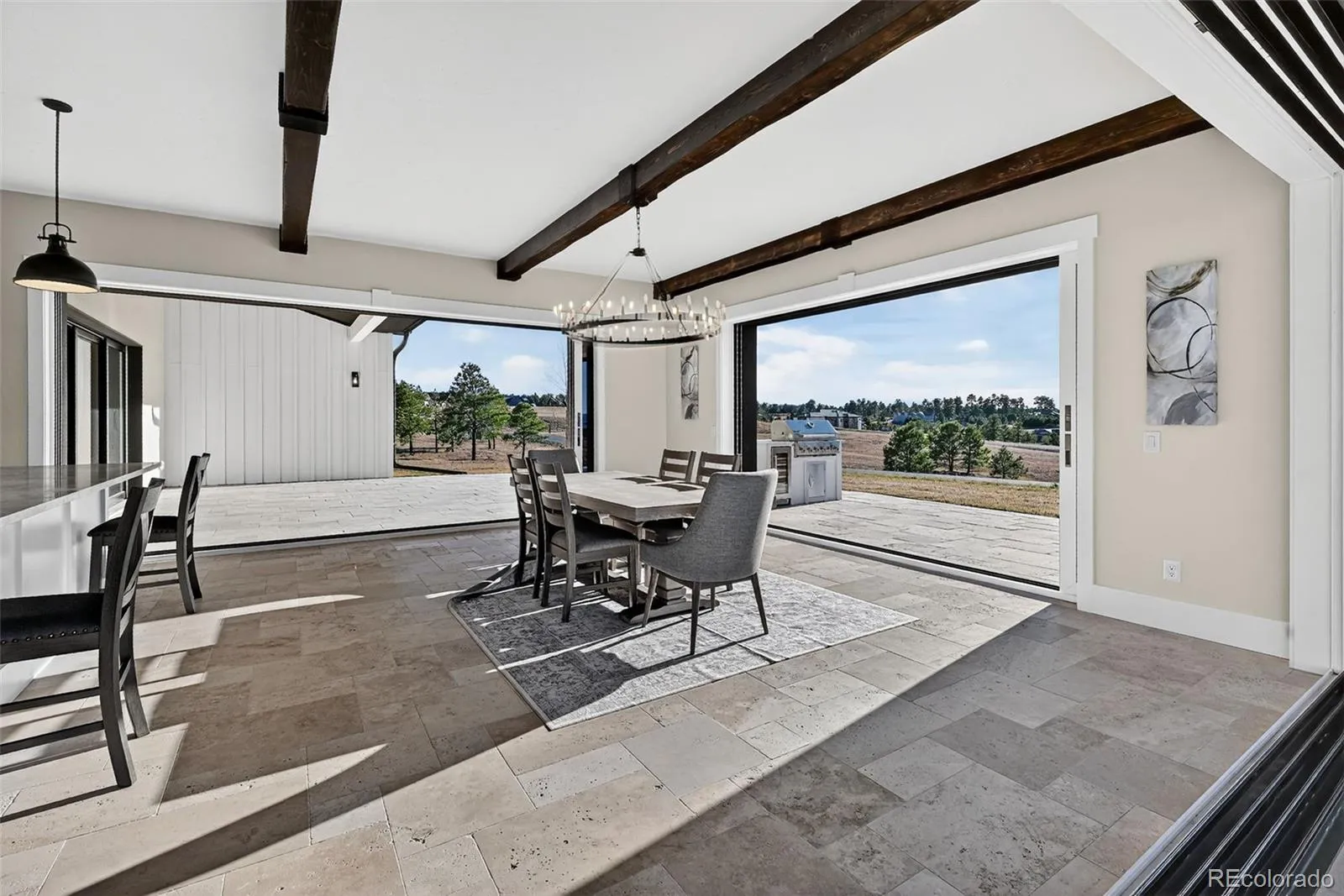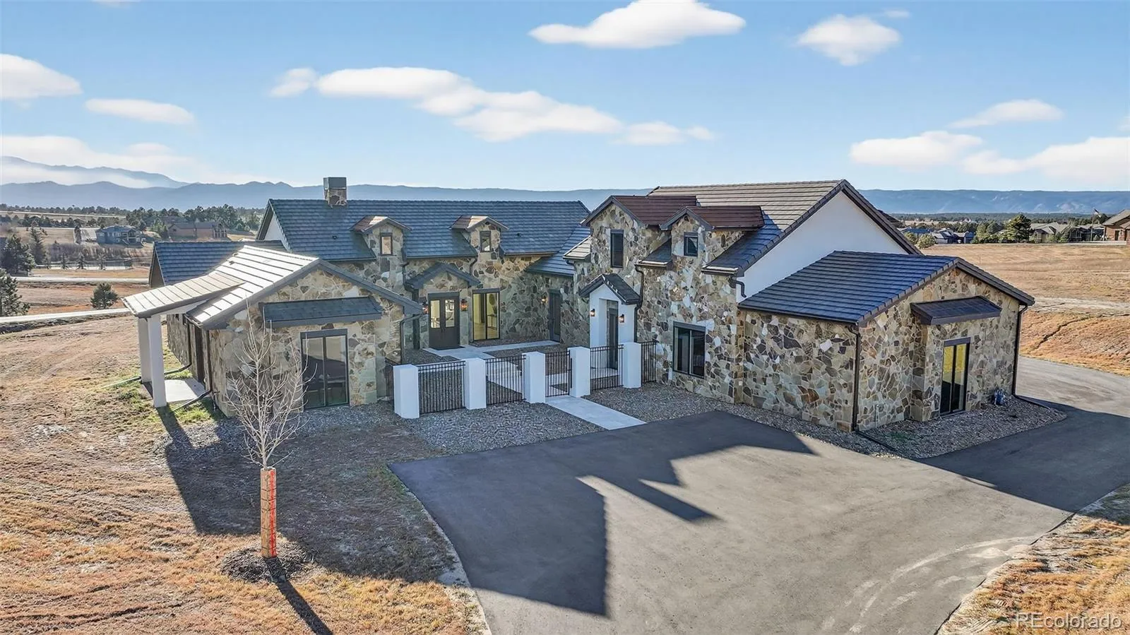 Escape the frenzied pace of Citylife! Enjoy a new lifestyle at picturesque Settler’s Ranch just 5 miles east of I-25 at Exit 162. Enjoy unobstructed views of Pikes Peak 24 hours a day from your 2.5-acre homesite. Just 25 minutes from downtown Colorado Springs and 45 minutes from the Denver Tech Center, this setting offers the tranquility you’ve imagined would for your future. This Mark Berry Custom Designed home showcases many STANDARD FEATURES that would normally be considered EXTRAS, Travertine Tile is used throughout this 1.5 level home including surfaces for the outdoor front atrium and rear patio. The Solid Core Alder Doors throughout the home, along with Custom Cabinetry, Box Beams, and Door Trims are fashioned from the builder’s mill shop. Retractable Window Walls are spectacular features adjoining the great room and kitchen. All view corridors from the interior spaces are enhanced by the thoughtful placement of windows in all rooms. “Real” stone is used on the exterior as well as the Woodburning Fireplace. This desirable floor plan includes The Great room with fireplace, 17′ ceilings (with box beams). The appealing and functional Kitchen area combines practical space with and preparation essentials including island with farmer’s sink. The rear galley area is thoughtfully designed allowing the ‘chef of the day’ the quiet space needed for their special guests!