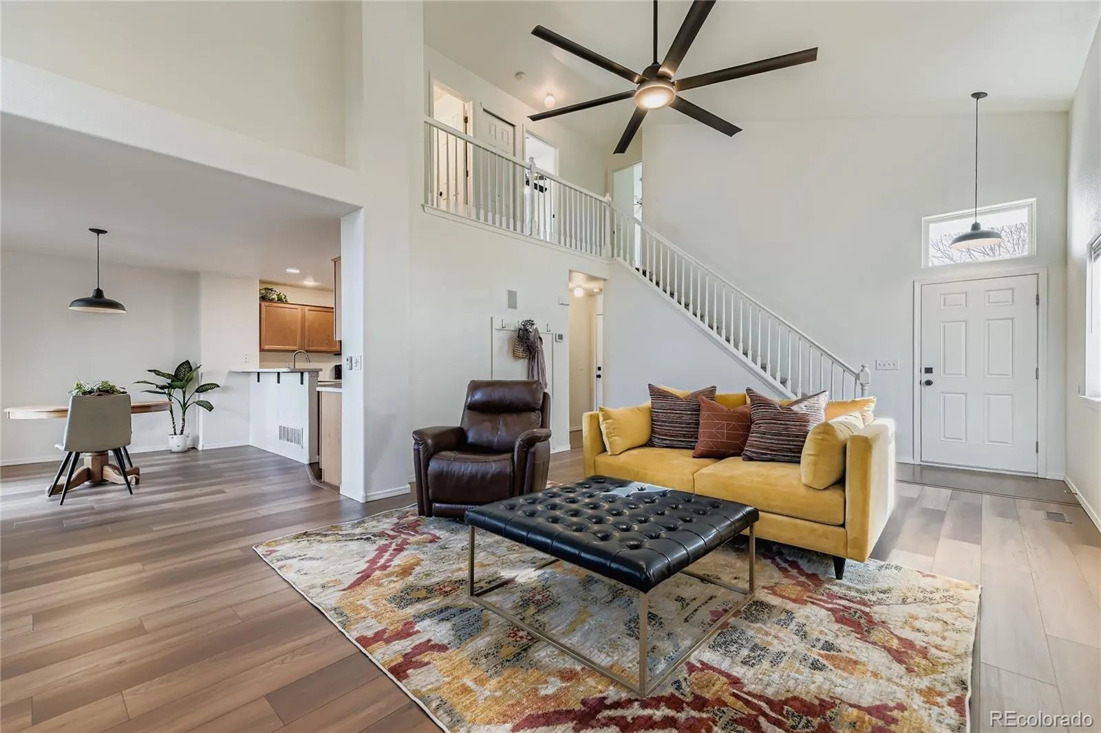 Welcome to this inviting home in Firestone’s desirable Ridgecrest community. Step into a bright living room featuring vaulted ceilings, a gas fireplace, and expansive windows that fill the space with natural light. The living area flows seamlessly into the dining room and kitchen, with the dining space offering a sliding glass door that opens to a sunny deck—perfect for outdoor meals and gatherings. A convenient half bath and access to the attached two-car garage are located just off the kitchen.