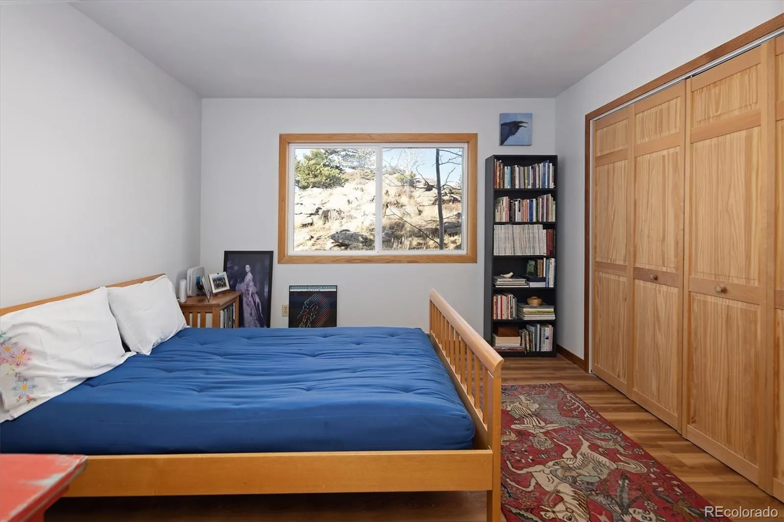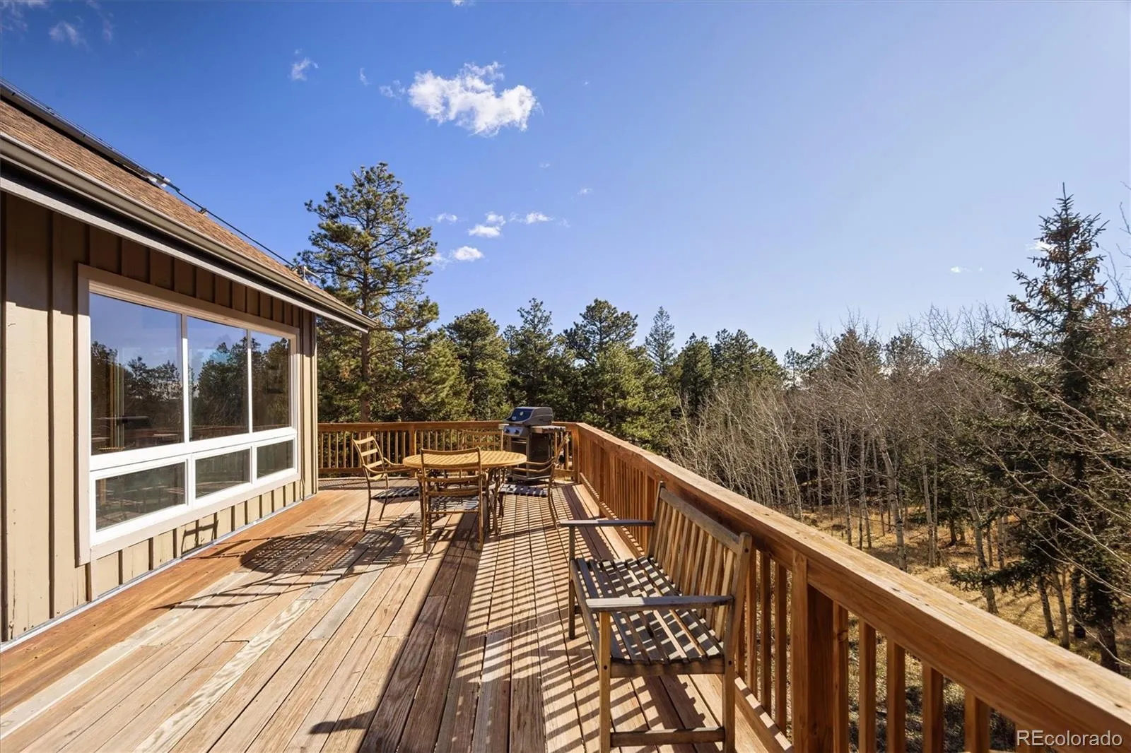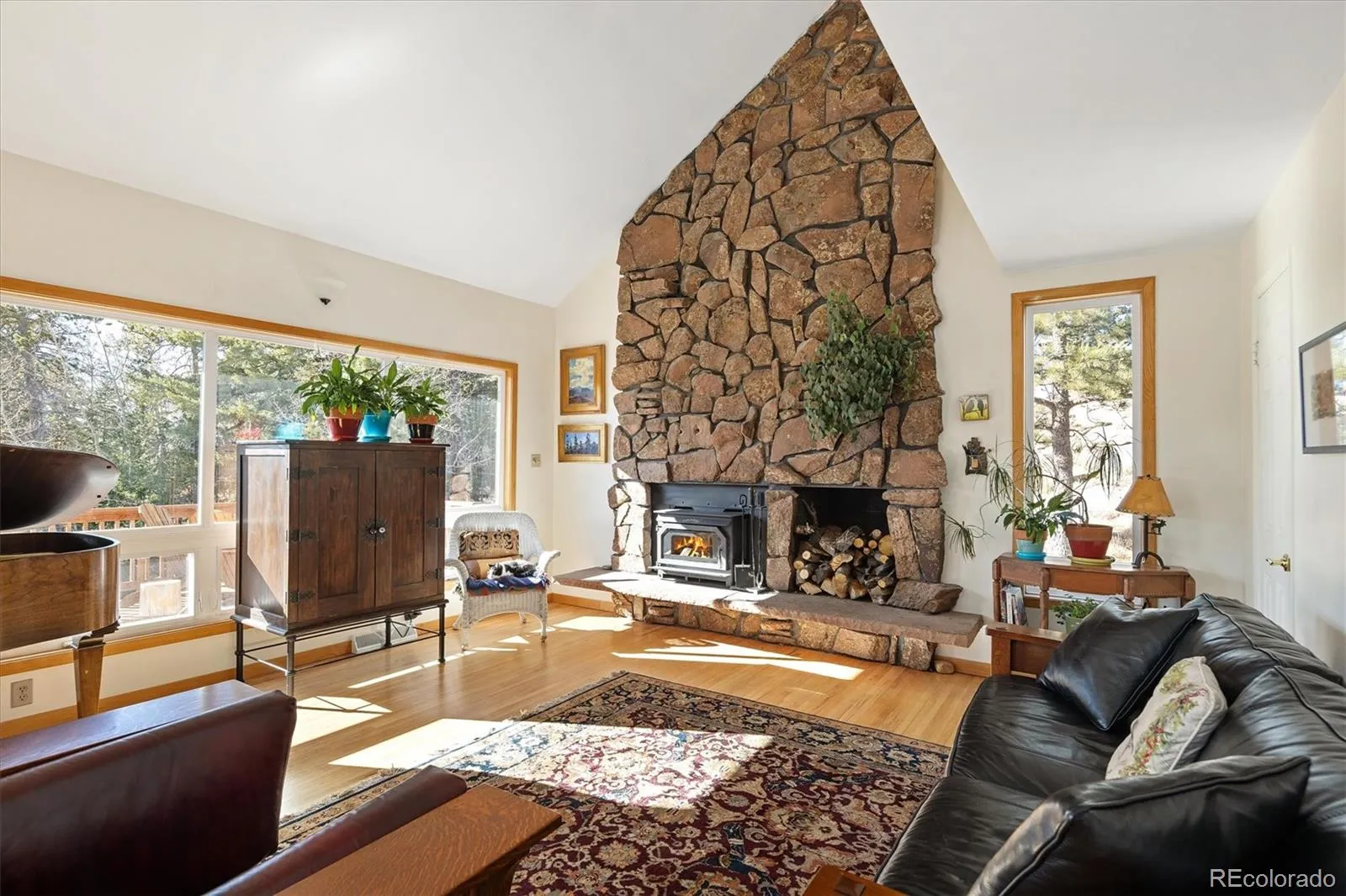 Bathed in natural light and surrounded by mature aspens and towering pines, this inviting mountain retreat offers exceptional privacy and stunning Divide views. Set against dramatic rock formations and backing to a 175-acre homestead, it provides a true Colorado mountain experience just 20 minutes from Boulder. The main level features a bright, window-filled living area with vaulted ceilings, a stone feature wall, and a wood-burning stove. The updated kitchen includes stainless steel appliances-among them a new Samsung refrigerator and new stainless steel hood-and opens to a spacious deck overlooking the landscape. A main-level bedroom offers an en-suite updated 3/4 bath and new luxury vinyl flooring. Upstairs, two bedrooms each enjoy private deck access and share a full bathroom. Wood flooring was added to both bedrooms and the office in 2022, along with new carpet on the stairs and landing. The walkout lower level provides exceptional flexibility with its own entrance, a generous living area with a gas stove, a 3/4 bath, and an additional room for office, guest space, or sleeping area. The level features new luxury vinyl flooring and fresh paint. Additional improvements include a rooftop solar system with transferable lease, a new propane furnace with whole-house humidifier (2022), a recently installed whole-house air-purifying system, and a new well pump (2025). The property offers 3-4 off-street parking spaces, ample storage and closet space, a storage shed, and a new fire-protected firewood shed with metal siding and roof. Tucked at the end of a quiet lane, this one-of-a-kind home offers peaceful mountain living with easy access to skiing, outdoor recreation, and DIA in just over an hour.