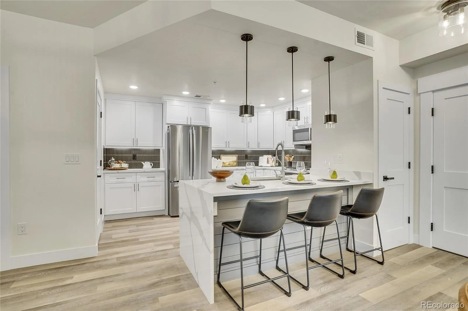 The gourmet kitchen is a chef’s delight, showcasing upgraded GE stainless steel appliances, a gas stove, quartz waterfall countertops, a spacious pantry, custom backsplash, under-cab lights, a peninsula with a breakfast bar, all framed by beautiful high quality wood cabinets with the slow close feature.