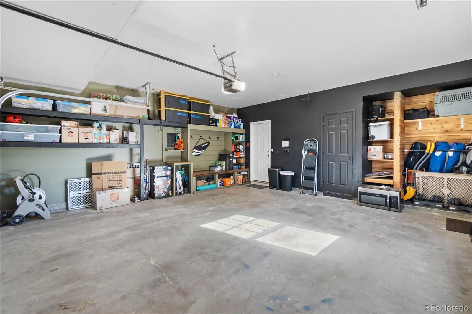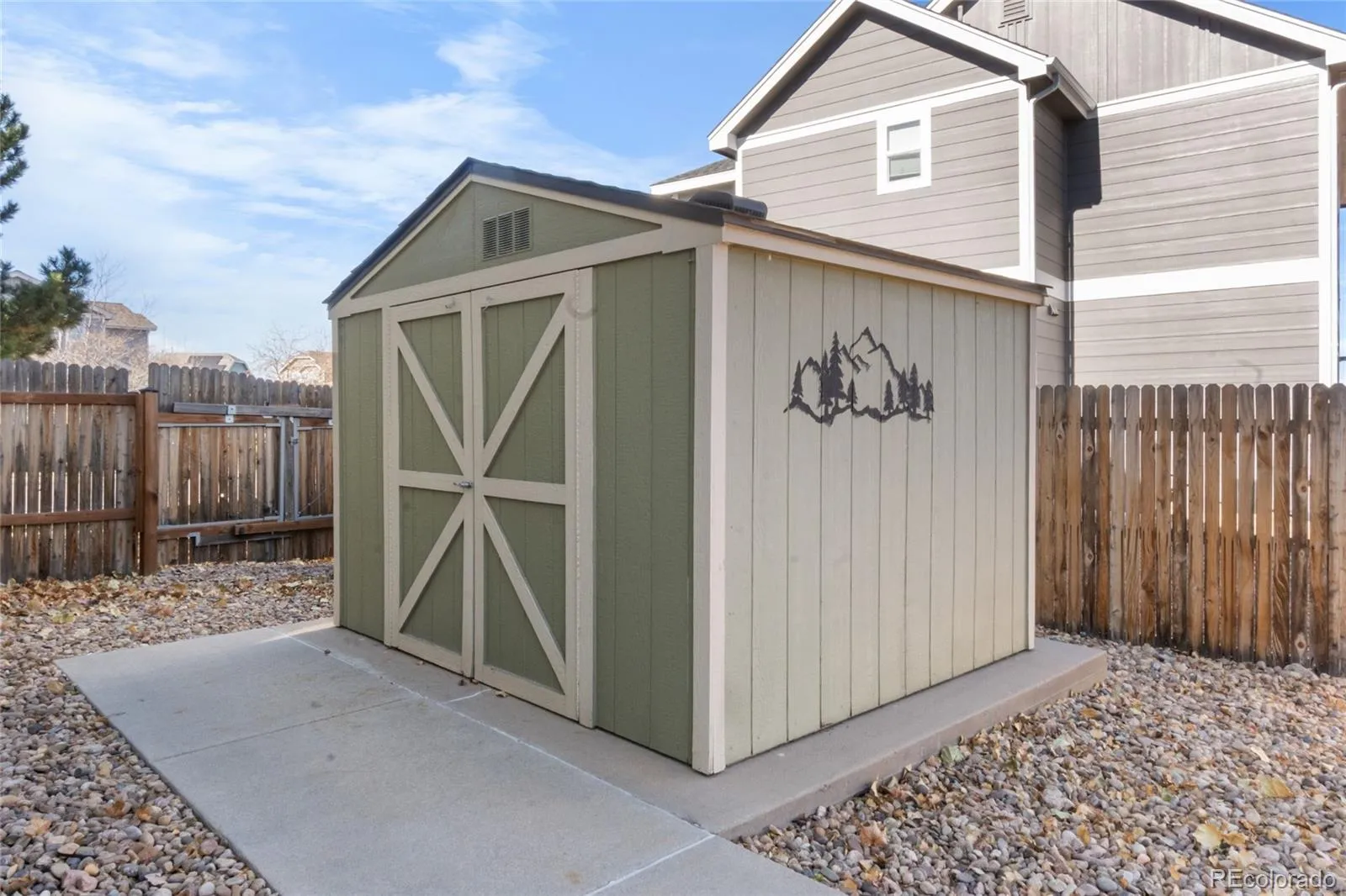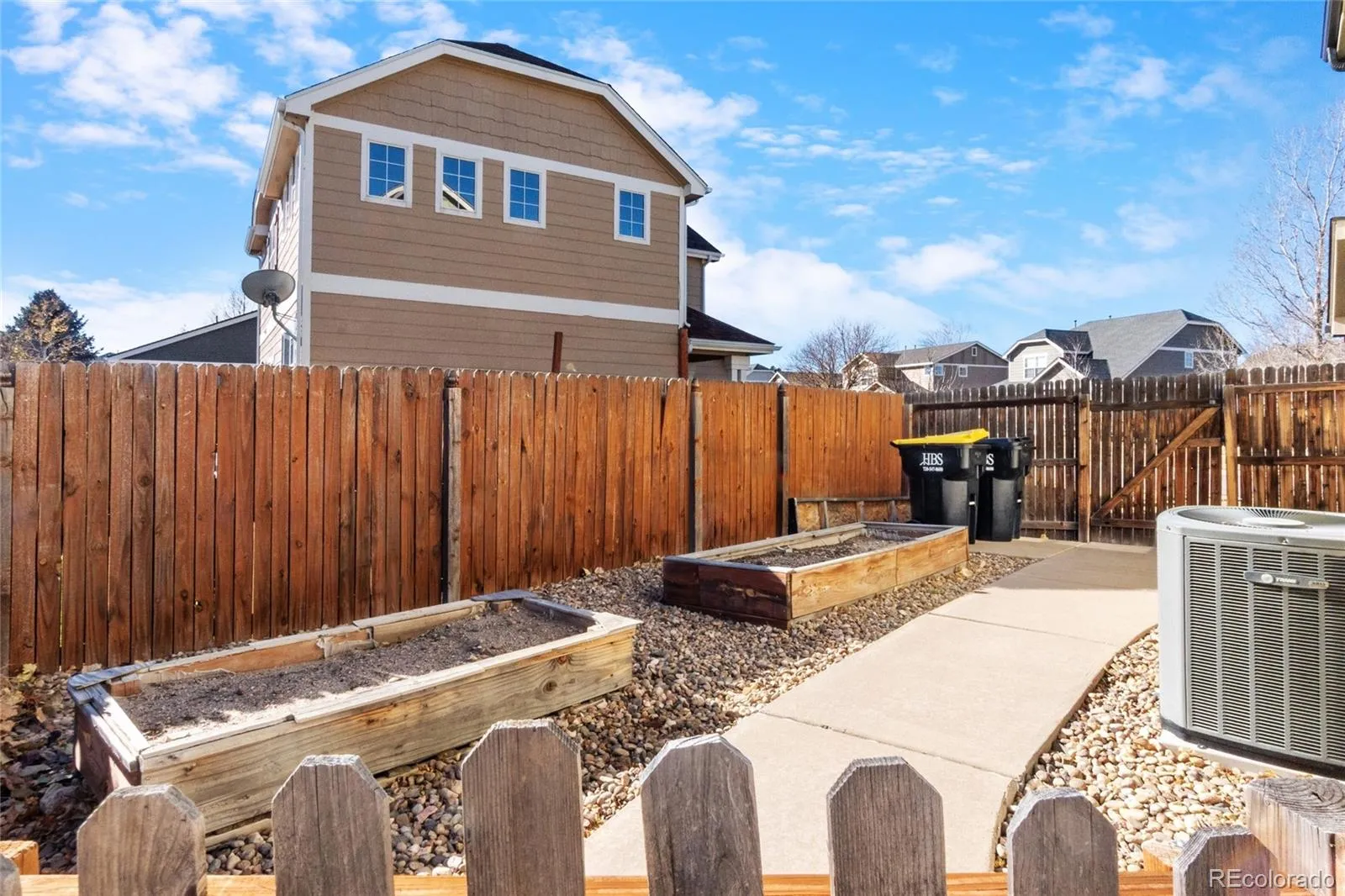 The exterior of the home showcases an impressive backyard, featuring a large concrete patio perfect for outdoor dining or entertaining. The yard includes a fire pit for cozy evening gatherings, raised garden beds for gardening enthusiasts, and a practical storage shed for all your gardening tools. An attached two-car garage provides ample parking and storage space.