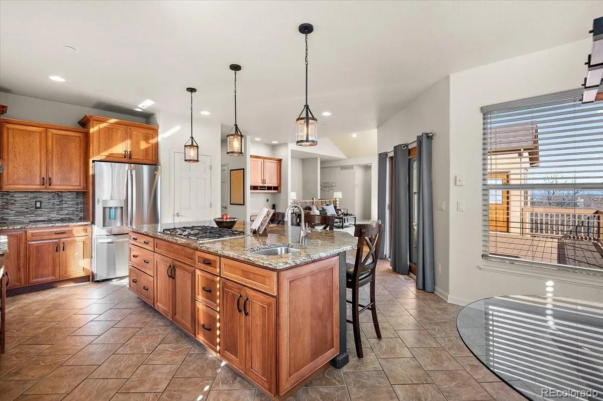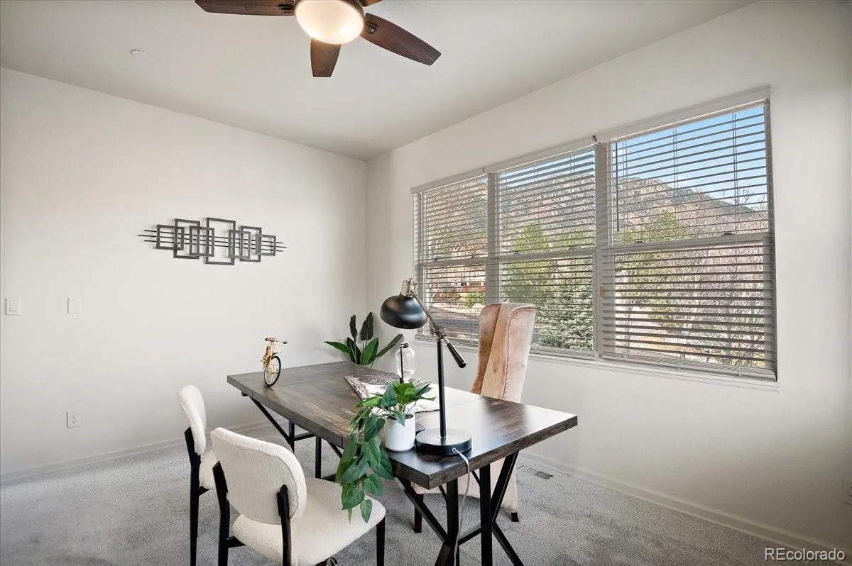 Welcome to this beautiful, move-in ready Cheyenne Mountain retreat offering over 4,300 square feet of elegant living space, stunning city lights, and mountain views—all within award-winning District 12. Set on a beautifully landscaped lot with fresh mulch added in Summer ’25, this home blends timeless design with thoughtful updates and modern comforts. A long concrete driveway leads to the three-car garage with built-in shelves and a workbench. Inside, enjoy clean lines, fresh paint, hardwood floors, 9-foot ceilings, and a bright family and dining space with beamed cathedral ceilings. A gas fireplace brings warmth, while several new windows—including the large cathedral windows installed in Oct ’25—frame incredible views and bring tons of natural light. The dream kitchen is a true centerpiece to the home and features a huge island, matching GE appliances, and a new GE refrigerator from 2024. Main floor, the primary suite offers his-and-her walk-in closets and a luxurious bath with a new frameless shower (Oct ’25), an eight-jet tub, double sinks, and a skylight. All five bedrooms include walk-in closets, and new carpet was added to the master and office in Sept ’25. The basement provides approximately 2,000 square feet of finished space perfect for entertaining and relaxing with built-in surround sound, a walkout, abundant storage, built-in utility shelving, and a Jack-and-Jill bath with separate sinks. Additional highlights include updated light fixtures, ceiling fans, a newer water heater (2022), sprinkler system, Simply Safe security system, radon system, and invisible fence. A large, freshly painted deck overlooks the peaceful yard—perfect for taking in mountain views and Colorado sunsets. With fresh updates, a spacious layout, and an unbeatable location, this Cheyenne Mountain retreat is ready to welcome you home.
