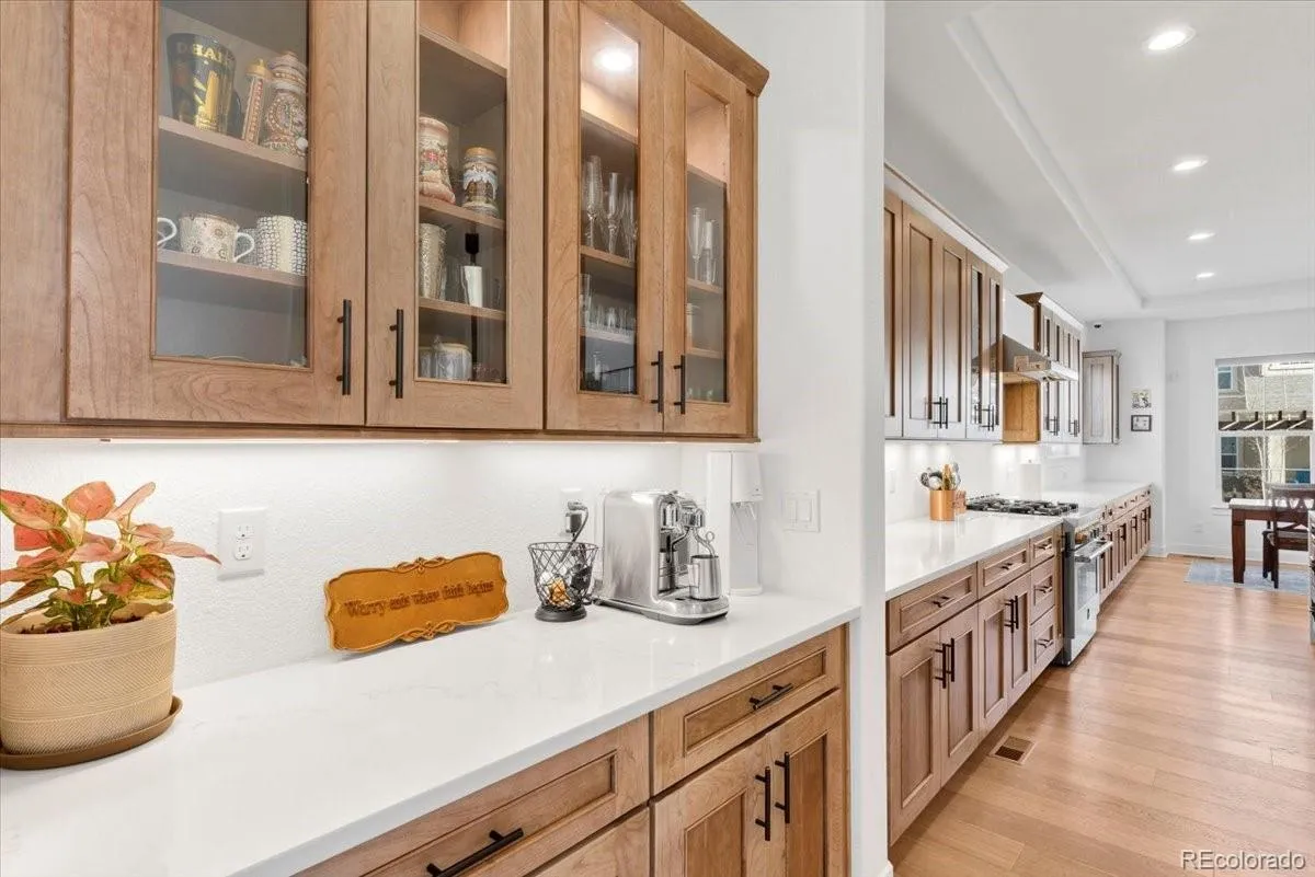 Experience refined luxury living in this extraordinary Toll Brothers Dillon model, conveniently located in the popular Southshore community. Impeccably designed and masterfully upgraded, this 5-bedroom, 5-bath residence blends contemporary elegance with exceptional comfort, offering a lifestyle that feels both elevated and effortless. Upon entry, you’re welcomed by soaring cathedral ceilings and an expansive open-concept layout awash in natural light. The chef-inspired JennAir kitchen is a true statement piece, featuring a waterfall island, premium appliances, and thoughtfully designed spaces for culinary artistry and gathering. The adjacent dining and living areas flow seamlessly to a professionally landscaped outdoor retreat, ideal for sophisticated entertaining or quiet evenings under the Colorado sky. The main level includes a private flex suite with its own ¾ bath, perfect for guests or an executive home office. Upstairs, the primary suite is an oasis of luxury, complete with a spa-caliber 5-piece bath showcasing heated floors, a standalone soaking tub, a frame less glass shower, dual vanities, and a fully customized walk-in California Closet. Three additional bedrooms, including one en-suite and a Jack-and-Jill configuration. Every corner of this home reflects thoughtful upgrades and elevated living: Hardwired Hunter Douglas smart window coverings, California Closets throughout the home, Epoxy-coated 3-car garage with wall-to-wall storage system, Full Control4 home automation for audio, video, lighting, climate, security & surveillance. The unfinished basement provides endless possibilities for customization. Situated within the Cherry Creek School District, Southshore provides a resort-style experience with two luxury clubhouses, pools, fitness centers, parks, trails, and access to the beautiful Aurora Reservoir just moments away. Thoughtfully designed and beautifully cared for, this home is a special opportunity to enjoy luxury, comfort, and Colorado living.