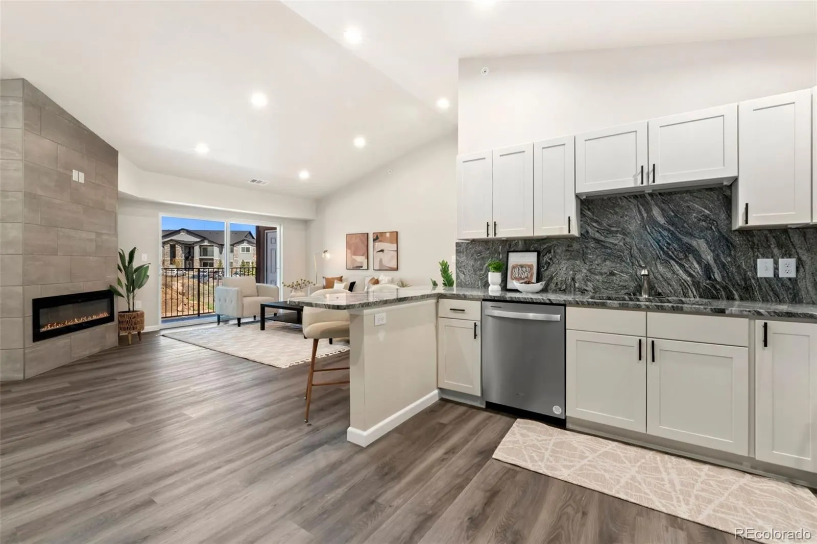 Seller is offering a $12,000 CONCESSION that the Buyer can use towards CLOSING COSTS or a RATE BUYDOWN. Discover a new level of luxury and comfort with this BRAND NEW top floor condo unit, where sweeping vistas of downtown Denver await. Offering 3 bedrooms and 2 bathrooms, this urban sanctuary combines modern design with unparalleled comfort, ensuring that every moment spent here is nothing short of extraordinary. Inside, the vaulted ceilings amplify the spacious ambiance of the open-concept living area, while the wood laminate add a touch of elegance and are easy to maintain. A cozy gas fireplace stands as the centerpiece of the living room, creating the perfect backdrop for gatherings or a tranquil retreat for relaxation. The generously sized kitchen is a dream come true for those who love to cook, featuring marble countertops that provide both fashion and function. With kitchen appliances already provided, cooking, entertaining, and settling in are all part of the seamless move-in experience. The primary suite is a personal haven complete with an ensuite bathroom and walk-in closet. Plush carpeting in all bedrooms adds a layer of comfort and warmth. Step outside to the covered patio, an additional living space perfect for sipping morning coffee or soaking in the twinkling city lights under the night sky. The patio also features a storage closet, handy for stashing away seasonal gear or outdoor equipment. Parking is never a concern with plenty of space available for you and your visitors. Situated in an excellent location, this condo offers unparalleled access to Denver, DIA, and the Metro area, allowing you to enjoy the best of city living with the entire region at your fingertips. There are multiple new units available in the building. See MLS #7543312 for a ground floor model. For all scheduled open houses, please visit the model unit #71.