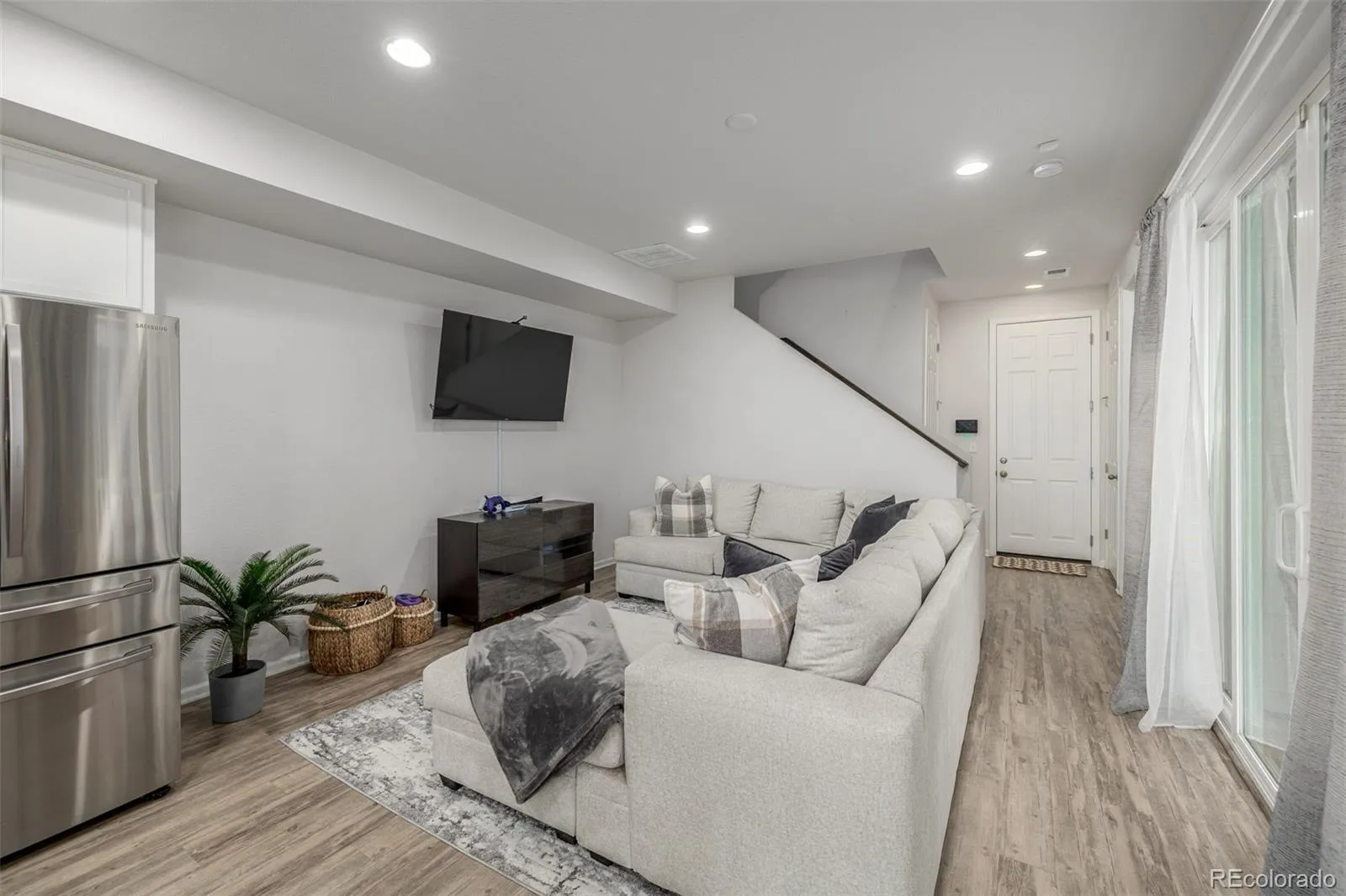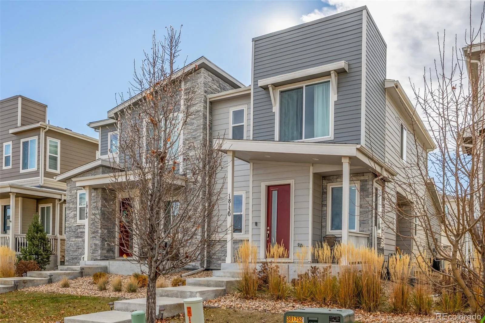 A chic modern face and striking red front door set a welcoming tone for this two story townhome. A covered front patio and a generous setback create a calming vantage point to watch the world flow by. The entry opens into a bright main level with an intuitive open plan, where dining and living areas connect effortlessly. Plank floors, recessed lights, and a neutral palette shape a warm contemporary space. The kitchen stands as a central gathering place with a large center island offering abundant prep space and seating at the breakfast bar. Pendant lights adds a refined touch, while grey counters, white cabinetry, and a cool tone tile backsplash bring visual interest and modern appeal. Stainless appliances, a pantry, and thoughtful storage support the ease of daily living. On the upper level, the private quarters are serene and well proportioned. The primary bedroom offers a calming retreat with spacious walk-in closet and ensuite with dual sinks. Two additional bedrooms provide flexibility for work, rest, or creative use. A conveniently located laundry area completes this level with practical efficiency. Outdoor living is enhanced by the covered side patio, an inviting spot for morning coffee or an evening pause. The attached two car garage is fully drywalled and offers valuable convenience along with the ease of low maintenance living throughout. This property also presents a rare financial advantage with the potential for a 2.625% assumable loan, offering a pathway to an exceptionally affordable monthly payment for the next owner and elevating the long term value of this home. The surrounding neighborhood adds meaningful appeal with several parks within a short walk, nearby shopping and restaurants, and quick access to DIA for effortless travel. From the front steps, sunsets paint the sky in vivid color, a daily moment cherished for its calm and beauty. This residence pairs style, comfort, and connection with a location that places every convenience within reach.