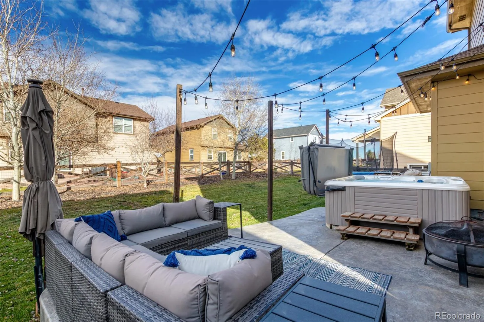 Step into a Banning Lewis Ranch home that’s ready to enjoy from day one! This beautifully maintained 5-bedroom, 3.5-bath residence blends modern upgrades, flexible living spaces, and a true community lifestyle—ideal for buyers seeking comfort, convenience, and room to grow. Rich hardwood floors, 9 ft ceilings, and fresh neutral paint set an inviting tone. A corner gas fireplace connects the living and dining rooms, creating a cozy Colorado backdrop. The gourmet kitchen features granite counters, a center island, double oven, gas range, pantry, and new gold hardware. The dining area opens to a stamped concrete patio with a hot tub that stays, offering easy indoor–outdoor flow. A large front porch with Pikes Peak views provides a relaxing spot to enjoy Colorado sunsets.