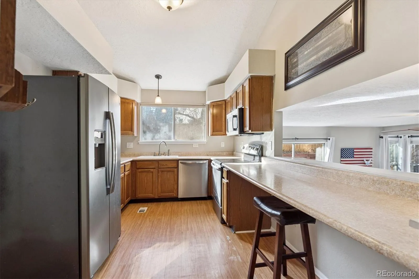 Welcome to an elegantly updated home with soaring vaulted ceilings, abundant natural light, and flexible living spaces throughout. A charming craftsman-style entry opens to the stunning living room with dramatic volume and a seamless flow to the dining room and beautifully appointed kitchen with expansive countertops, generous cabinetry, newer appliances, and a wide picture window that frames the backyard. The lower level adds a spacious great room with sliders to the patio and an updated powder bath—perfect for movie nights, play space, or a home office.