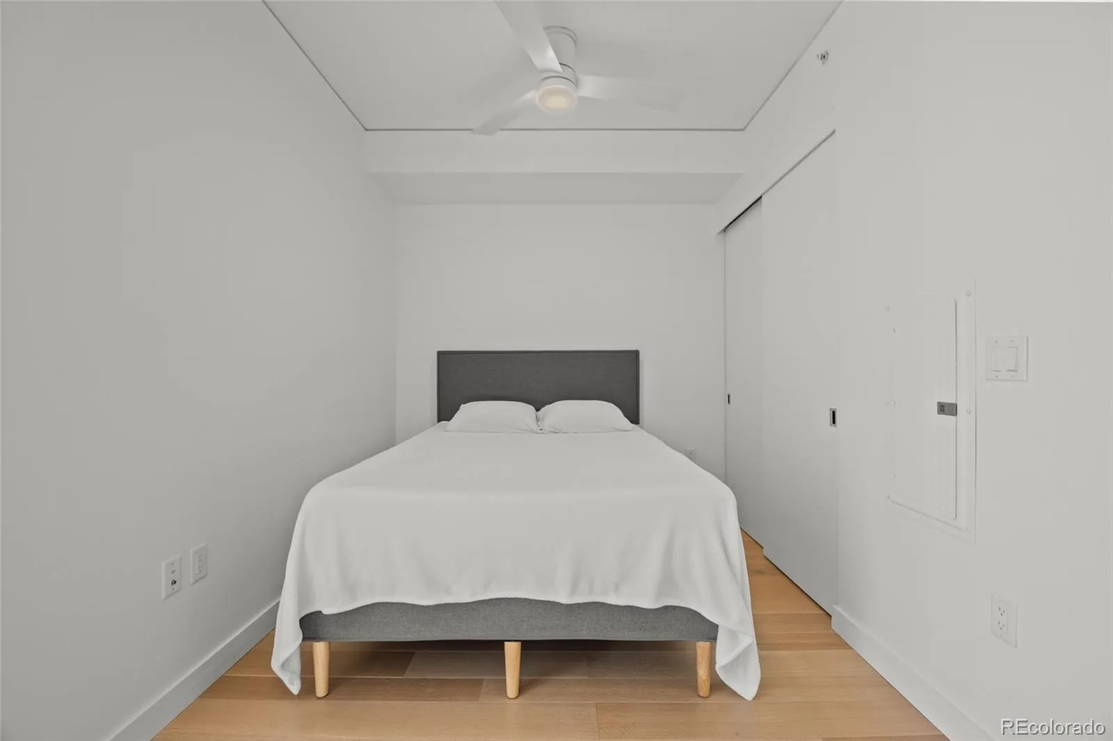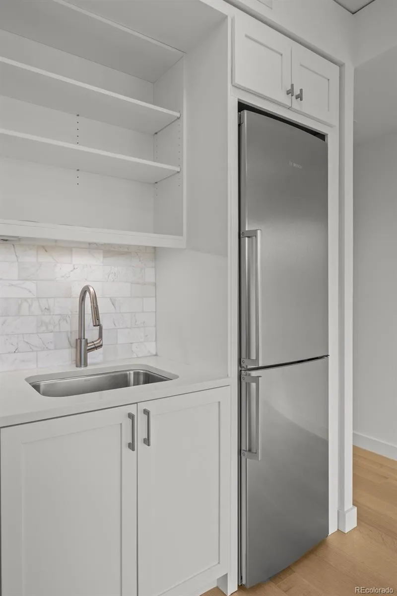 The living area is bathed in morning light, offering a mesmerizing portrait of Union Station and the city, with enchanting sunsets casting a magical glow throughout the space. The bedroom, tucked into an alcove, is ideal for restful slumber and includes an overhead ceiling fan with adjustable lighting, along with a custom closet system.