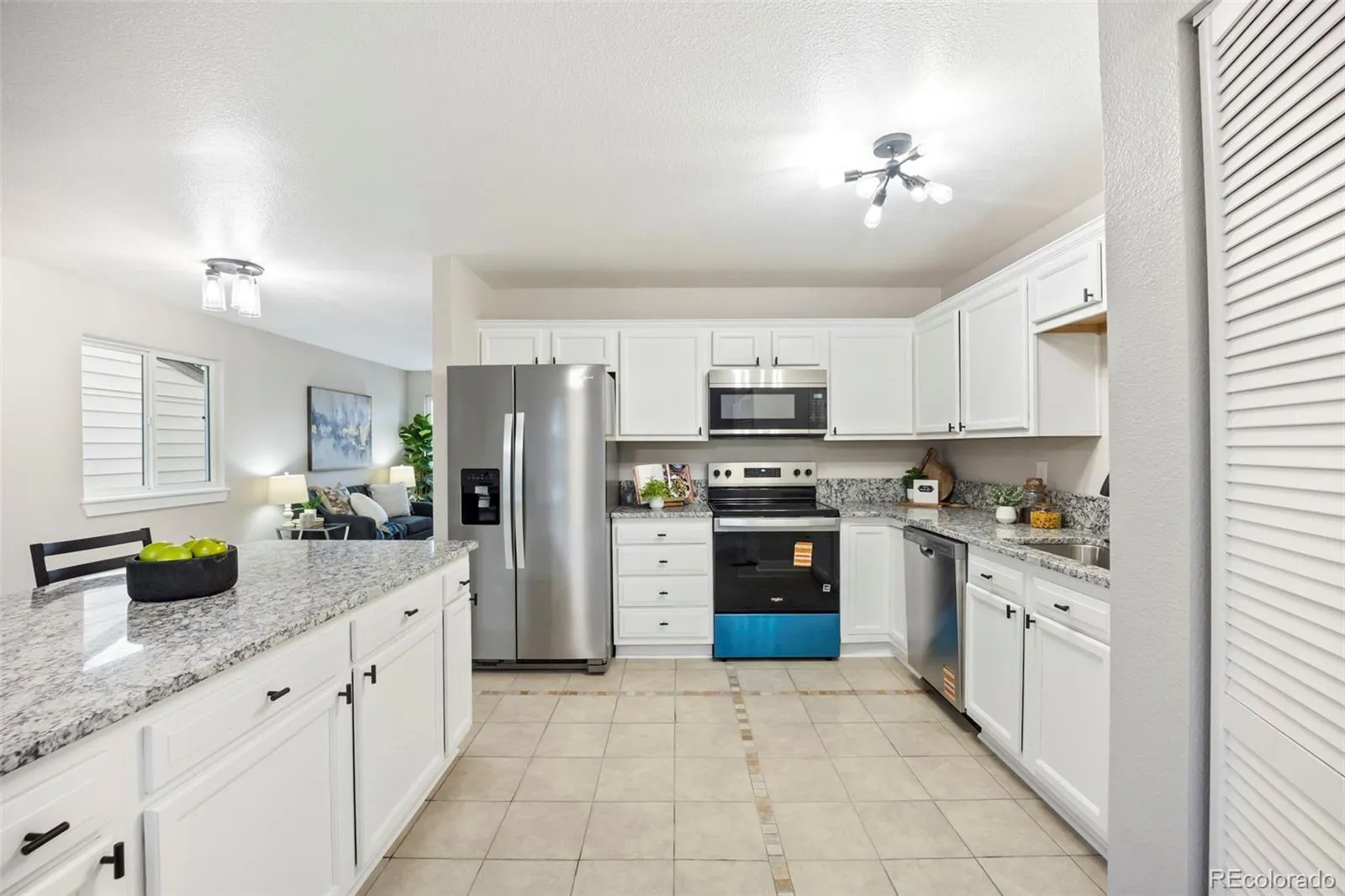 The beautifully remodeled kitchen brings the heart of the home alive with white cabinetry, slab granite counters, stainless steel appliances, and a spacious island perfect for gathering. Dual skylights brighten the dining area with natural light, while a sliding glass door offers an easy connection to the backyard.