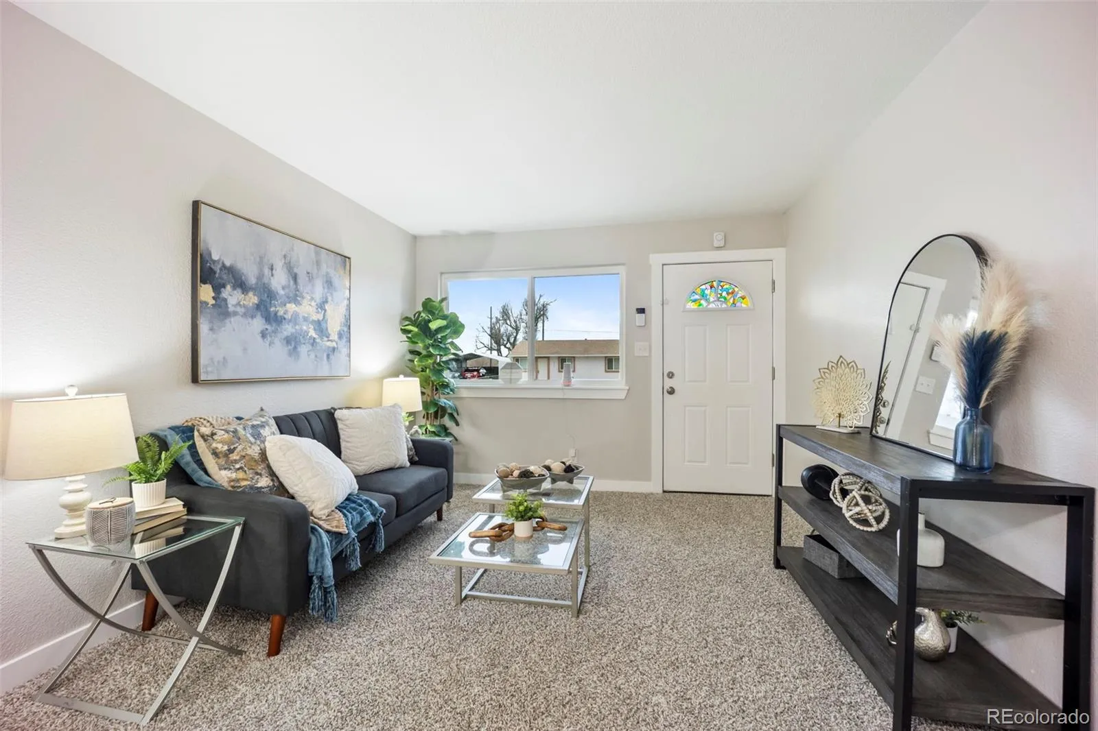 The crisp white exterior, rustic wood shutters, low-maintenance, fully fenced front yard and clean paver walkways lead indoors to a sunlit living room with fresh paint, plush new carpet, and soft updated lighting. The layout flows easily into the kitchen and dining areas, keeping everyday living connected and comfortable.