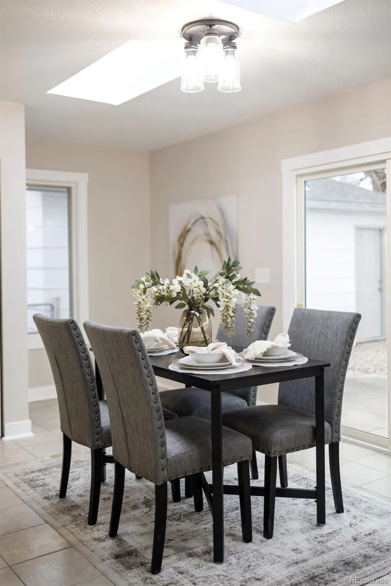 The beautifully remodeled kitchen brings the heart of the home alive with white cabinetry, slab granite counters, stainless steel appliances, and a spacious island perfect for gathering. Dual skylights brighten the dining area with natural light, while a sliding glass door offers an easy connection to the backyard.