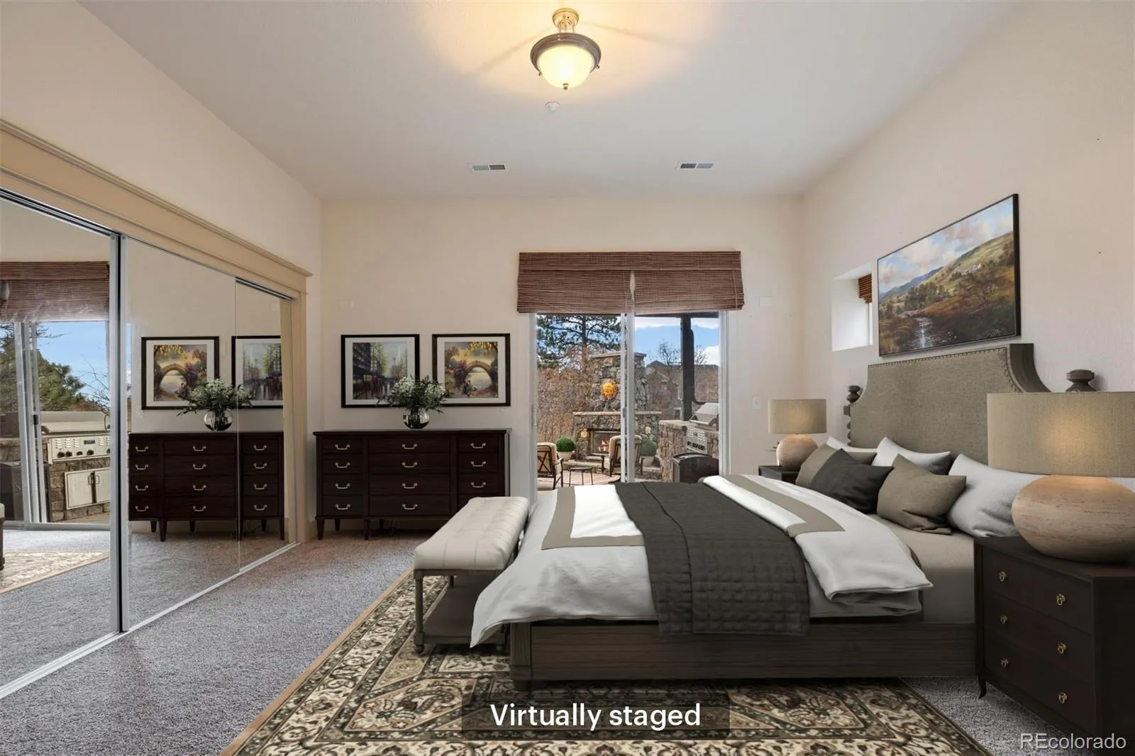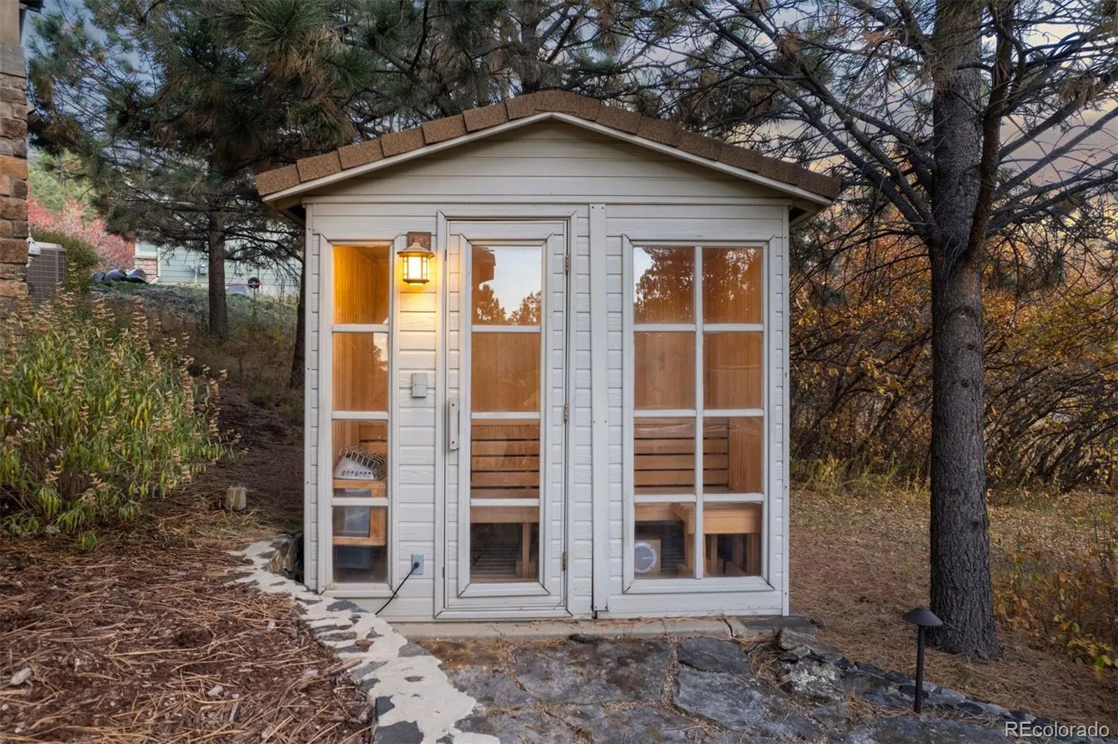 Experience elevated Colorado living outdoors on the covered flagstone patio, complete with built-in gas grill, outdoor gas fireplace, dry sauna, and hot tub, all surrounded by mature native landscaping that enhances both privacy and natural beauty.