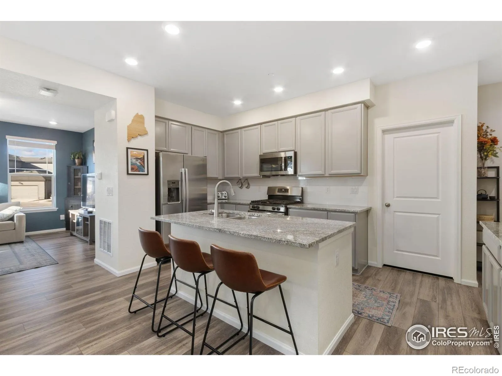 This beautiful paired home in Mosaic blends elegant finishes, a thoughtful floorplan, and amenities that truly set it apart. Step inside to a bright landing that opens into a sun-filled living area. The dining and kitchen spaces flow seamlessly together – ideal for daily living and entertaining – complete with a gas range, generous counter space, and a spacious pantry. A standout feature of this home is the main-level bedroom/flex space paired with a nearby 3/4 bath, offering excellent potential for multi-generational living or a private guest retreat. Upstairs, the primary suite sits conveniently next to the laundry room, while two additional bedrooms share a full bath and a versatile loft perfect for a workspace or lounge. The low-maintenance backyard is fully xeriscaped and includes raised planter boxes ready for spring planting. With no metro district tax and a low HOA that covers access to two pools, a clubhouse, and miles of walking paths, this home offers quiet comfort, community living, and the best of Fort Collins convenience.