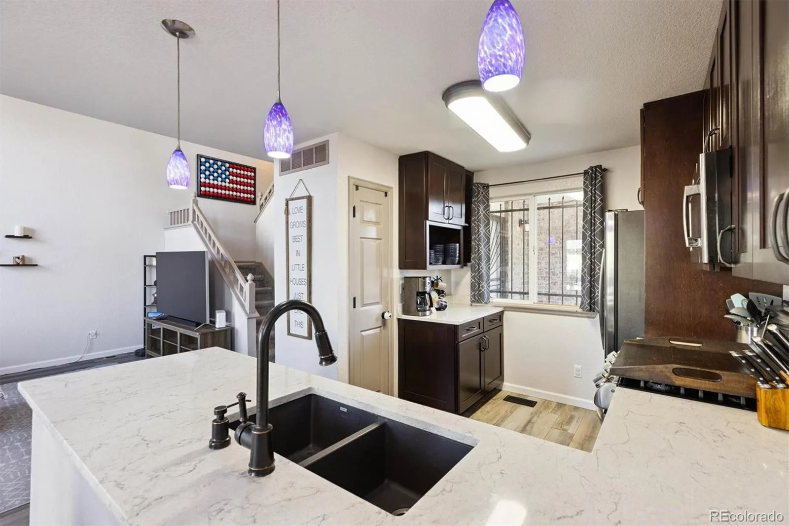 You will fall in love with this beautifully updated 4BR, 4Bath home in a super convenient location – and best of all, there’s no HOA! This charming two-story duplex truly lives like a single-family residence. Located on a tree lined street, this home offers an incredible amount of space and privacy, perfect for any lifestyle. The heart of the home is the updated kitchen with coffee bar, gorgeous quartz countertops, soft-close cabinets, pantry, and stainless steel appliances – including a gas range and a coveted double oven with convection. Large windows and a vaulted ceiling make the main level living and dining spaces bright and airy. Also on the main level are the conveniently located full-size laundry room and half bath. Upstairs, the primary suite features a beautifully updated en-suite bathroom, walk-in closet, and great natural light. Two additional bedrooms and another full bathroom are also located on the upper level, offering plenty of space for family or guests. The finished basement offers a large, versatile area—perfect as a playroom for the kids or a media room—along with the fourth bedroom and 3/4 bathroom. Throughout the home, you’ll appreciate the new carpet, central AC, a whole house fan, and a new-ish (2019) furnace for year-round comfort. Plus, a radon system is already installed for your peace of mind. The fully fenced backyard includes a lovely patio, ideal for summer BBQs and relaxing evenings. Parking is easy with the 2-car attached garage with south facing driveway. For commuters, you can’t beat this location, just 2 minutes to I-25 and the RTD Park and Ride. This is the one you’ve been waiting for! Don’t miss the chance to make this exceptional house your new home. ** Showings start Friday, Nov 28 **