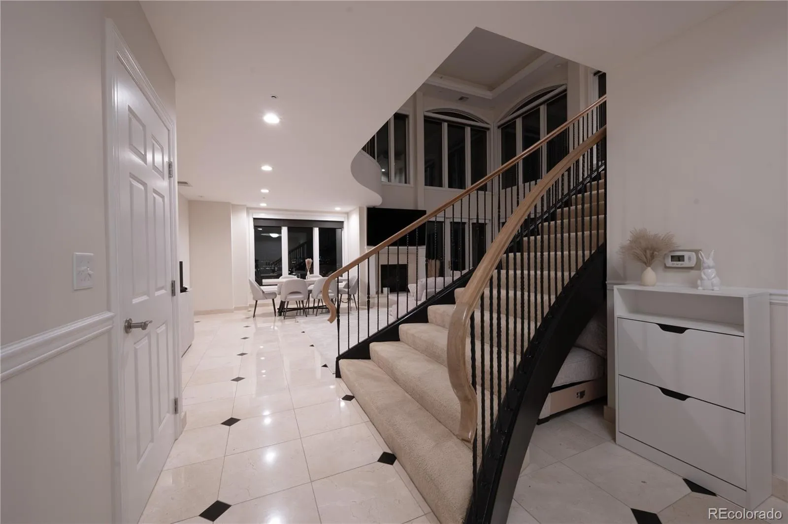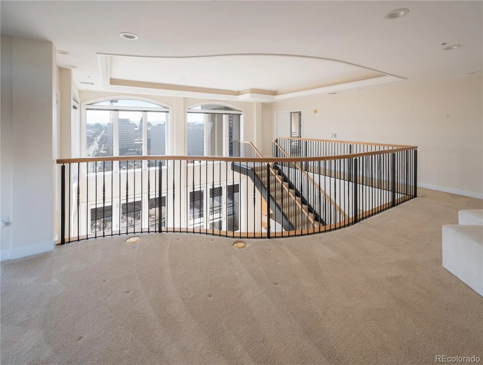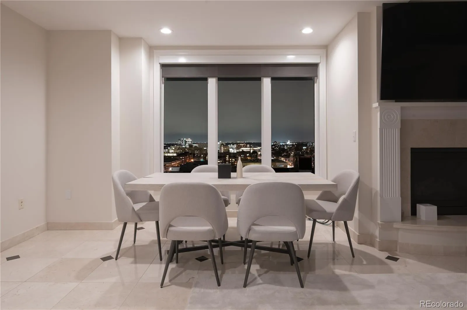 CITY VIEWS FROM PRESTIGOUS PORTOFINO PENTHOUSE TO LIVE AND ENJOY! The Portofino Tower in Denver is offering a unique opportunity to own a luxurious two-story, 2-bedroom, 2.5-bathroom penthouse. This residence offers an upscale, yet relaxed, atmosphere, featuring striking 20-foot-high ceilings and views towards the State Capitol building in the southeast. Abundant natural light permeates the open and airy layout. The main level includes a generous living area with an emphasis on open-concept design, a cozy fireplace, a dedicated dining space, remote-operated window coverings, and marble floors throughout. The kitchen is fully equipped with granite slab countertops, a breakfast bar, stainless steel appliances, and opens onto a spacious terrace, perfect for quiet mornings or social evenings.