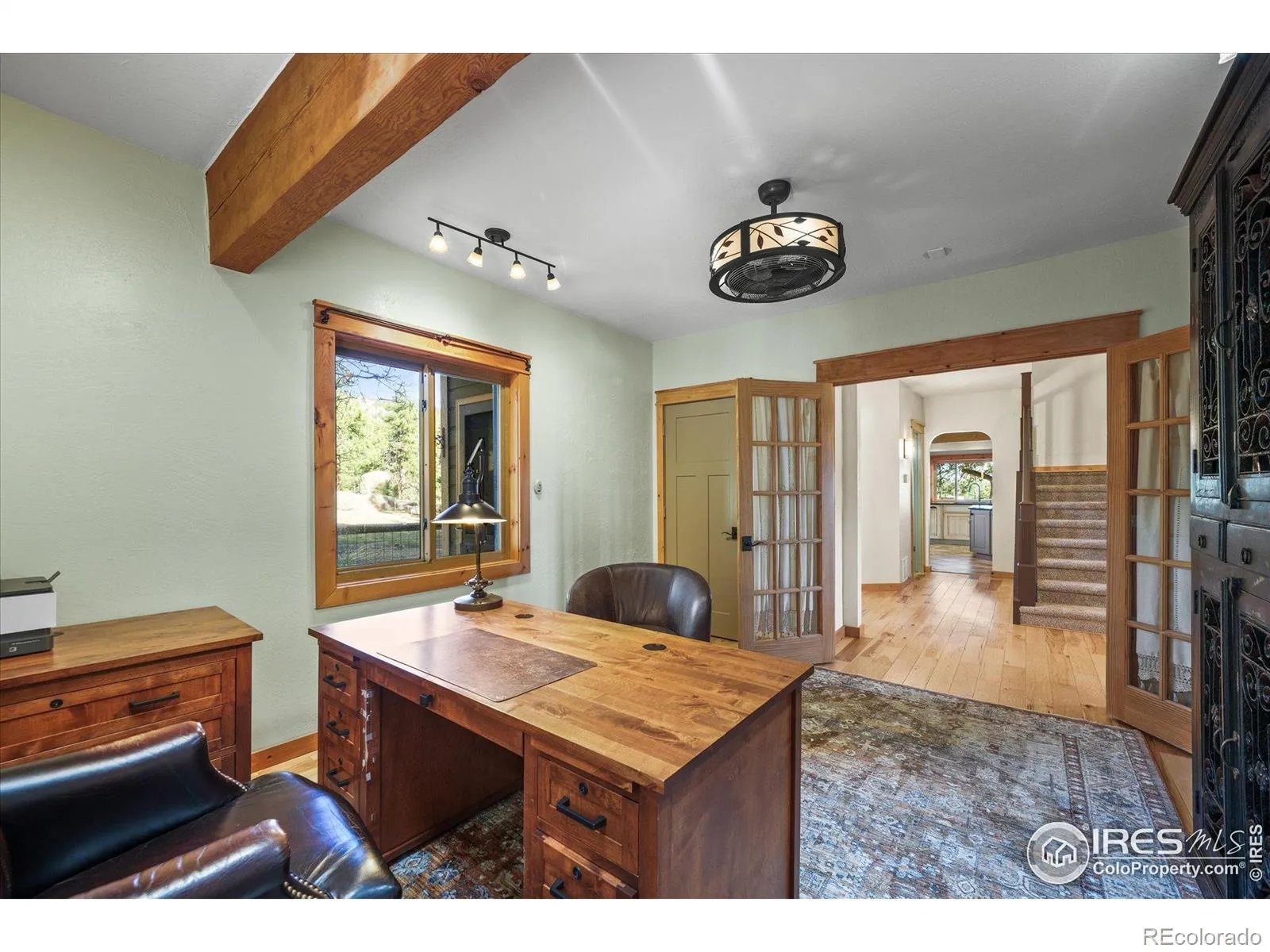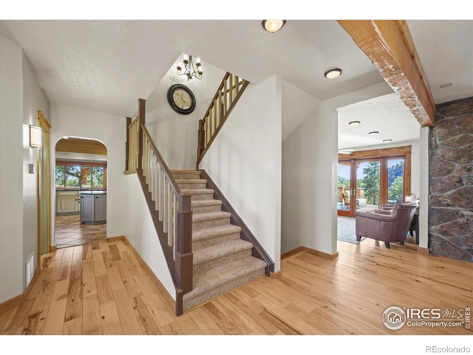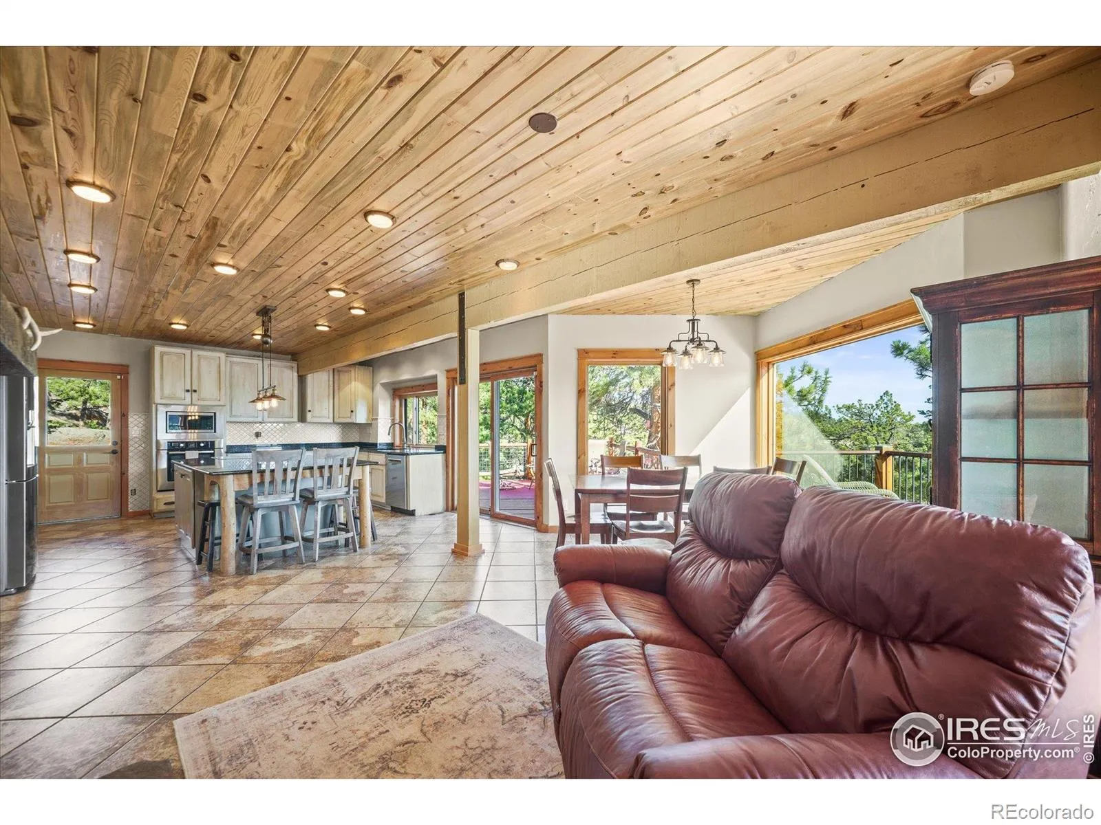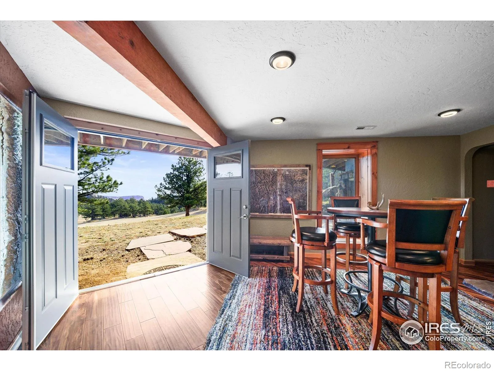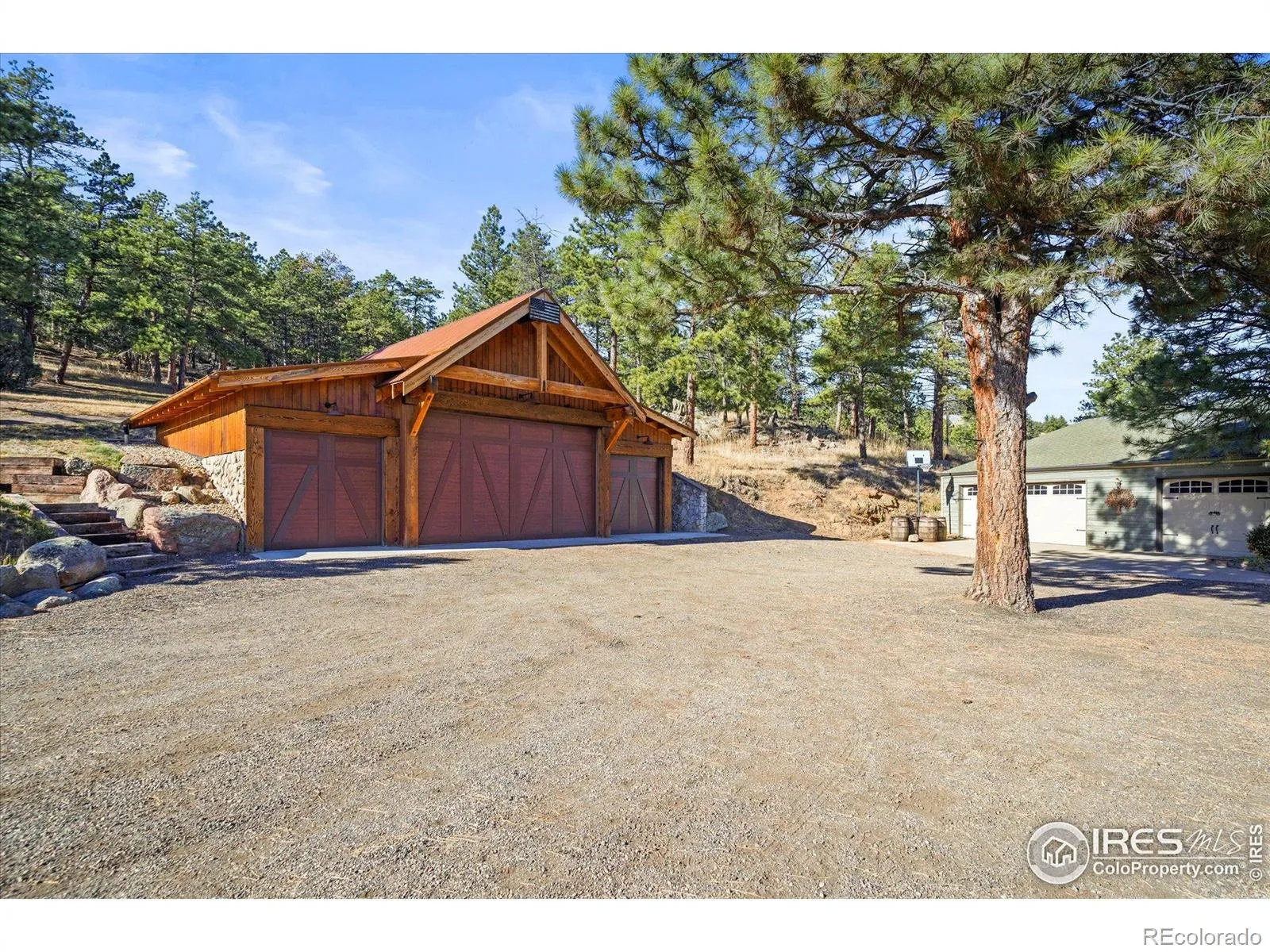 Dreamy Mountain Retreat on 33+ private acres with breathtaking mountain, valley and Denver city-light views from every room. You’ll be intrigued by the Vail & Aspen inspired colors and design with stunning architecture including some timber-frame elements, hardwood floors, exposed beams and 9′ ceilings. Sophisticated kitchen adjoins the dining area with fireplace and expansive windows framing the spectacular scenery. Wrap-around deck is perfect for outdoor entertaining or enjoying wildlife. Or cozy up in the living room with fireplace that provides a welcoming space for winter evenings while a separate living area extends to the covered porch that invites morning coffee or quiet time. Main floor 4th bedroom with 3/4 bath or use as study/office. Bask in the elegant primary bedroom featuring en-suite bath, 2 closets & balcony overlooking the panoramic views. 2nd floor with 2 additional bedrooms, full bath and spiral staircase leading to a finished loft – an ideal tree-house-style office or extra living space. There’s a must-have finished walkout basement with rec room, office (could be non-conforming 5th bedroom) or easily convert to an ADU (has 2nd sink & laundry hook up). Car enthusiasts, hobbyists or those seeking a workshop will appreciate the detached 4-car garage (1,160 SF) with steel beams, concrete walls, cedar siding, COR-TEN metal roof. Breezeway-attacheds to 3-car garage with built-in shelving, workbench, 220V & 2 mini-splits for heating & cooling. The home is thoughtfully equipped with Central AC, two furnaces, tankless water heater and a high-producing domestic water well for effortless comfort. Nestled among natural forest, open meadows and rock outcroppings, this property feels like a private state park. Just outside Boulder with the hip town of Lyons just minutes away and larger shopping in Boulder or Longmont just a short drive further. A true sanctuary that offers privacy, beauty and an unmatched lifestyle. Hurry this one won’t last long!
