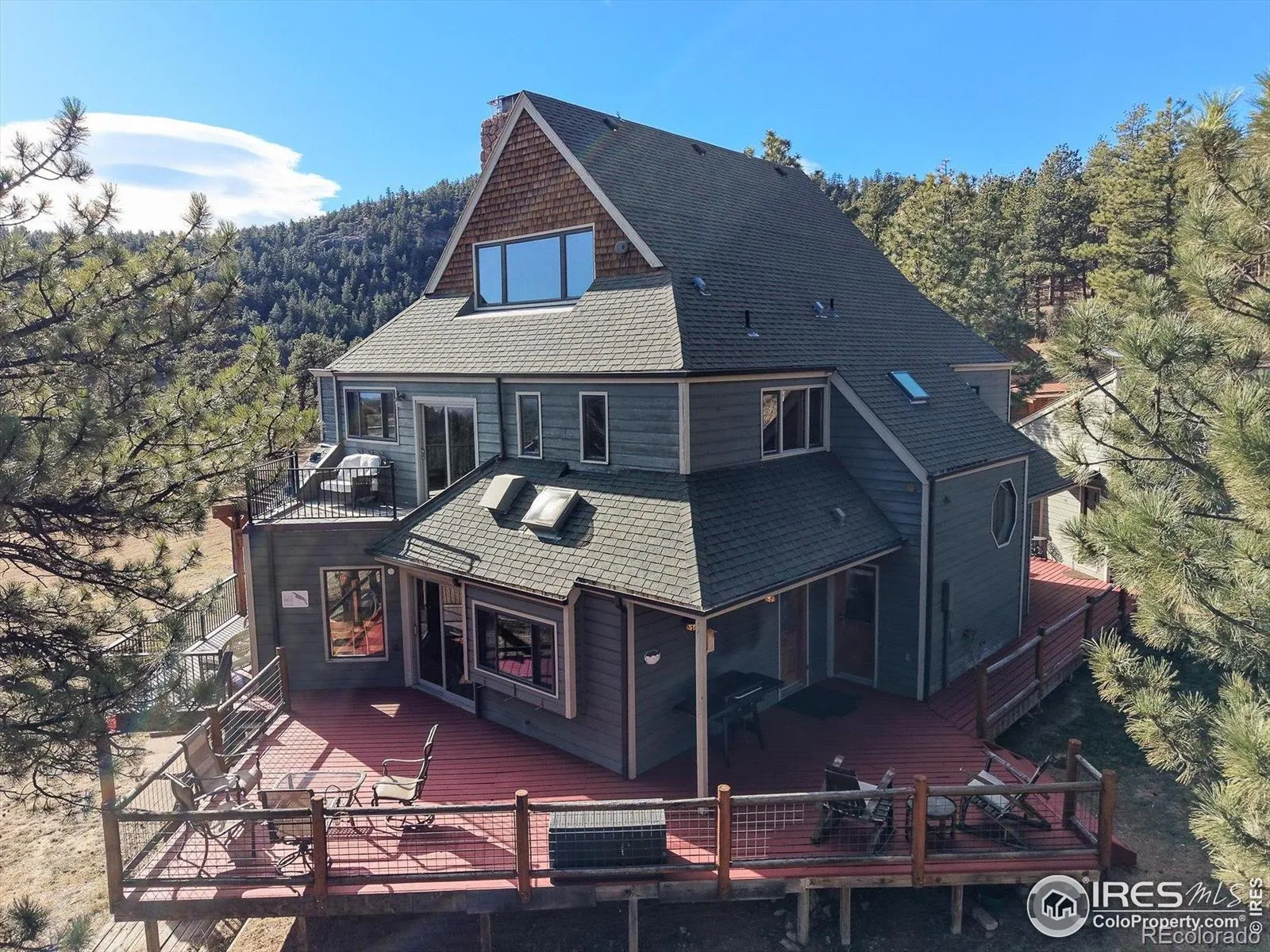 Dreamy Mountain Retreat on 33+ private acres with breathtaking mountain, valley and Denver city-light views from every room. You’ll be intrigued by the Vail & Aspen inspired colors and design with stunning architecture including some timber-frame elements, hardwood floors, exposed beams and 9′ ceilings. Sophisticated kitchen adjoins the dining area with fireplace and expansive windows framing the spectacular scenery. Wrap-around deck is perfect for outdoor entertaining or enjoying wildlife. Or cozy up in the living room with fireplace that provides a welcoming space for winter evenings while a separate living area extends to the covered porch that invites morning coffee or quiet time. Main floor 4th bedroom with 3/4 bath or use as study/office. Bask in the elegant primary bedroom featuring en-suite bath, 2 closets & balcony overlooking the panoramic views. 2nd floor with 2 additional bedrooms, full bath and spiral staircase leading to a finished loft – an ideal tree-house-style office or extra living space. There’s a must-have finished walkout basement with rec room, office (could be non-conforming 5th bedroom) or easily convert to an ADU (has 2nd sink & laundry hook up). Car enthusiasts, hobbyists or those seeking a workshop will appreciate the detached 4-car garage (1,160 SF) with steel beams, concrete walls, cedar siding, COR-TEN metal roof. Breezeway-attacheds to 3-car garage with built-in shelving, workbench, 220V & 2 mini-splits for heating & cooling. The home is thoughtfully equipped with Central AC, two furnaces, tankless water heater and a high-producing domestic water well for effortless comfort. Nestled among natural forest, open meadows and rock outcroppings, this property feels like a private state park. Just outside Boulder with the hip town of Lyons just minutes away and larger shopping in Boulder or Longmont just a short drive further. A true sanctuary that offers privacy, beauty and an unmatched lifestyle. Hurry this one won’t last long!