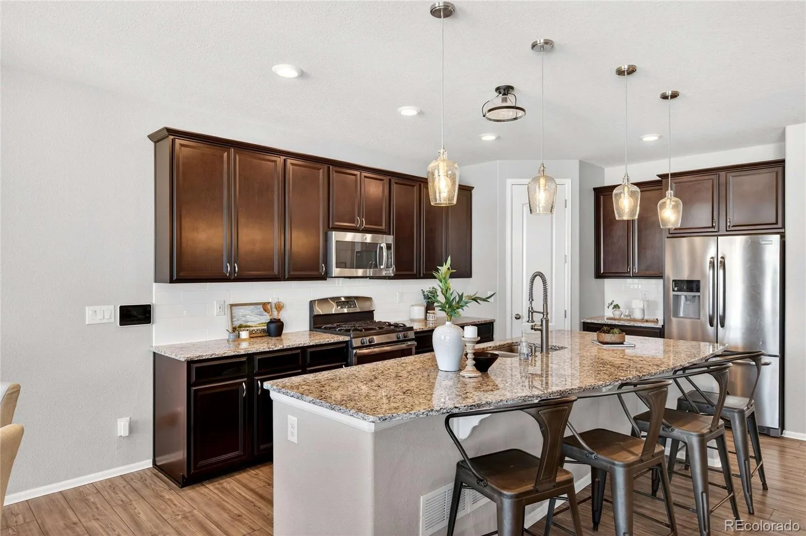 This beautiful 5-bedroom home truly has it all. From the moment you walk in, you’ll notice the attention to detail and all the high-end finishes. The main floor is designed with both comfort and entertaining in mind. The gourmet kitchen features a large center island with plenty of seating, a gas stove, stainless steel appliances, upgraded cabinets, granite countertops, and a roomy pantry. The dining area is perfect for hosting gatherings, and it opens seamlessly into the spacious great room—ideal for spending time with family and friends.