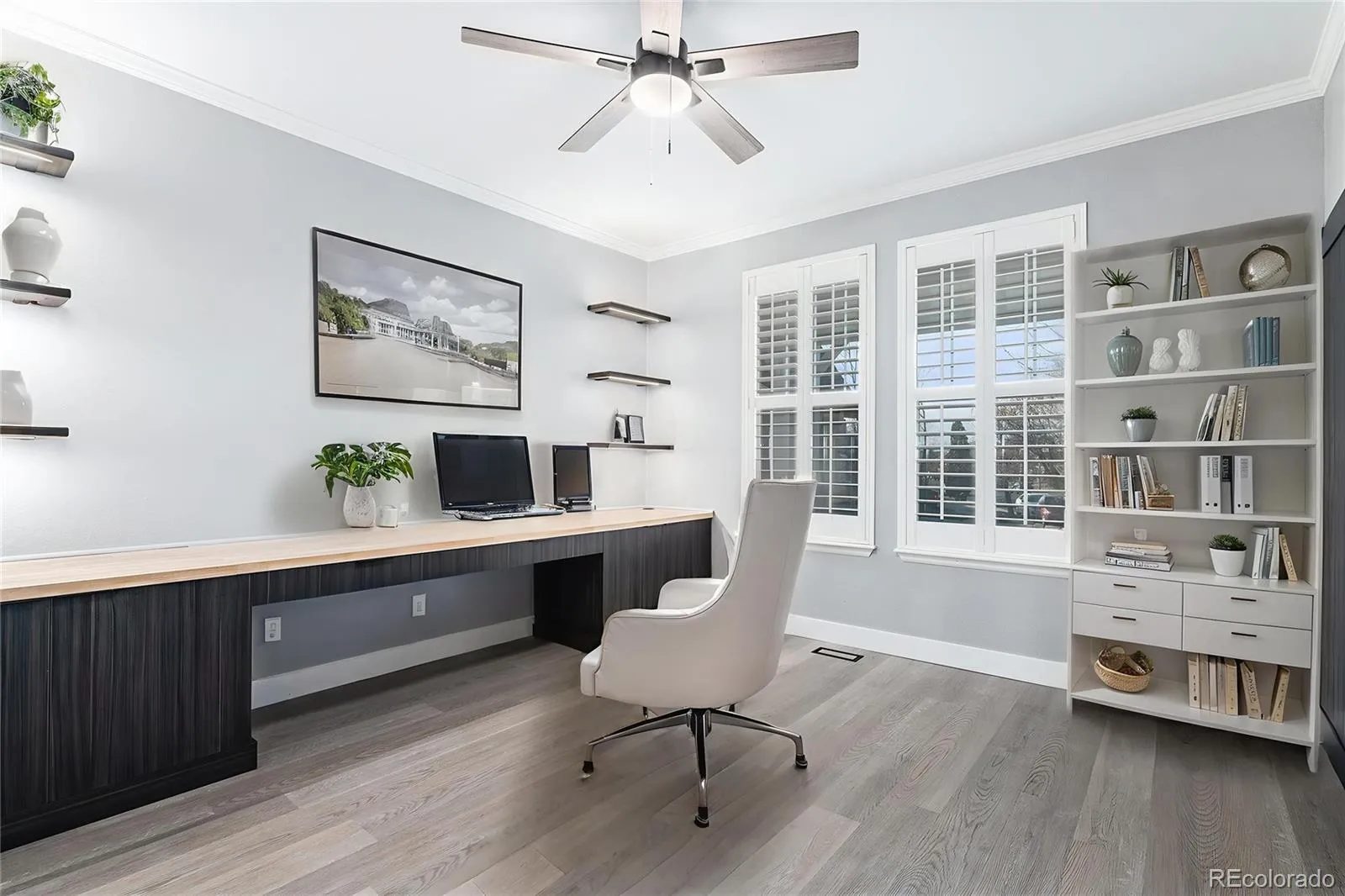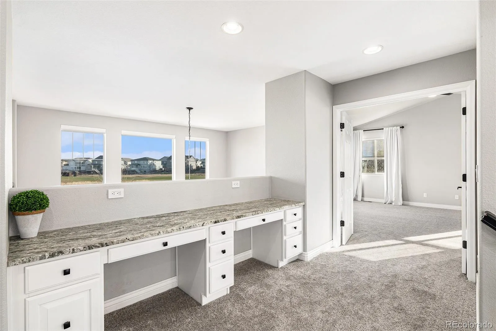 Welcome to this beautiful home offering generous living spaces and thoughtful design throughout. The large living room features soaring ceilings and a cozy fireplace, flowing seamlessly into a dedicated office and a modern kitchen complete with double ovens, bar seating, a massive pantry, and a butler’s pantry with an additional sink. The dining space connects effortlessly to the main living areas, while the upstairs loft and built-in hallway desks add extra versatility. The spacious primary bedroom includes balcony access and an ensuite bath with dual sinks, a soaking tub, a walk-in shower, and a stunning closet with built-in shelving. Two additional bedrooms upstairs provide added convenience.