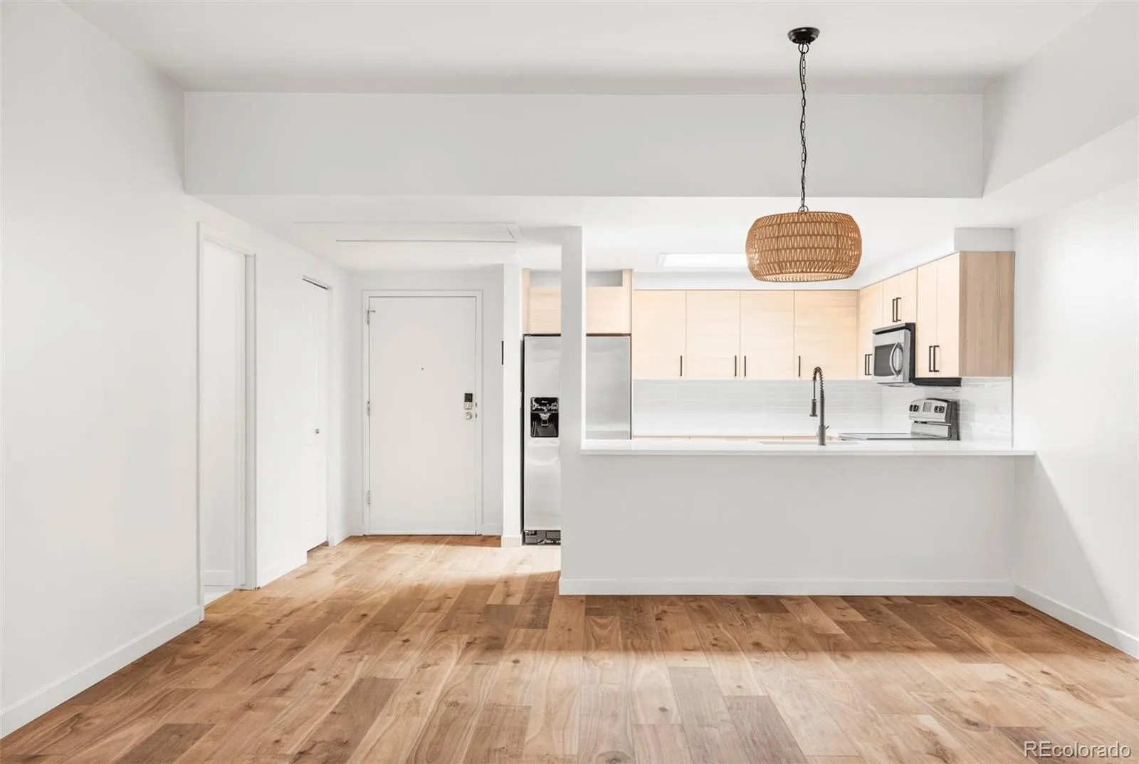 Urban convenience meets modern comfort in this beautifully updated residence, perfectly positioned in the heart of Speer. Located just a stone’s throw from the Cherry Creek Trail and moments from Washington Park, Cherry Creek and downtown, this fully remodeled condo offers seamless access to local cafés, restaurants and a charming pocket park right outside the front door. Fresh interior paint complements the bright, open-concept layout, where a spacious living room with a fireplace flows effortlessly to a private, fenced-in patio through sliding glass doors. The kitchen boasts stainless steel appliances, sleek cabinetry and a chic tiled backsplash, joined by an airy dining area with a stylish light fixture. A sizable bedroom is paired with a modern full bath featuring contemporary tile and finishes. Elevated high above street level and situated within a meticulously maintained building, this first-floor residence includes an in-unit stackable washer and dryer and an assigned garage space. Welcome Home.