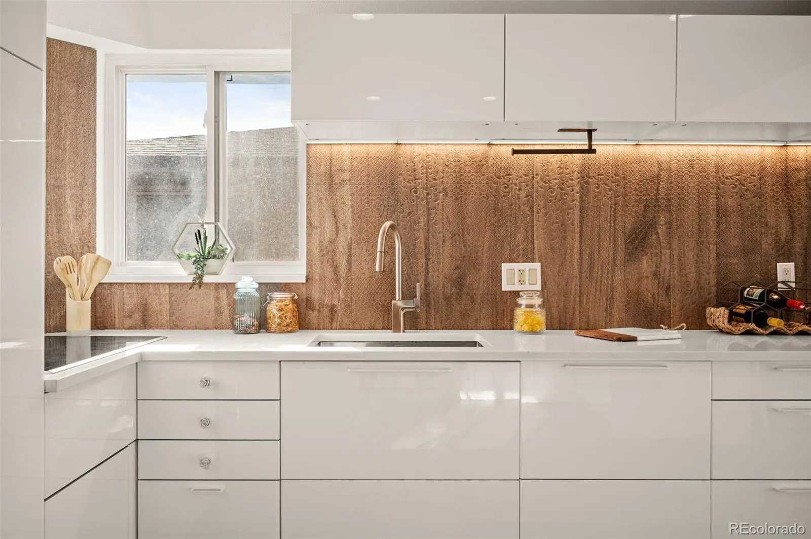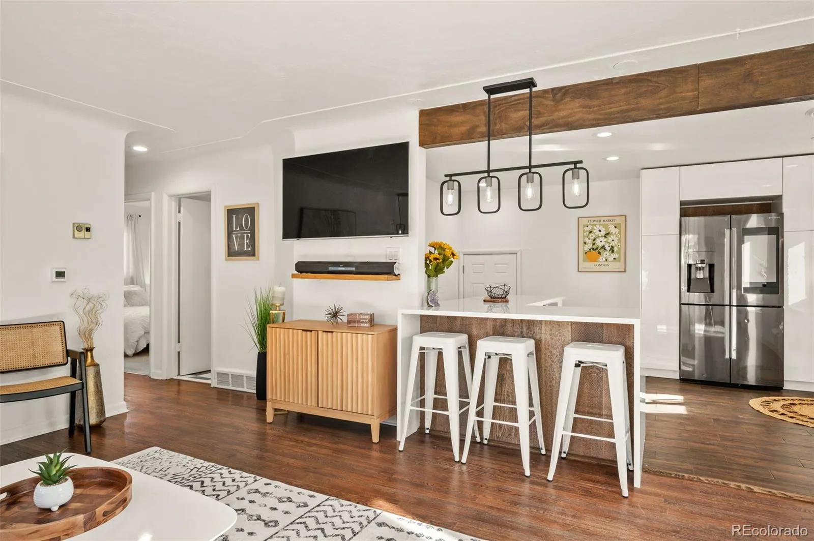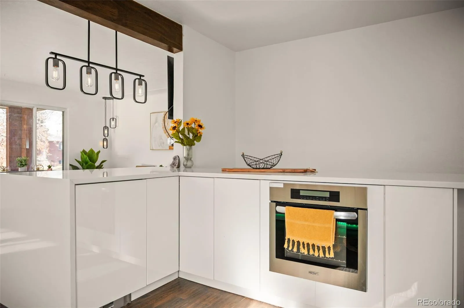 At the heart of the home is a fully remodeled contemporary kitchen, complete with sleek finishes, abundant cabinet storage, and a built-in toe-kick vacuum…a small but brilliant detail that makes everyday life easier.