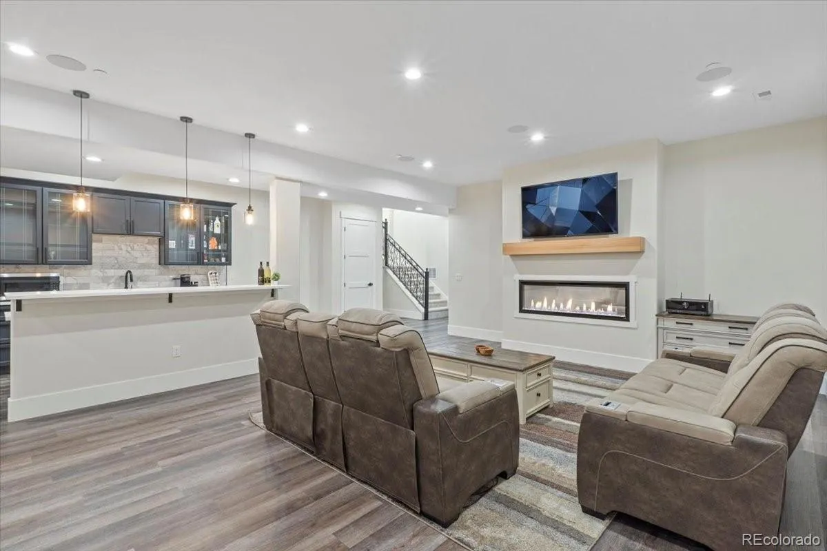 The finished basement offers two en suite bedrooms that flex as office, creative or guest space, plus a theater room, exercise area, open rec and game space with wet bar and storage. Surround sound is wired in the primary, main living room, lower living room, workout room and patio. Upgrades include a camera security system, fire suppression system, tankless water heater and two A/C units.