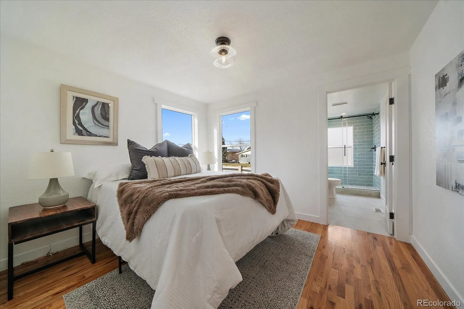 Dreamy modern farmhouse on rare, .5 acre divideable corner lot 1 mile west of Historic Olde Town Arvada. Unparalleled opportunity for development, investment, or long-term living in. The home has been thoughtfully renovated, blending turn-of-the-century charm with contemporary design. Newer windows flood the open-concept layout with sunlight. Curated details include an entirely reimagined floorplan with all newer lighting, hardware/fixtures, trim, paint and flooring. Sunny kitchen with eye-catching backsplash & quartz countertops. Two main floor bedrooms including a primary w/ stunning en suite bath w/ oversized walk-in shower highlighted by sleek blue-hued subway tile. Updated full hall bath serves the 2nd bedroom and is perfect for entertaining guests. Main floor also features an oversized living & entertaining space with access to the entry and side patio area and dining area. Versatile finished basement provides bonus living space—perfect for a media room, home office or fitness area — offering even more room to grow. You’ll also find a 3rd bedroom (non-conforming as lacks closet) and accompanying ¾ updated bath alongside the laundry area + a large crawl space. Expansive covered rear patio is perfect for 3 season entertaining. The home also features a 20’ x 30’ detached, heated 2 car garage with 220 – a great option for homeowners seeking a dedicated shop. Size allows for the lot to be divided, if preferred, or just enjoy the perfect canvas to build your dream home while living in the existing residence (ADU perhaps?), add your ideal garage/shop, or craft the outdoor oasis you’ve always envisioned – ditch water rights keep exterior watering costs to a minimum. Whether you’re seeking a prime site to build, an updated historic home to put down roots, or an investment property with short- or long-term rental potential, this one checks the boxes and sits nearby Arvada’s hub of boutique shopping, dining, breweries, wineries, and year-round community events.