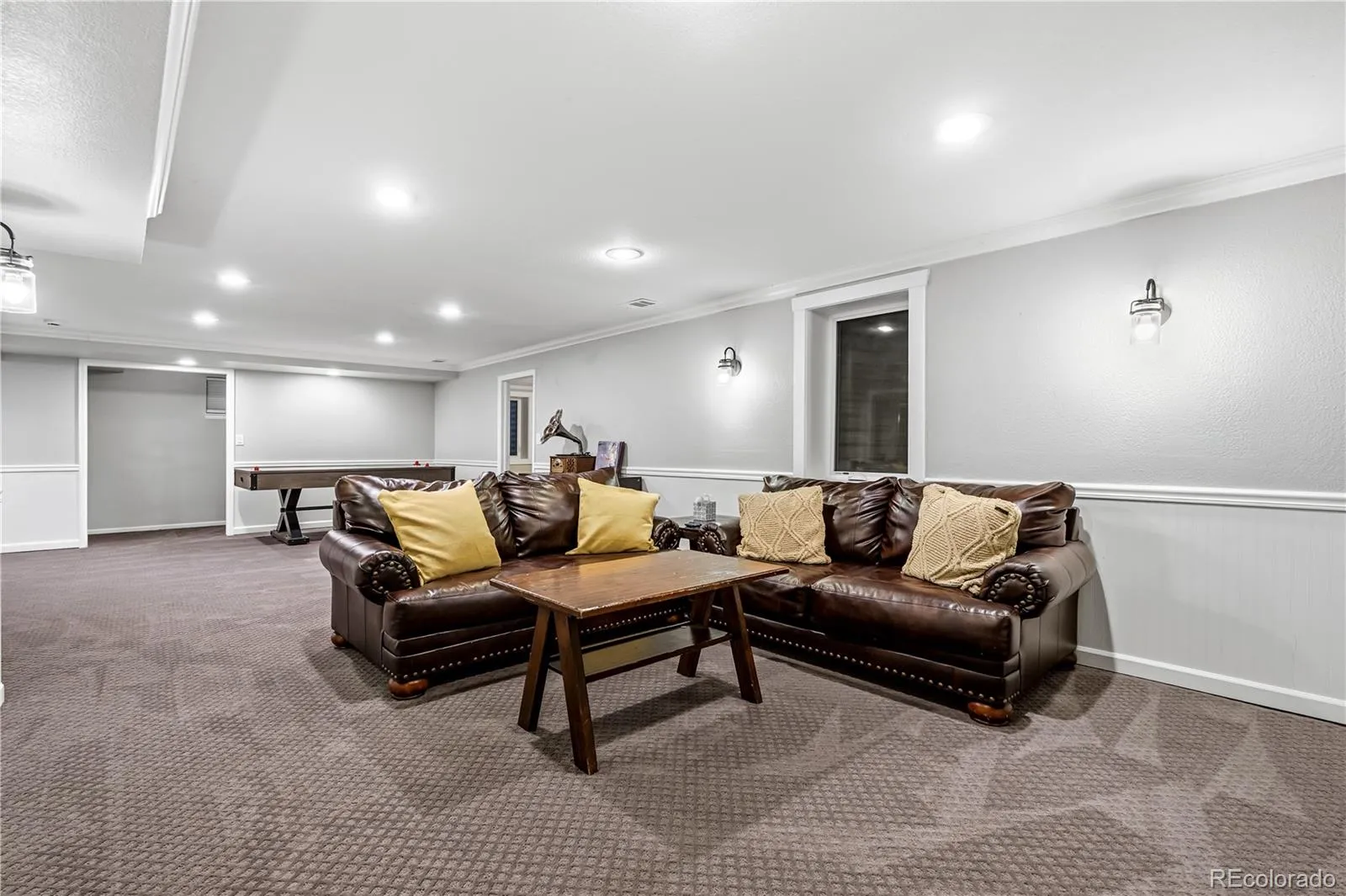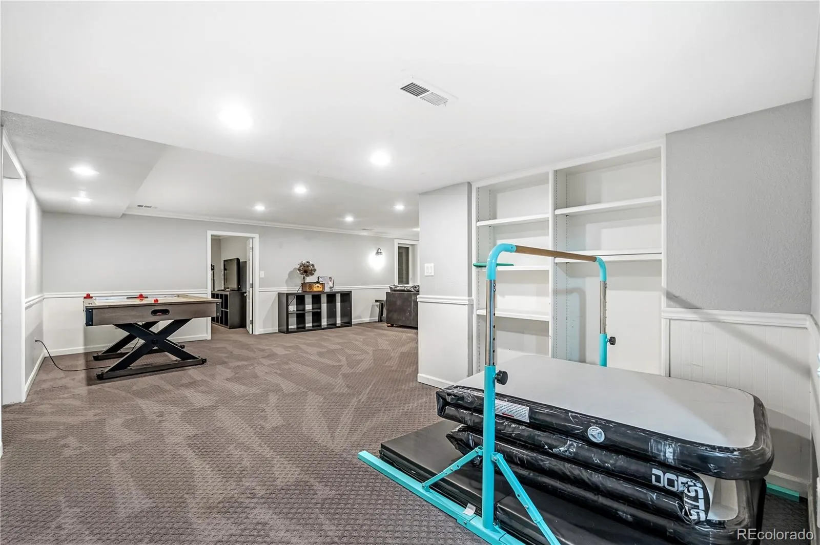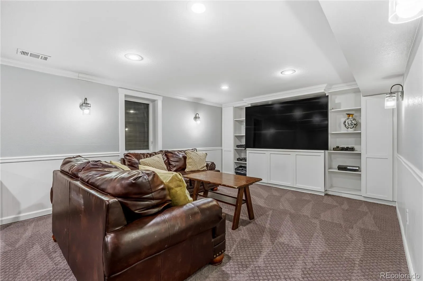 The finished basement offers a large media room with built-ins, guest bedroom with walk-in closet, and ample storage—ideal for movie nights or relaxation.