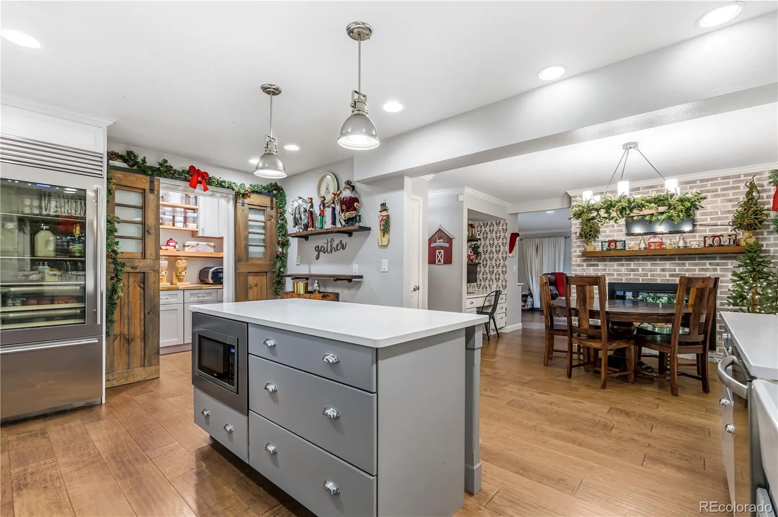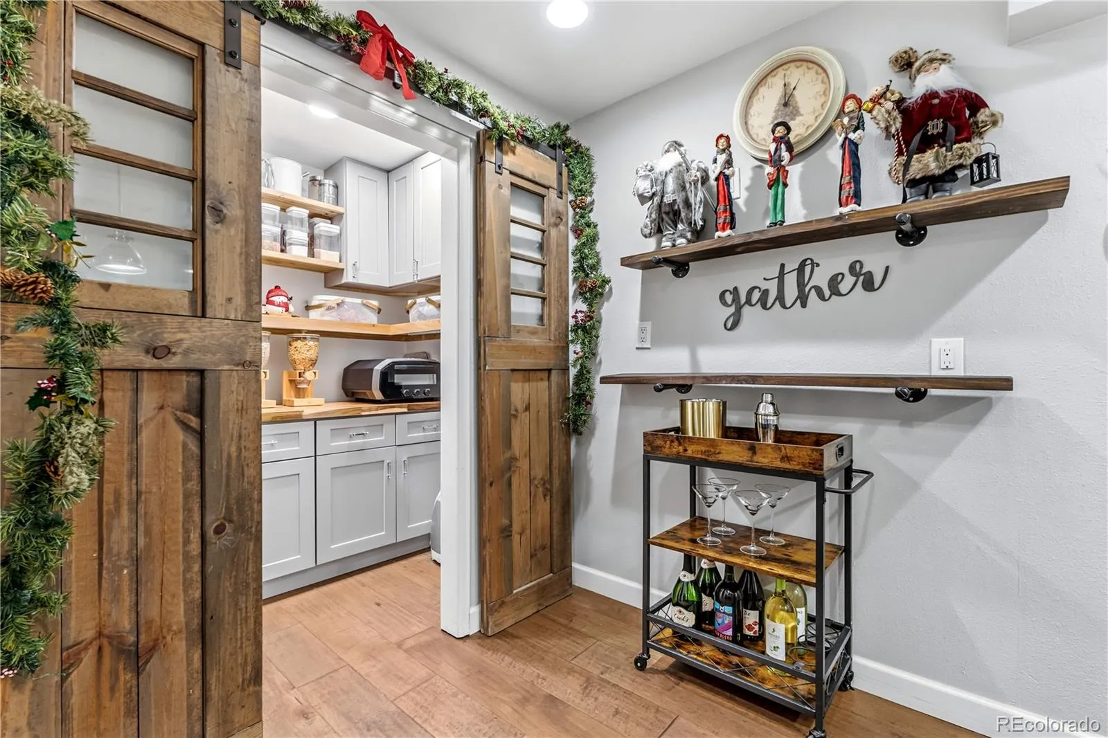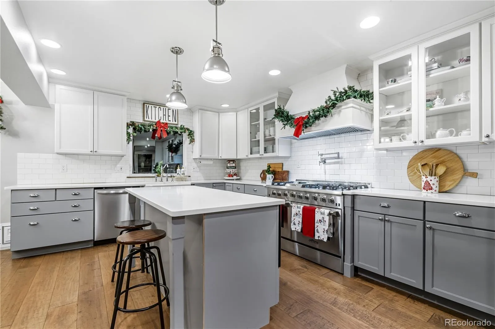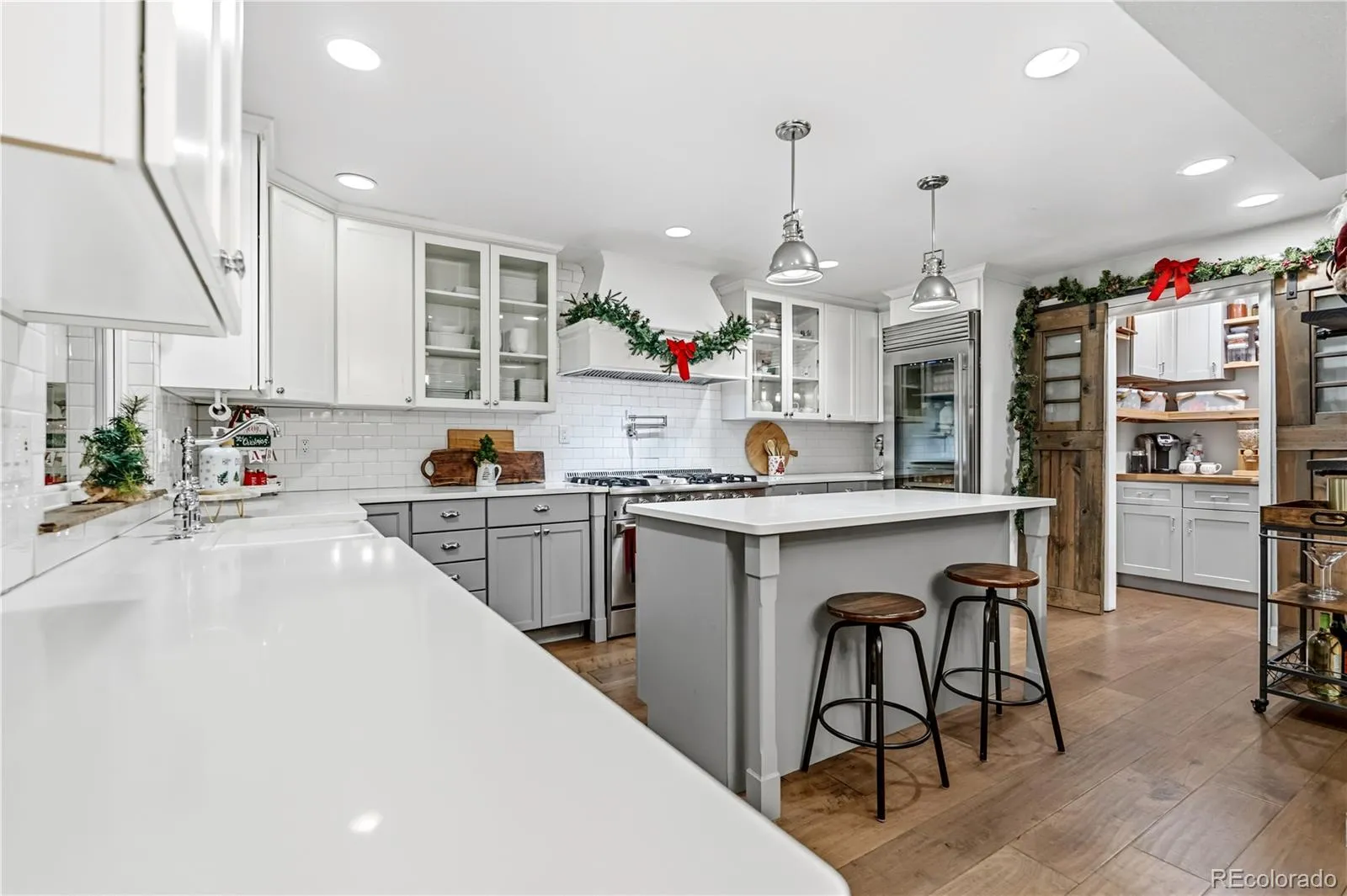 The gourmet eat-in kitchen features sleek two-tone cabinetry, a large quartz island, stainless steel appliances, a Thor gas range, and a striking designer hood. Enjoy a charming wine bar/coffee station for morning lattes or evening pours. The open layout flows into the elegant dining room and cozy living area with a brick hearth. A vaulted home office, spacious mudroom, powder room, and walk-in pantry complete the main level.