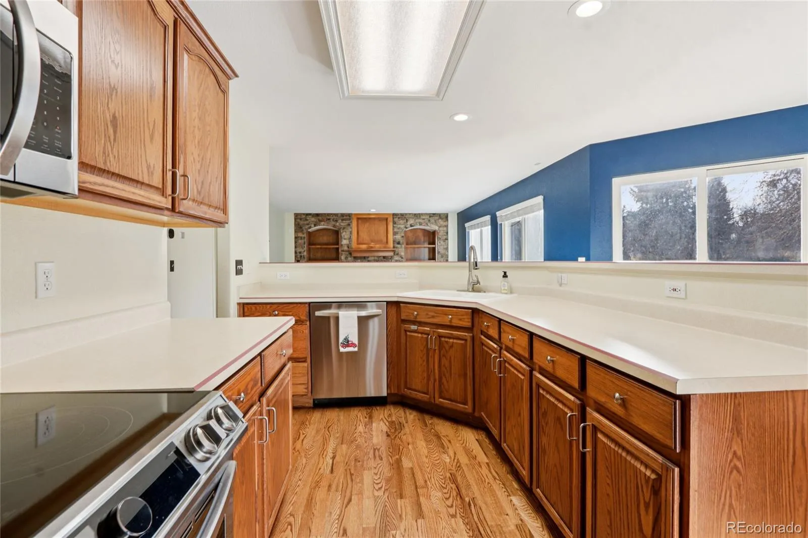 Continue into the open kitchen and eat-in area featuring stainless steel appliances, a breakfast bar, and views into the inviting family room, where a gas fireplace and built-in shelving create a warm gathering space. The main floor also offers a convenient laundry room with garage access and a half bath.